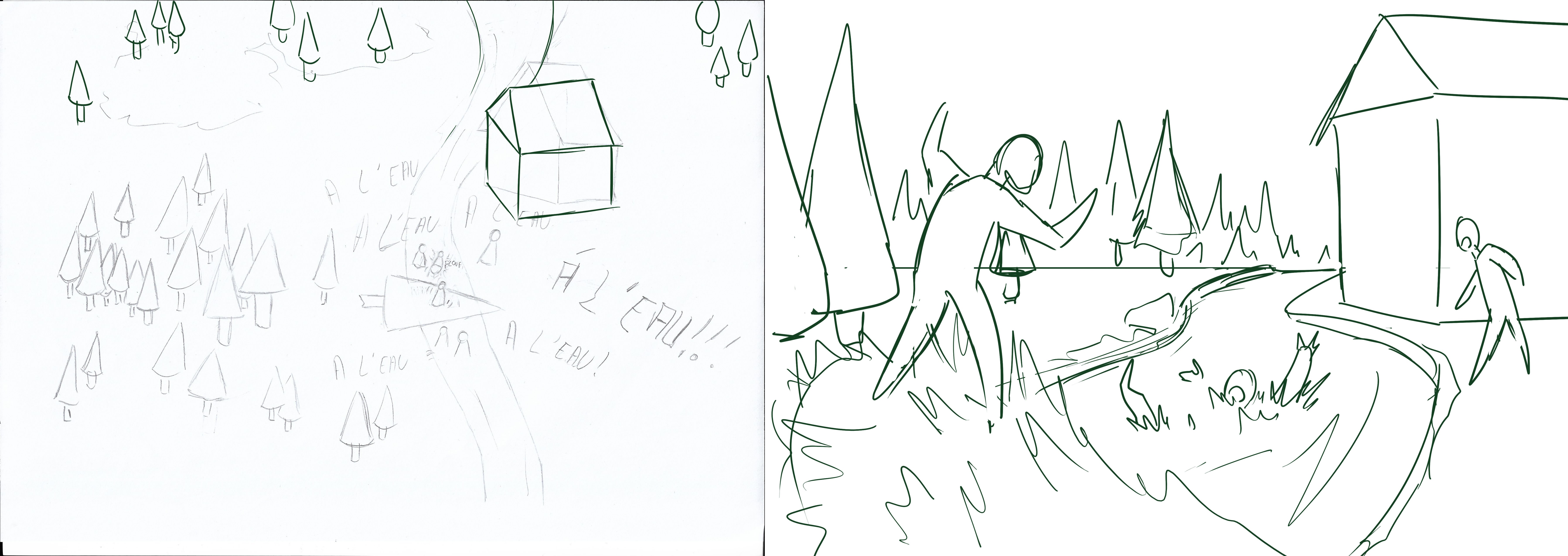 Attention aussi aux échelles, sur tes deux pochades tu as des petits soucis à ce niveau. Sur la première, la maison est très très grande ainsi que les personnages / ou tes arbres très très petits. Sur la deuxième, les personnages en train de descendre en rappel sont à la même taille que ceux tout en bas. Ce sont des détails, mais ça change beaucoup de choses ^^