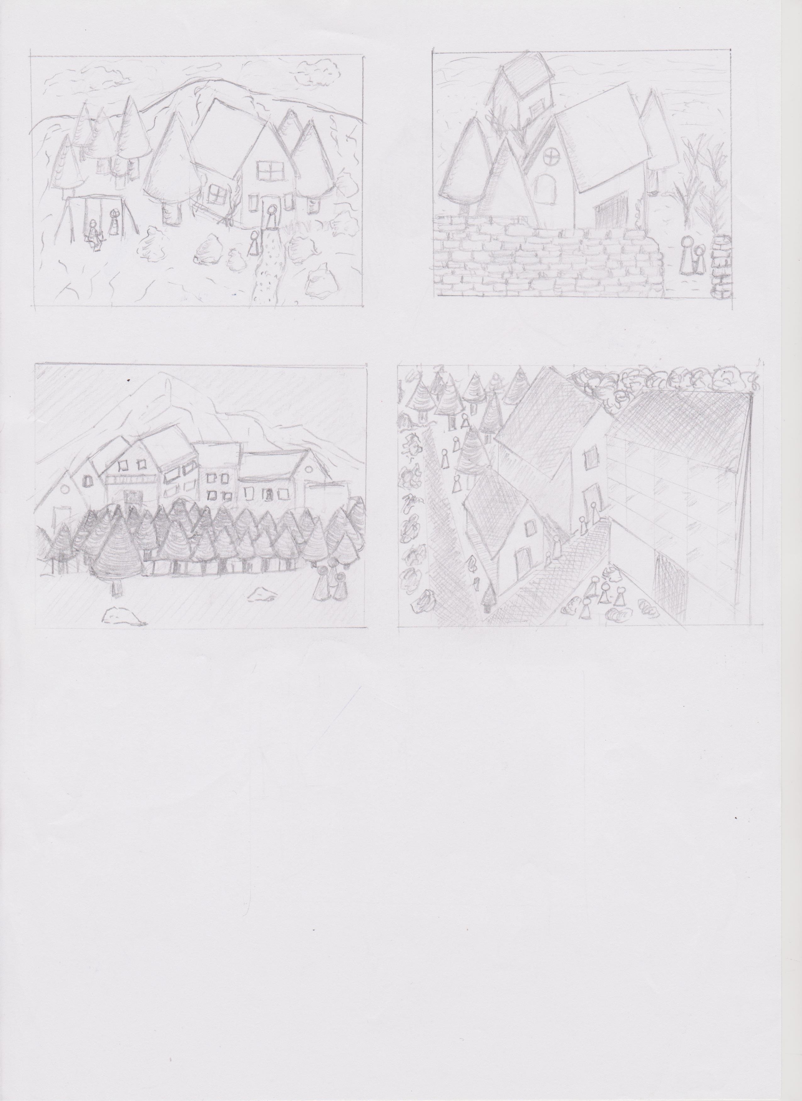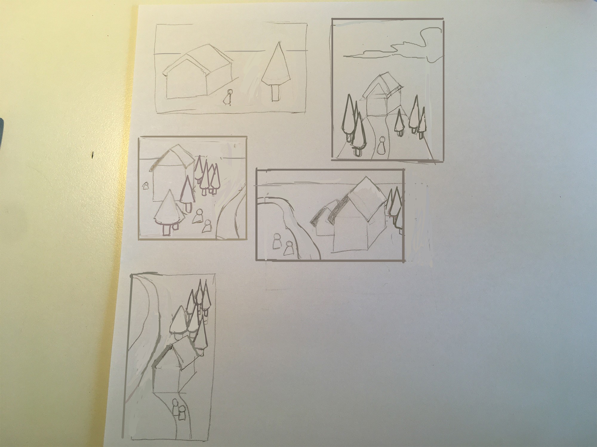 2. Attention à tes échelles entre tes éléments. Je pense en particulier à tes arbres qui sont très petits et épais, ce qui fausse un peu tout le reste. Même si ça reste du croquis rapide, c'est le genre de détail qui peut planter une compo.