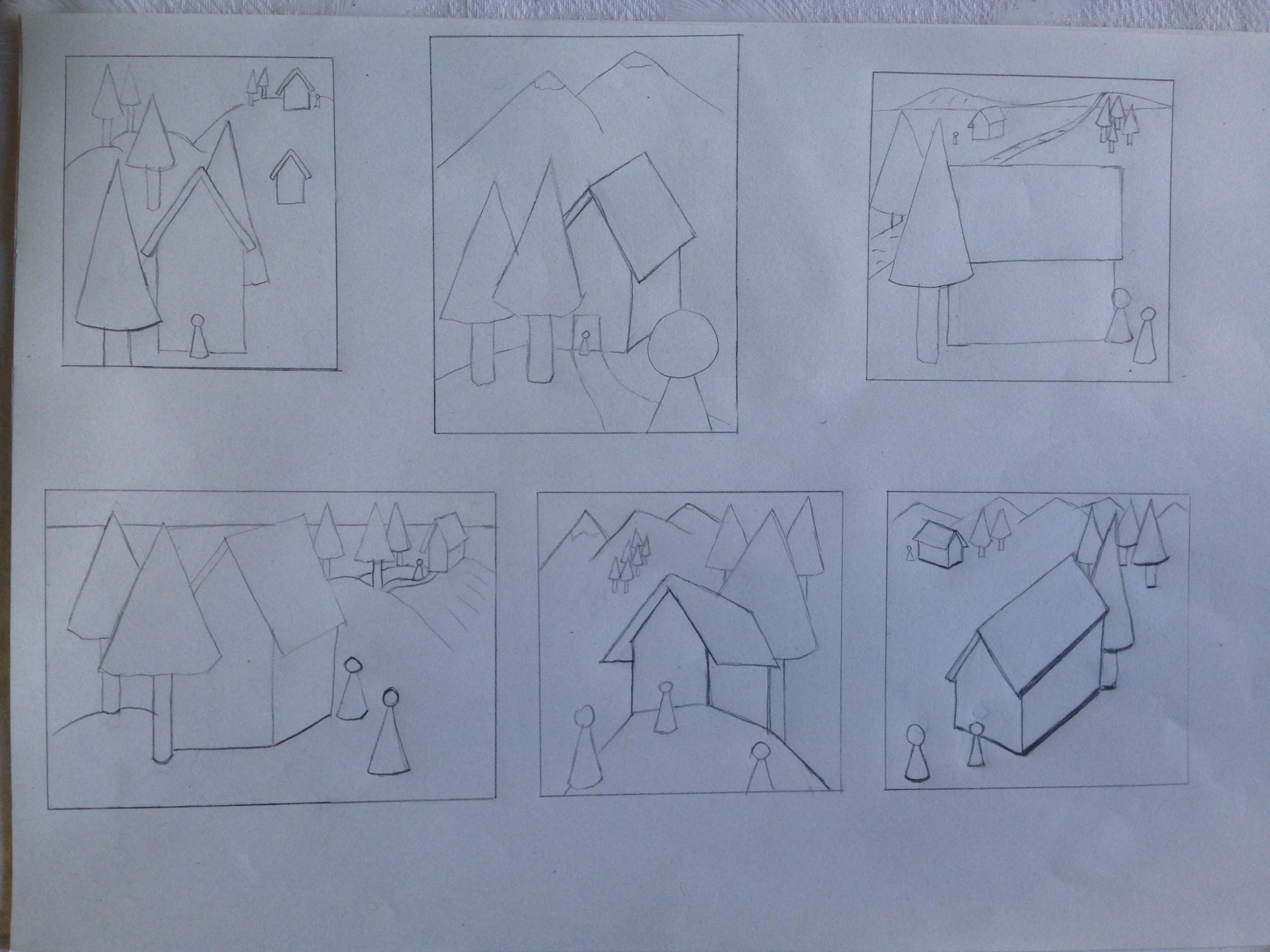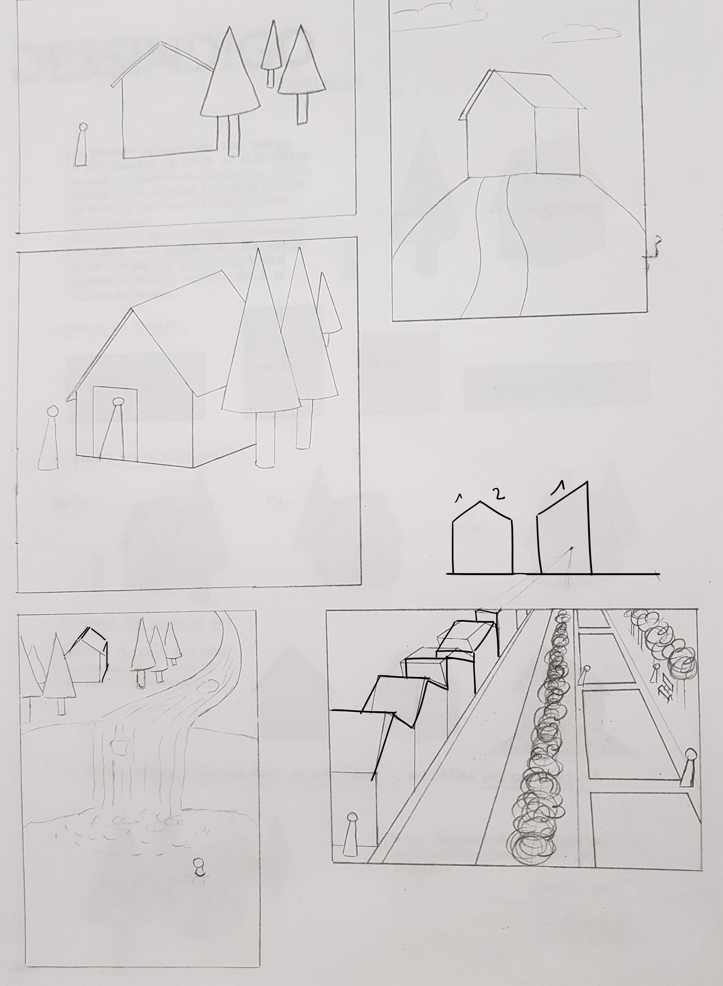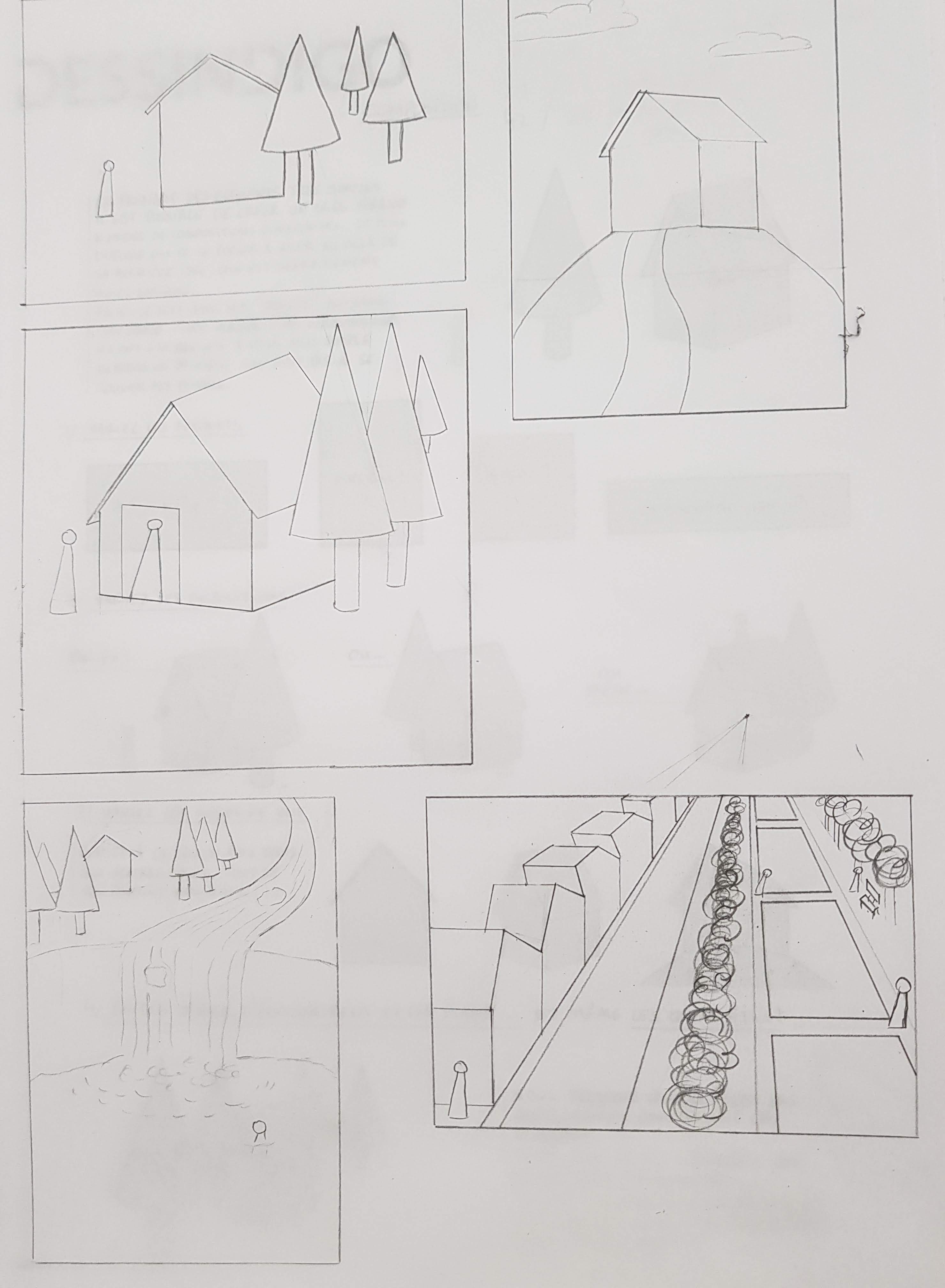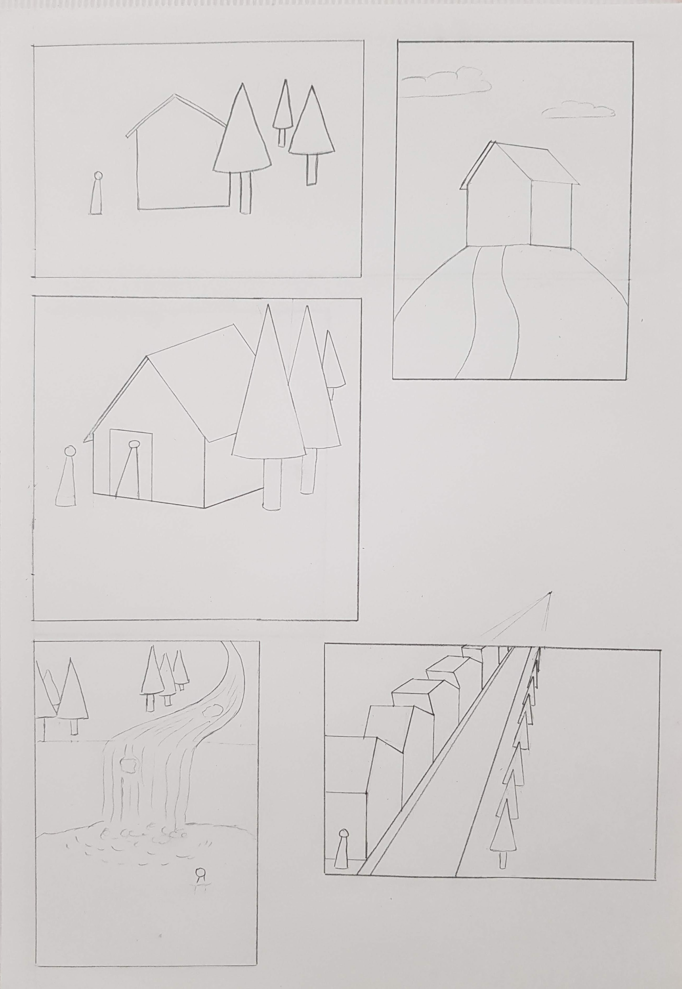 Retente l'exercice ^^ Certes tu as des éléments de base à placer, mais tu peux ajouter pleins d'autres choses autour. Essaye de me raconter une histoire avec chaque composition : quelle est cette maison ? Qui est ce personnage ? Est-ce une maison hantée et effrayante ? Une cabane de sorcière perdue au milieu des bois ? Une chaumière champêtre ? La villa d'un aristocrate ? Invente ce que tu veux, tant que tu utilises les éléments imposés :3 Et mets un cadre aussi, au début j'ai cru qu'il s'agissait d'une seule image.