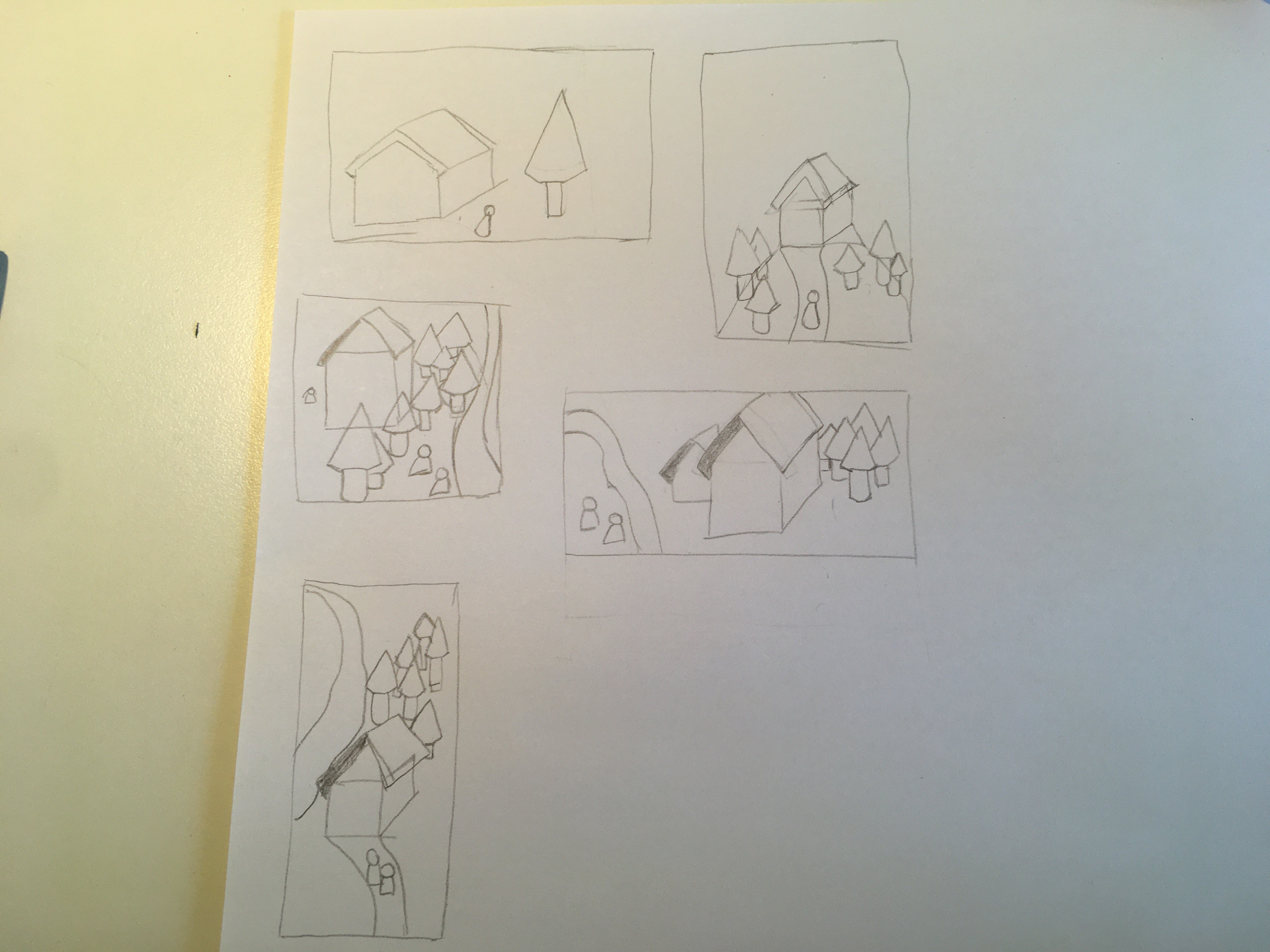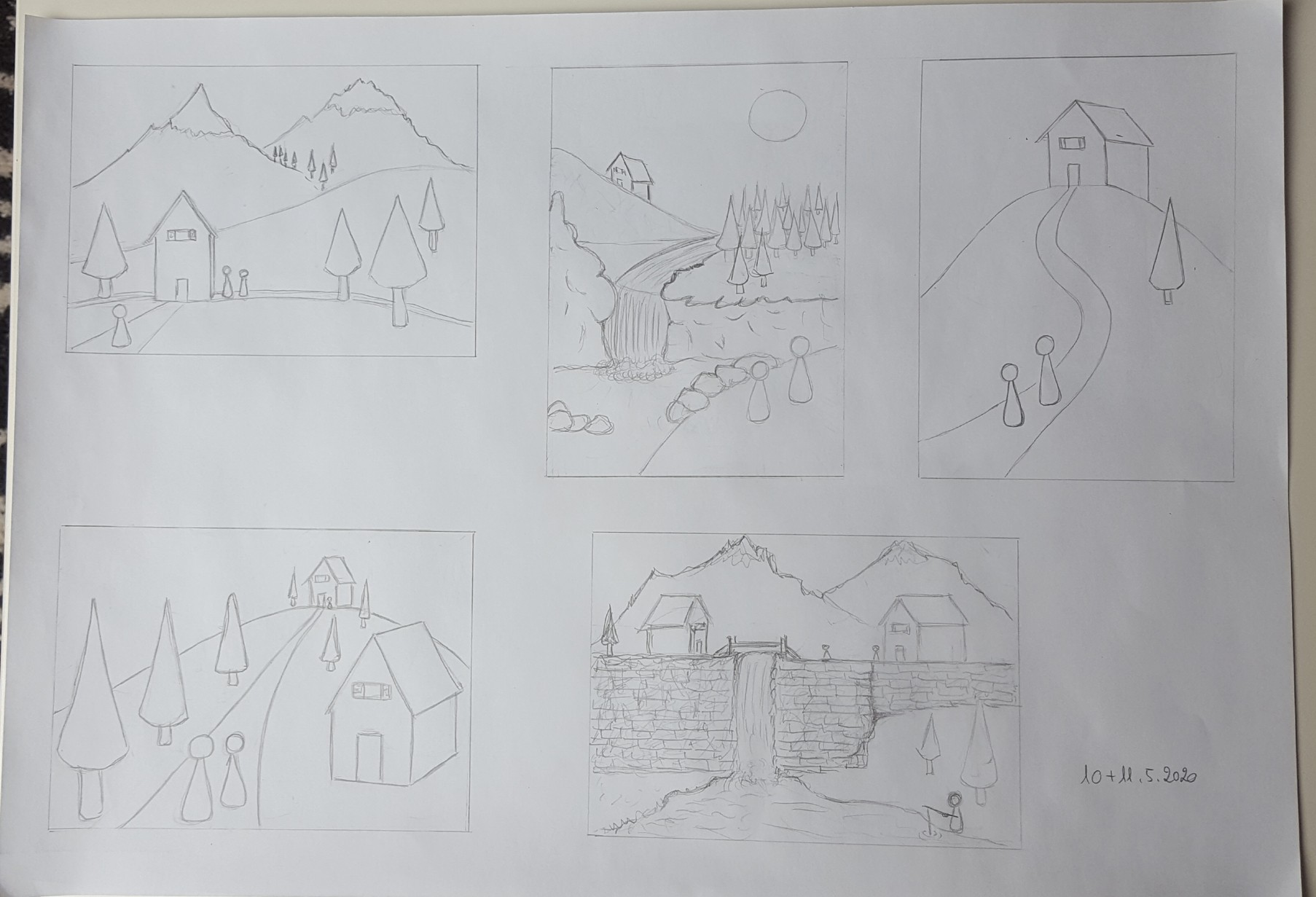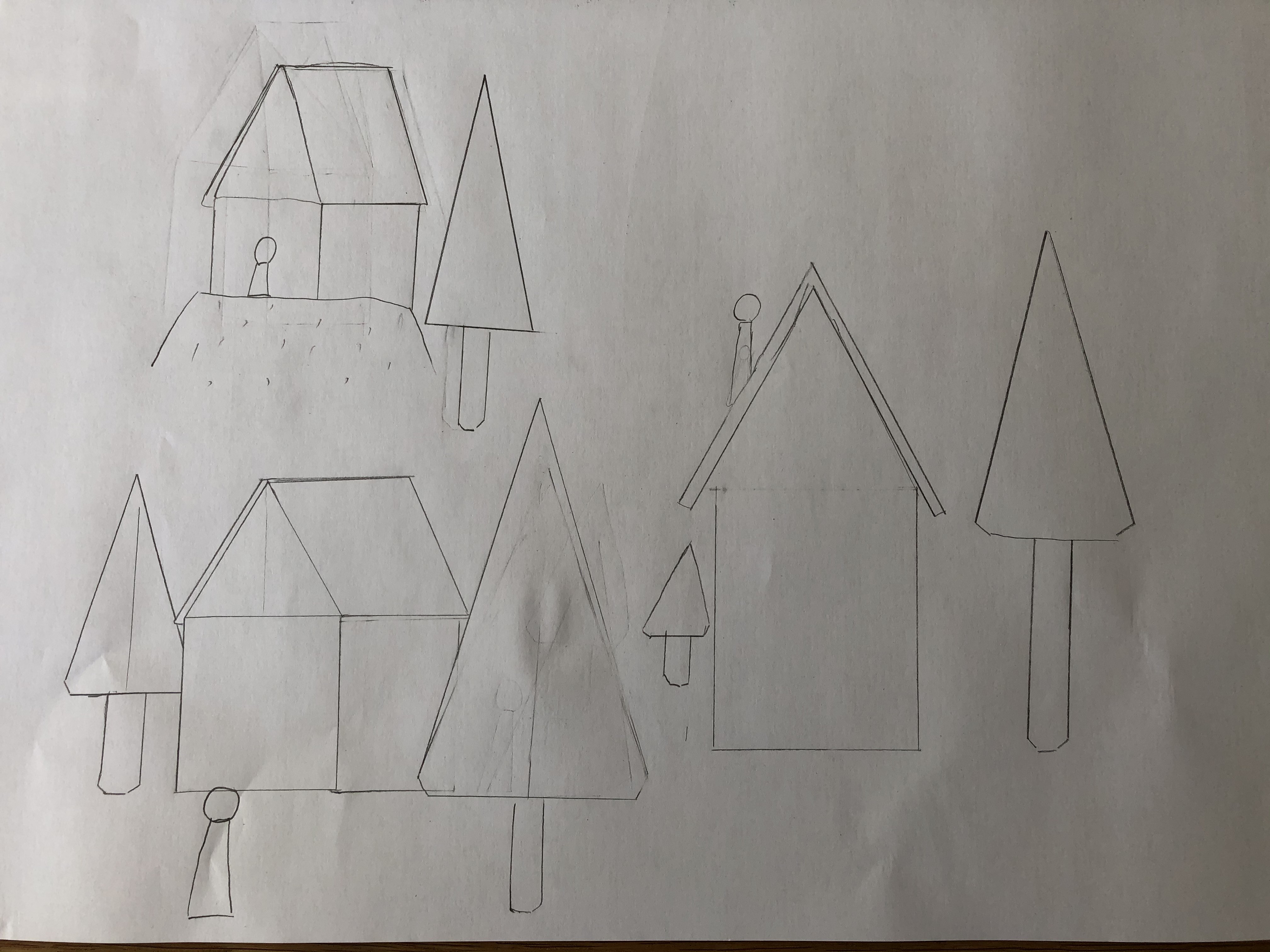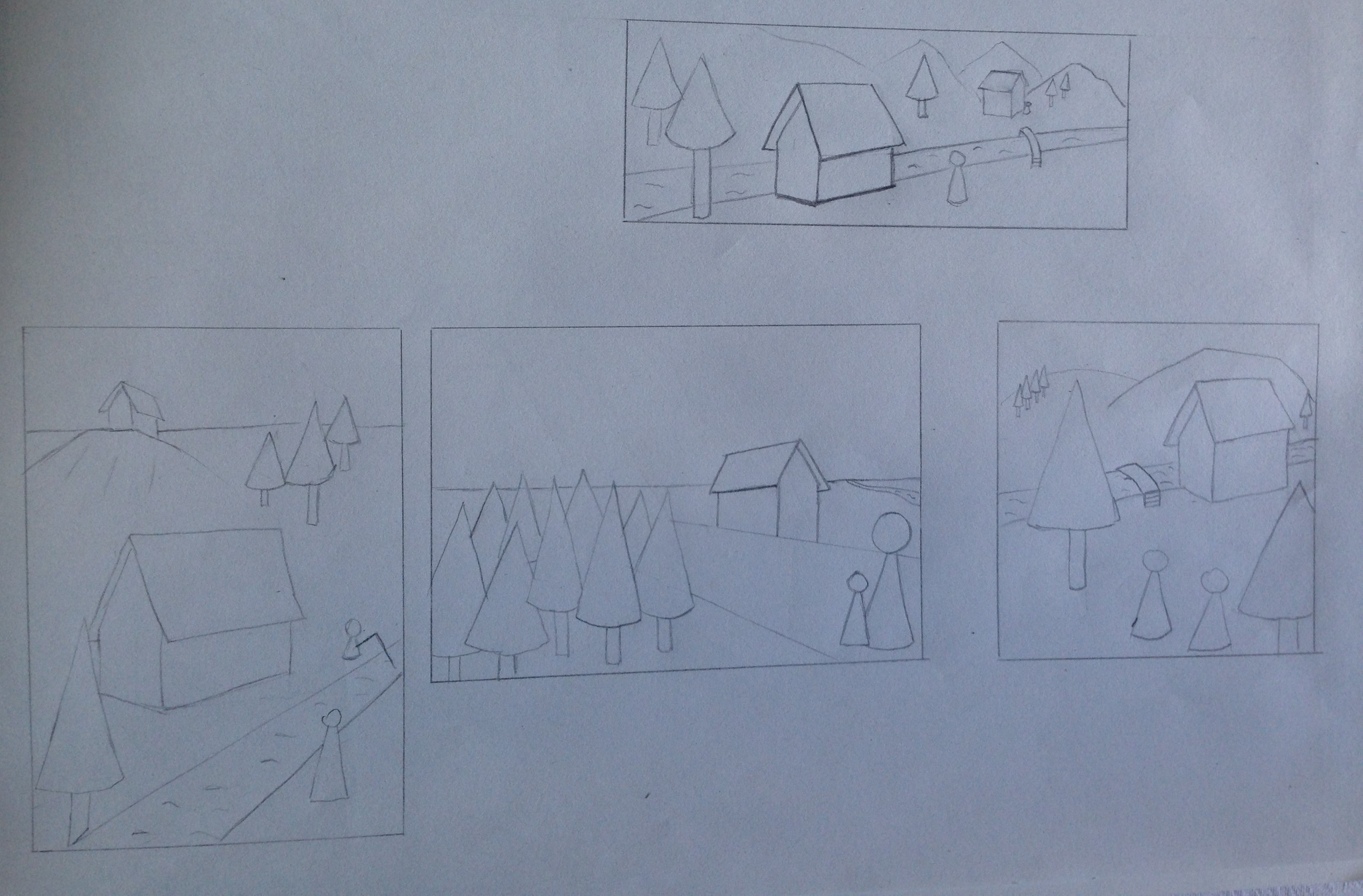 Retente l'exercice ^^ Certes tu as des éléments de base à placer, mais tu peux ajouter pleins d'autres choses autour. Essaye de me raconter une histoire avec chaque composition : quelle est cette maison ? Qui est ce personnage ? Est-ce une maison hantée et effrayante ? Une cabane de sorcière perdue au milieu des bois ? Une chaumière champêtre ? La villa d'un aristocrate ? Invente ce que tu veux, tant que tu utilises les éléments imposés :3 Et mets un cadre aussi, au début j'ai cru qu'il s'agissait d'une seule image.