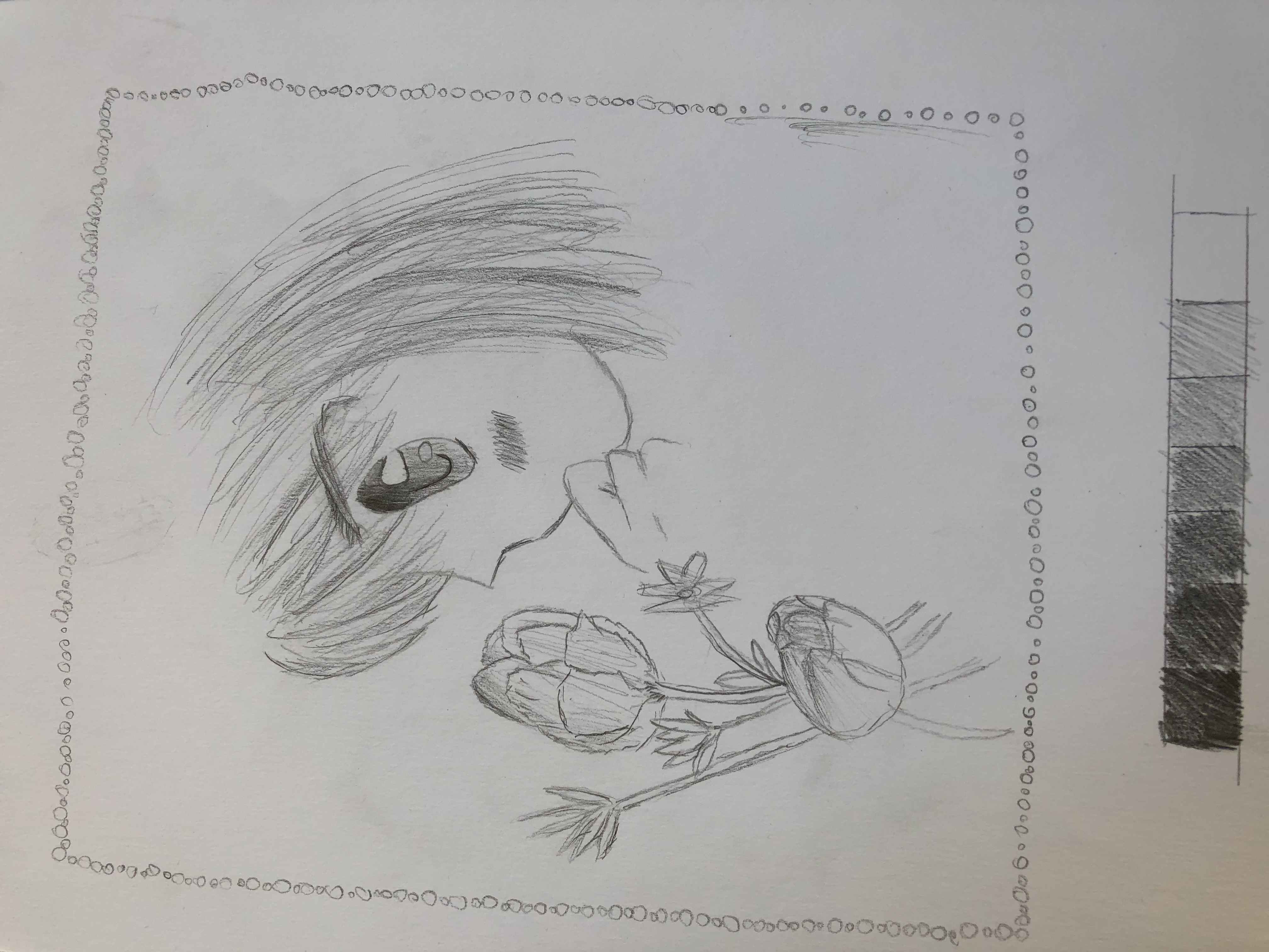 Joli dessin bien qu'un peu vide je trouve. Ça aurait été intéressant qu'elle tienne la fleur, ou qu'on voit un vase, qu'on voit les épaules de la demoiselle. En terme de compo, j'aurais rendu les fleurs moins présentes aussi pour qu'on reste plus concentré sur ton personnage. Ici tes fleurs font quasiment la même taille que ton personnage, du coup ça rentre en concurrence (avec le reste du corps tu n'aurais pas eu ce souci).