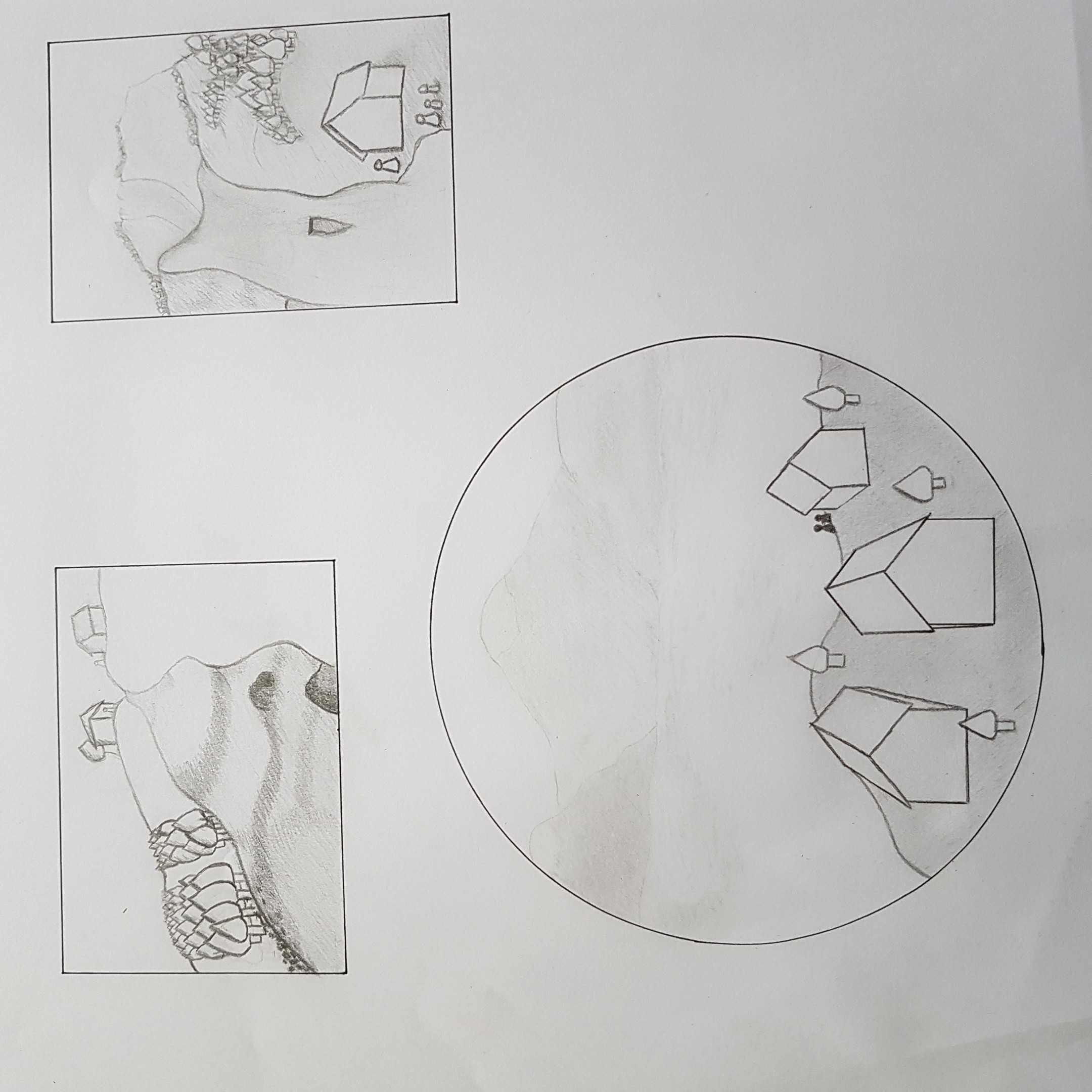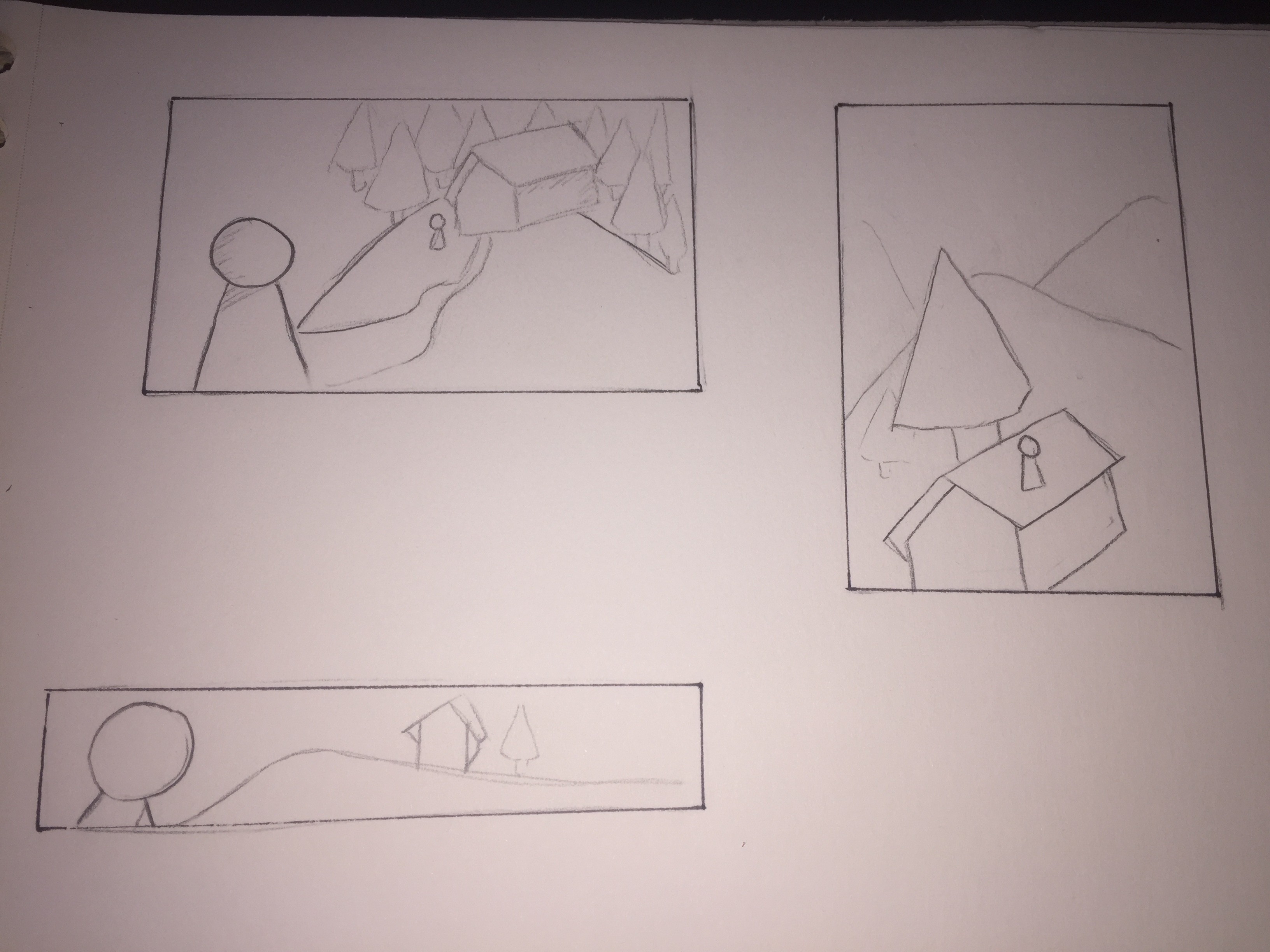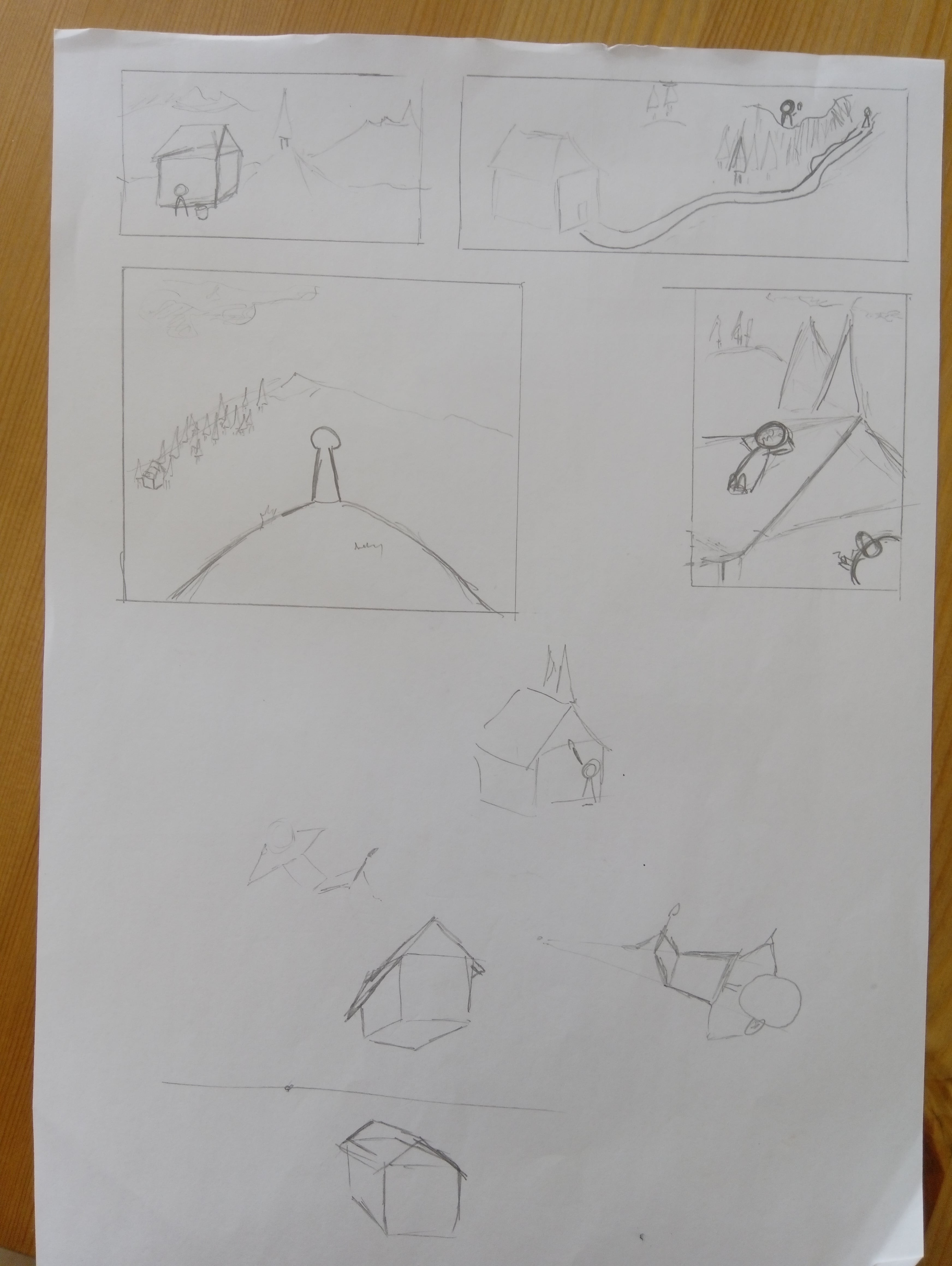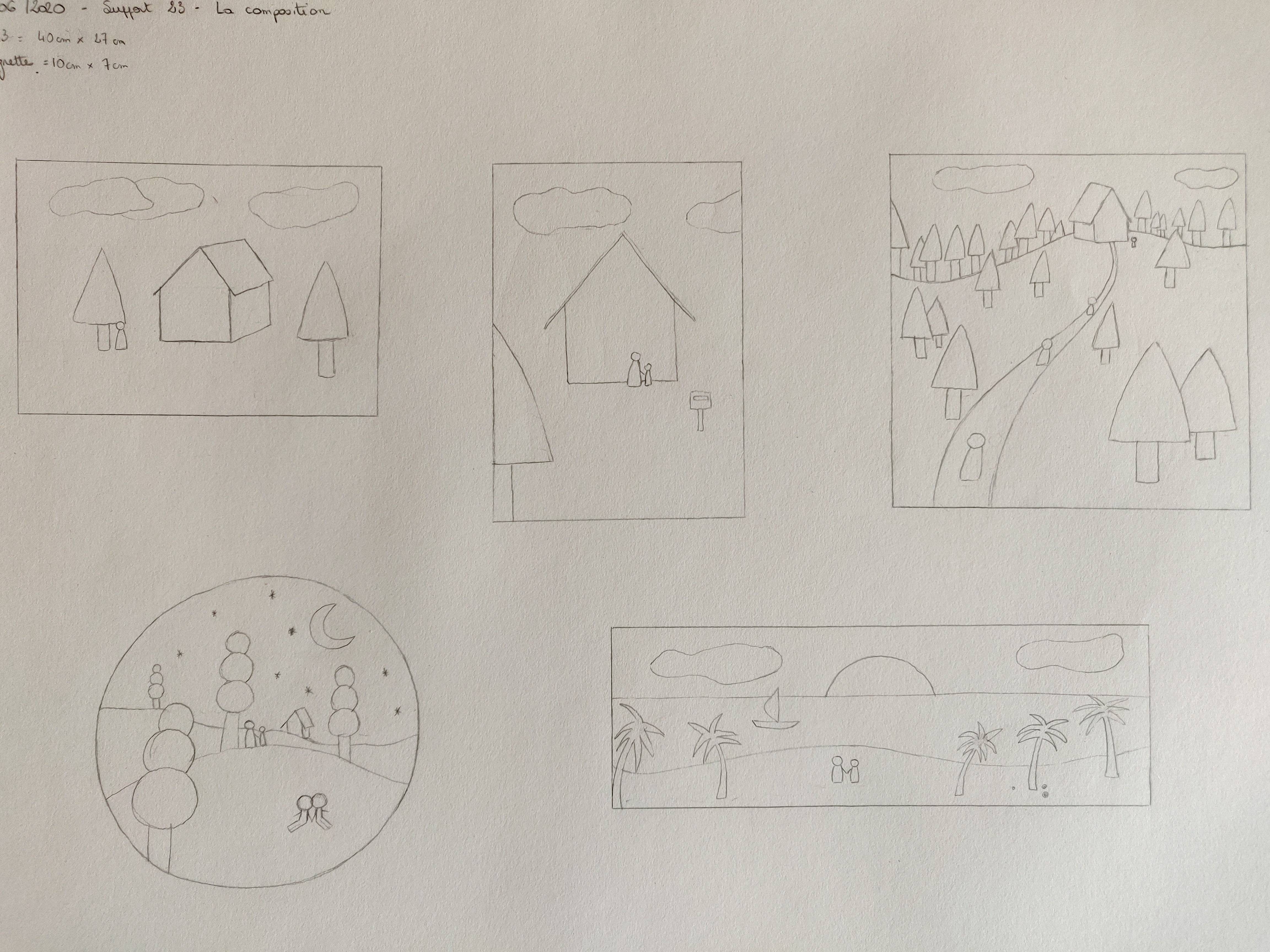Il y a de l'idée, mais ça pêche pas mal sur la perspective. Ta première image est pas mal, attention au chemin qui n'est pas très logique et renforce encore les problèmes de perspective de la maison (elle a une base droite et même inclinée vers la gauche, donc comment elle tient sur une colline bombée ?). La deuxième, tu as dégagé de l'espace en haut à droite et les lignes de la maison et ton personnage semblent conduire là-bas, donc on s'attend à y voir quelque chose (tu guides notre regard à cet endroit), mais il n'y a rien. Ajoute quelque chose, ça équilibrera toute l'image (un personnage ? une autre habitation ?). La dernière ressemble beaucoup à la première, avec à nouveau un problème de perspective qui nous donne du mal à comprendre comment se situe la maison par rapport au sol et où se situe le personnage par rapport au reste.
