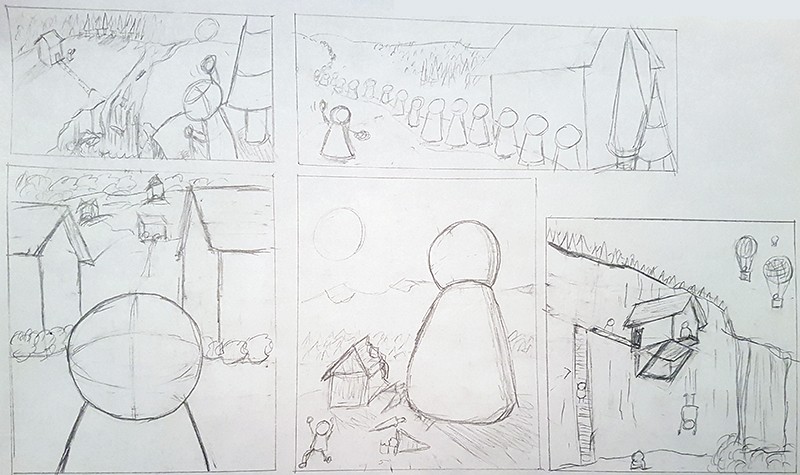 Tu as fait des images en aperspective (cf cours de Greg sur la perspective où il en parle ^^). Ça peut être un style, mais ici, je vois bien que ce n'est pas le cas. Donc, si tu composes ton image avec des éléments, tous seront soumis à la perspective. Ici tu as tes bâtiments de face comme si on les regardait frontalement avec le sol bien à plat, mais le sol et les routes sont vus de dessus, les personnages sont également vus de face, les collines sont de face aussi. Et parfois, tu as de la perspective, comme ta maison dans la première vignette vue de 3/4 dessus. Ça ne peut pas marcher. Trace une ligne d'horizon si tu en as besoin et retente l'exercice ^^