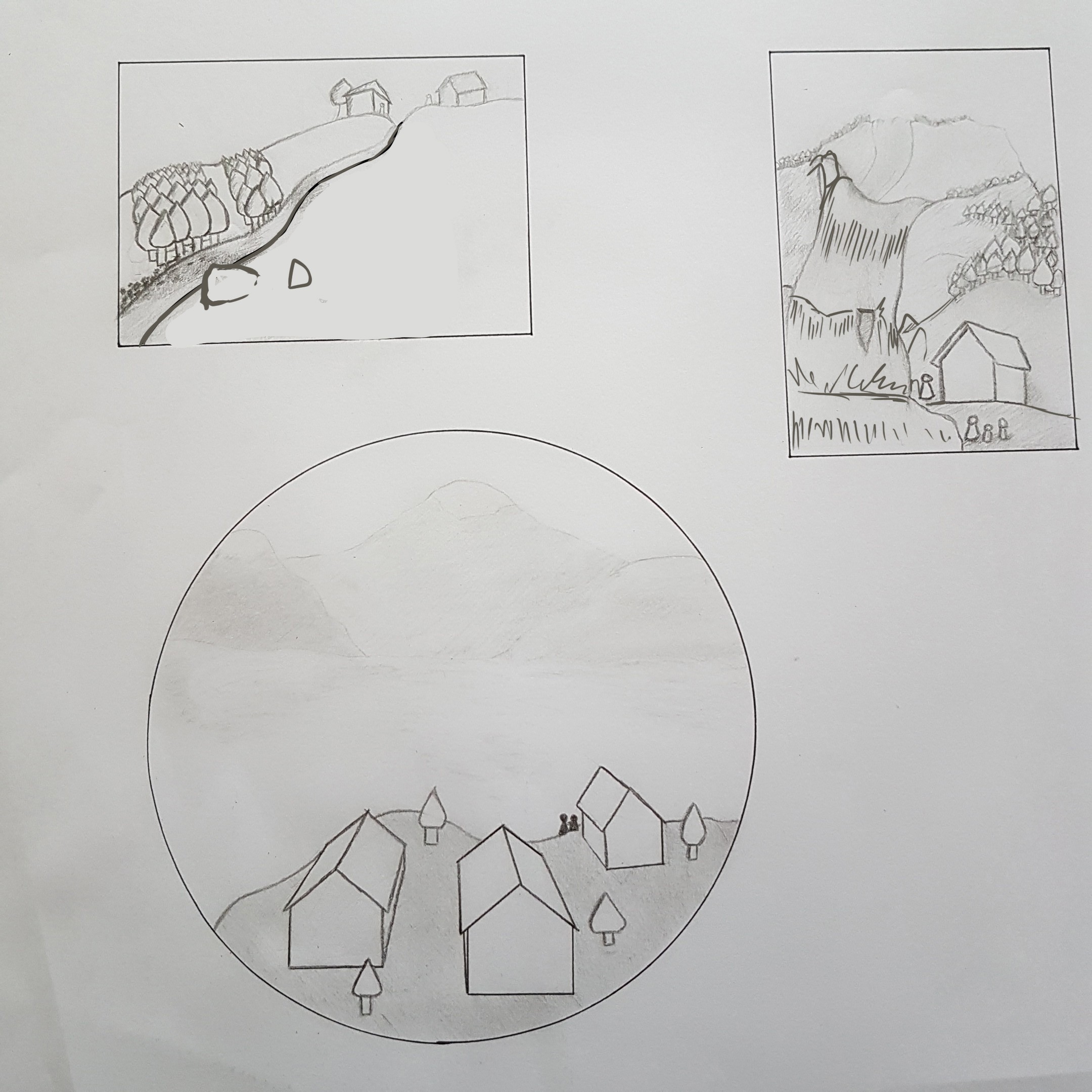 La dernière est 👍. La première est pas mal, mais l'agrandissement de la rivière est complètement incohérent par rapport au reste (les arbres devrait augmenter de taille de manière similaire par exemple) et si la rivière est si large, quand on regarde la taille qu'elle a entre les maisons, alors les maisons sont absolument gigantesques par comparaison. Donc problème d'échelle sur cette compo. Sur la deuxième, l'idée est cool, mais un peu compliquée à dessiner et c'est ce qui a pêché, ici c'est un problème de construction? Ta maison est posée bien à plat, la ligne d'horizon est proche de sa base, mais on a cette rivière qui vient de loin (puisque sur la colline avec les arbres en tout petit), mais à peu près aussi large partout, ce qui donne l'impression que ce serait une cascade ? qui qui continue à descendre en pente alors que la maison est posée sur un sol plat. Bref, pleins de petites incohérences comme ça qui font que l'image ne fonctionne pas.