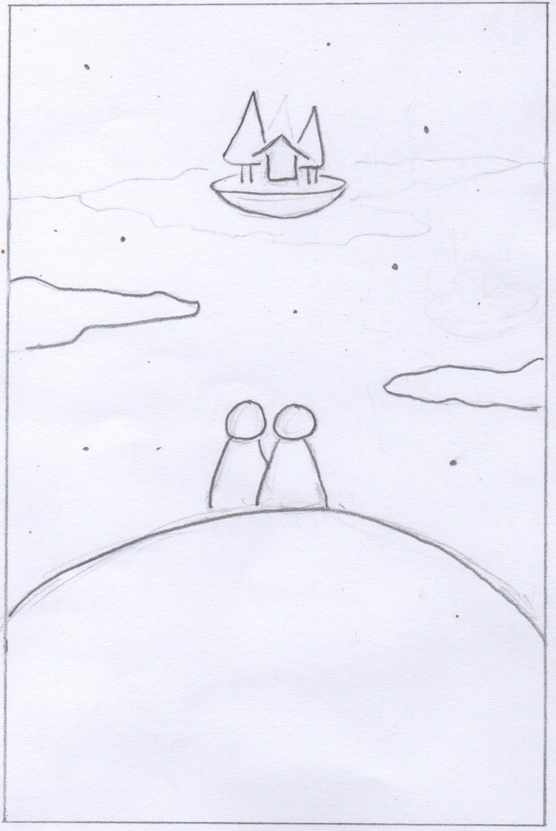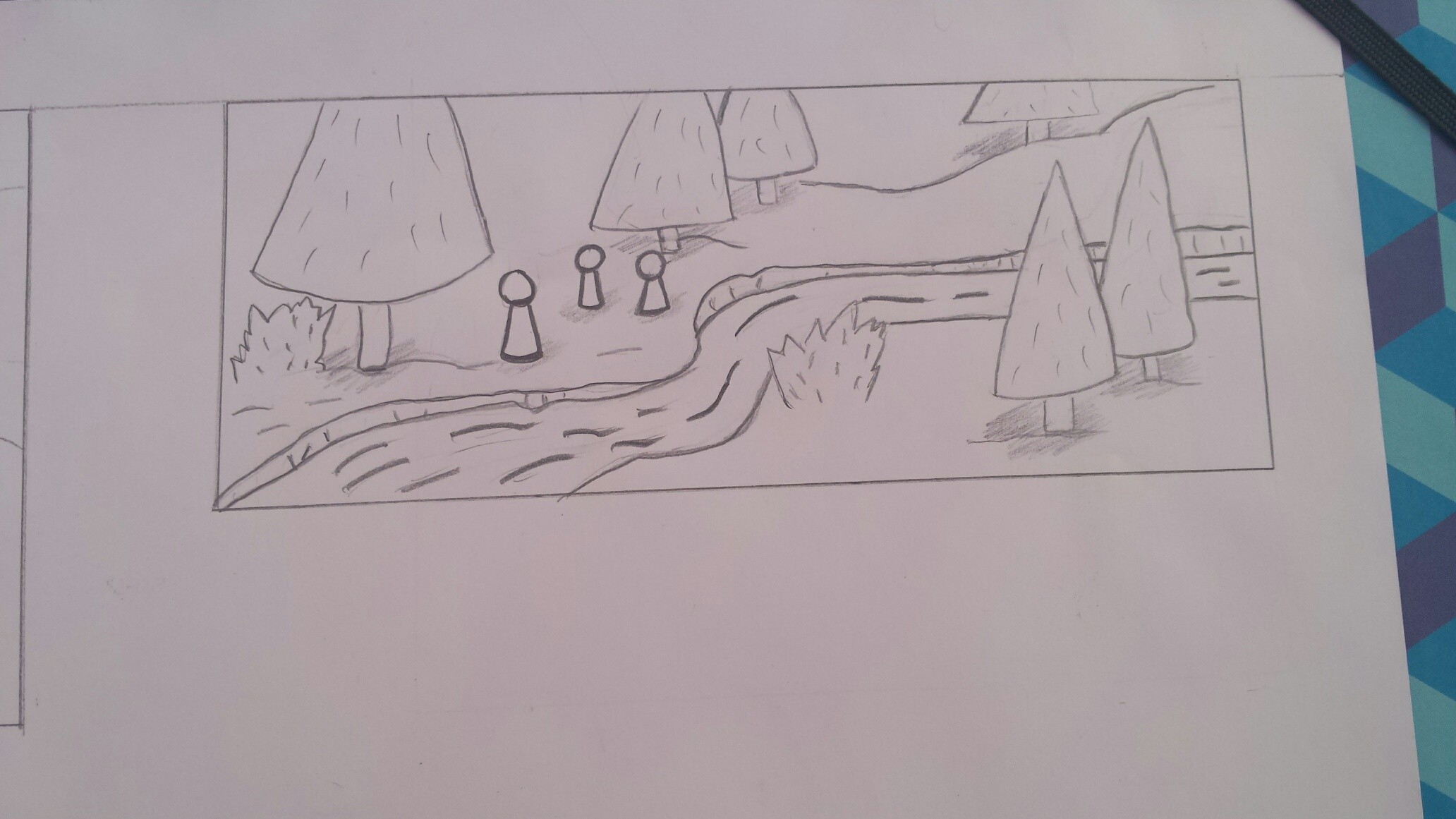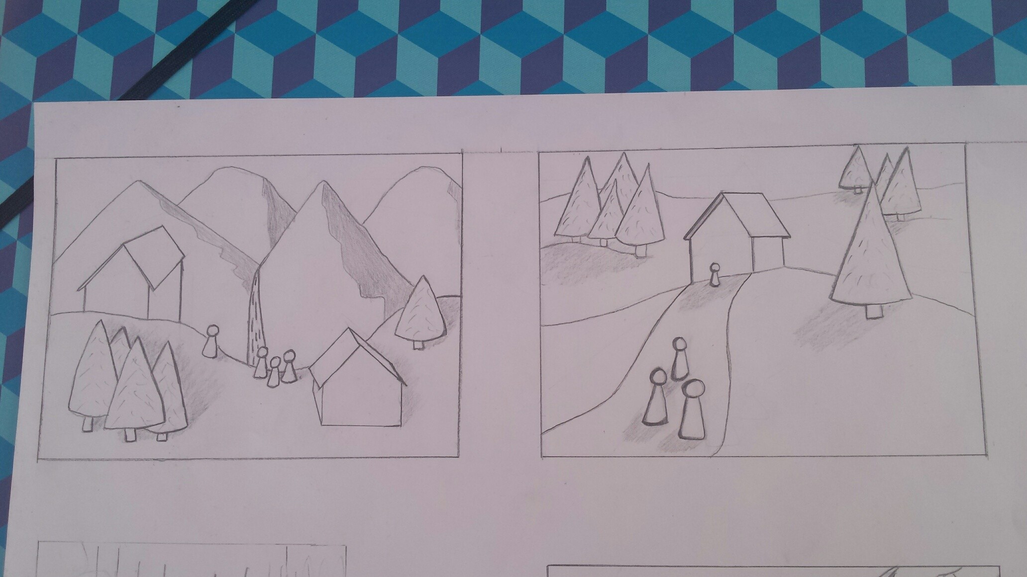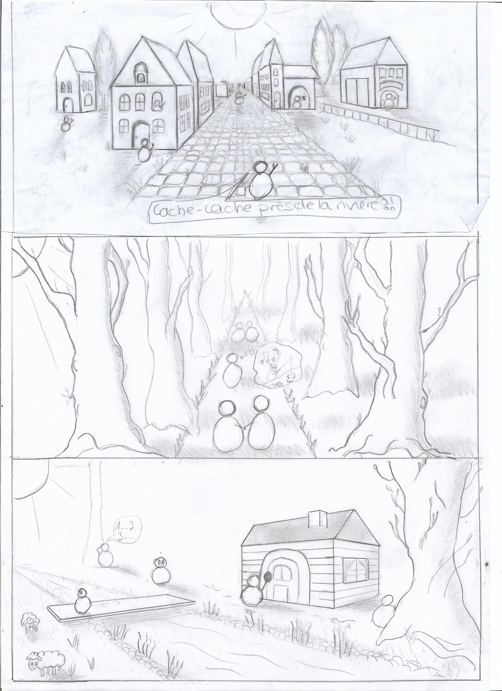 Voici ma première composition / mise en scène, un début de partie de cache-cache. J'ai essayé de mettre un peu de perspective, de valeurs de traits et d'ombre. Les personnages sont trèèès basiques, ha ha... J'ai hâte de voir les cours suivants pour améliorer et avancer ma mini-B.D. ! ^^
