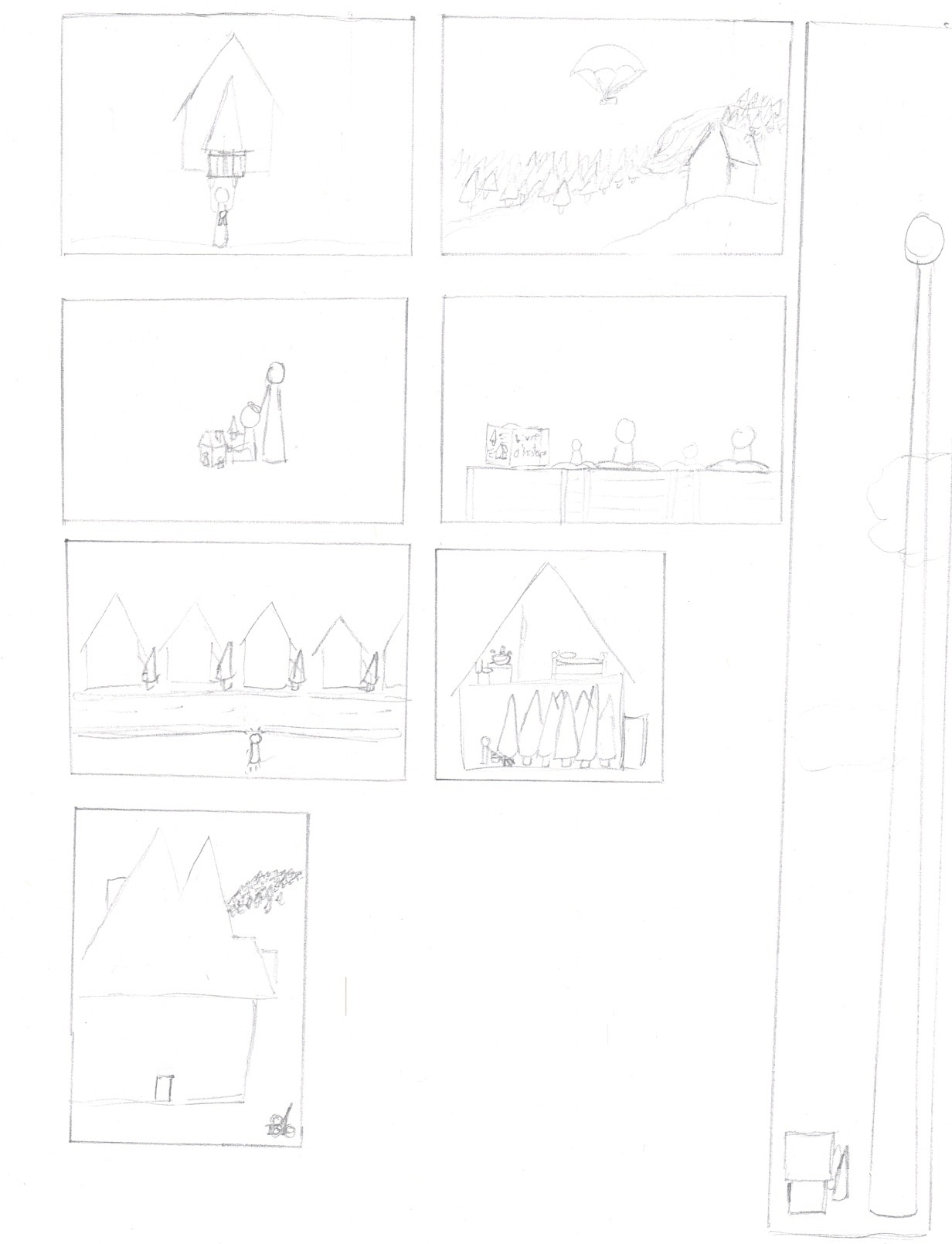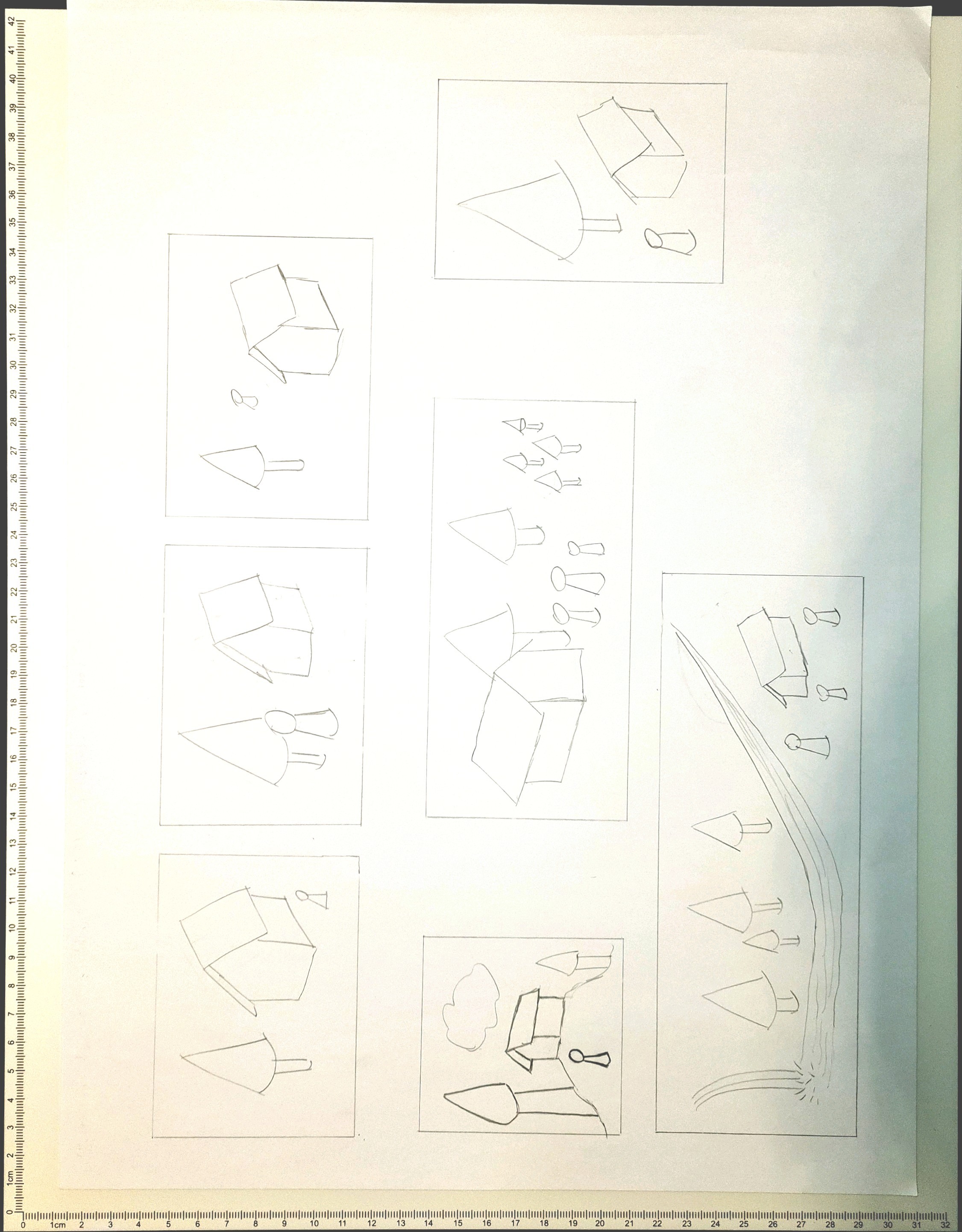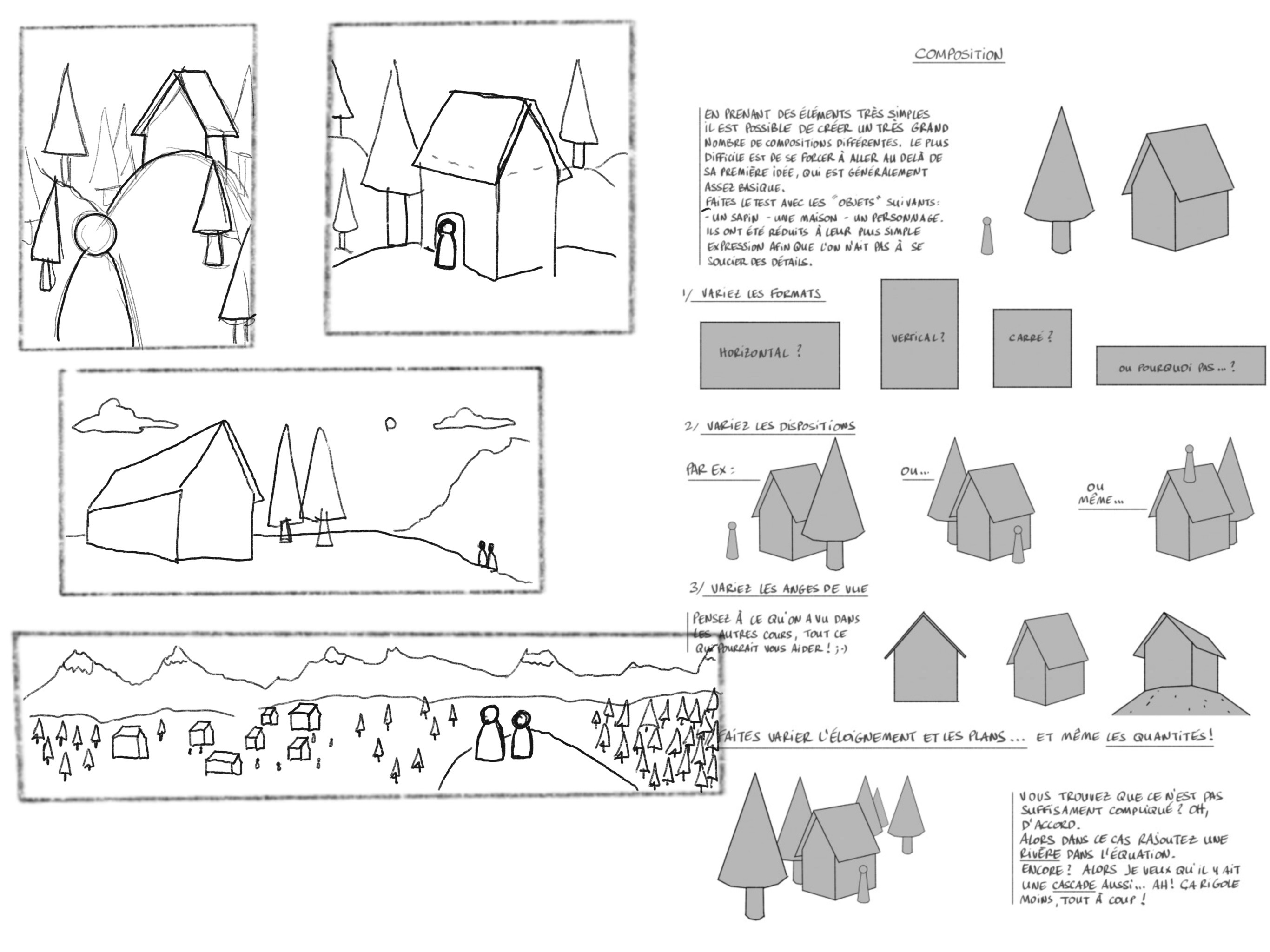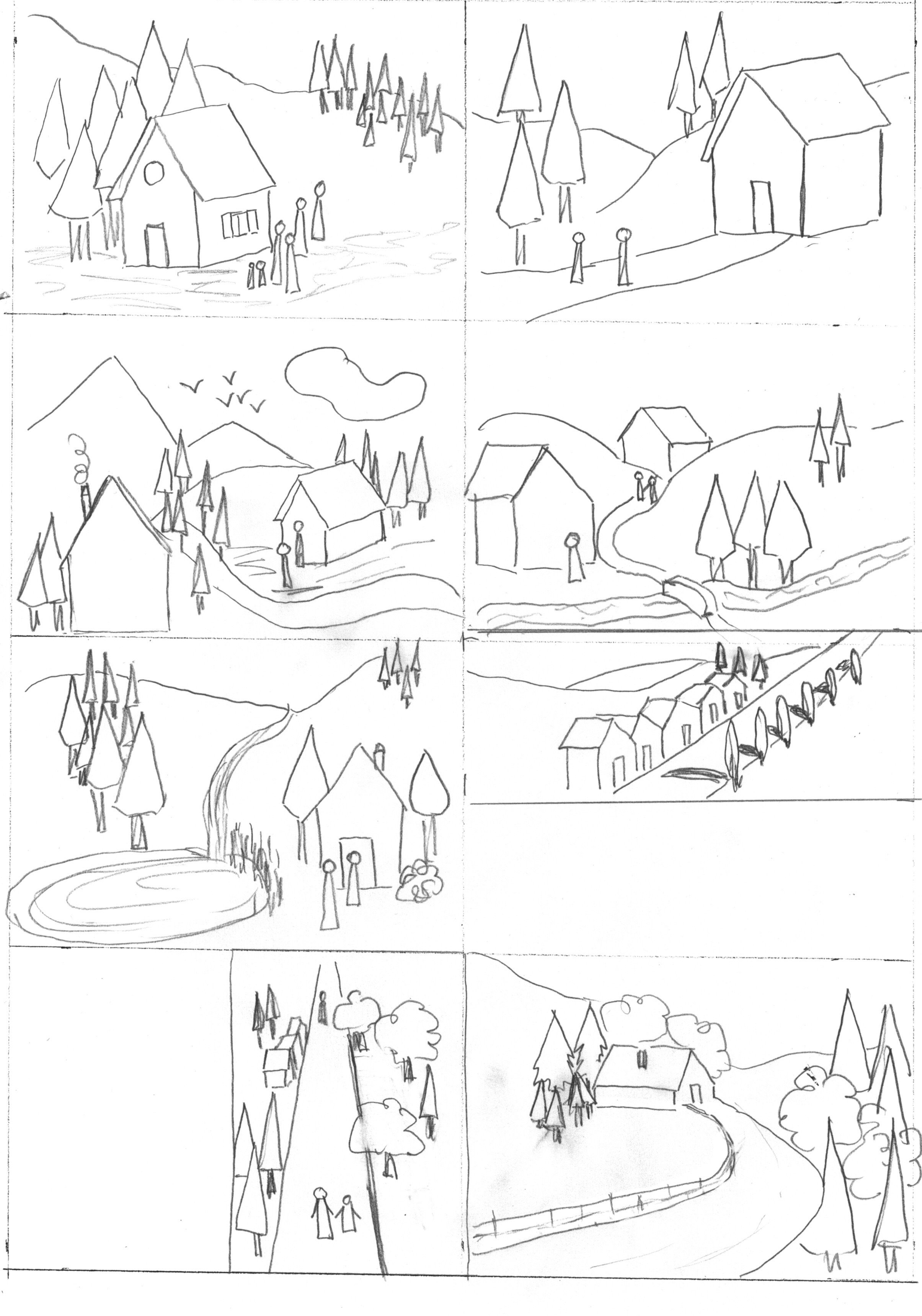 On a plus ou moins toujuours le même point de vue, (vu de haut / en plongée de 3/4) tu as une ou deux variations, mais sinon c'est toujours assez similaires. Tu as changé le cadre parfois aussi. Et surtout ça manque de contexte : où est l'horizon ? Où est-ce qu'on est, en bordure d'un village, dans la montagne, en pleine forêt ?