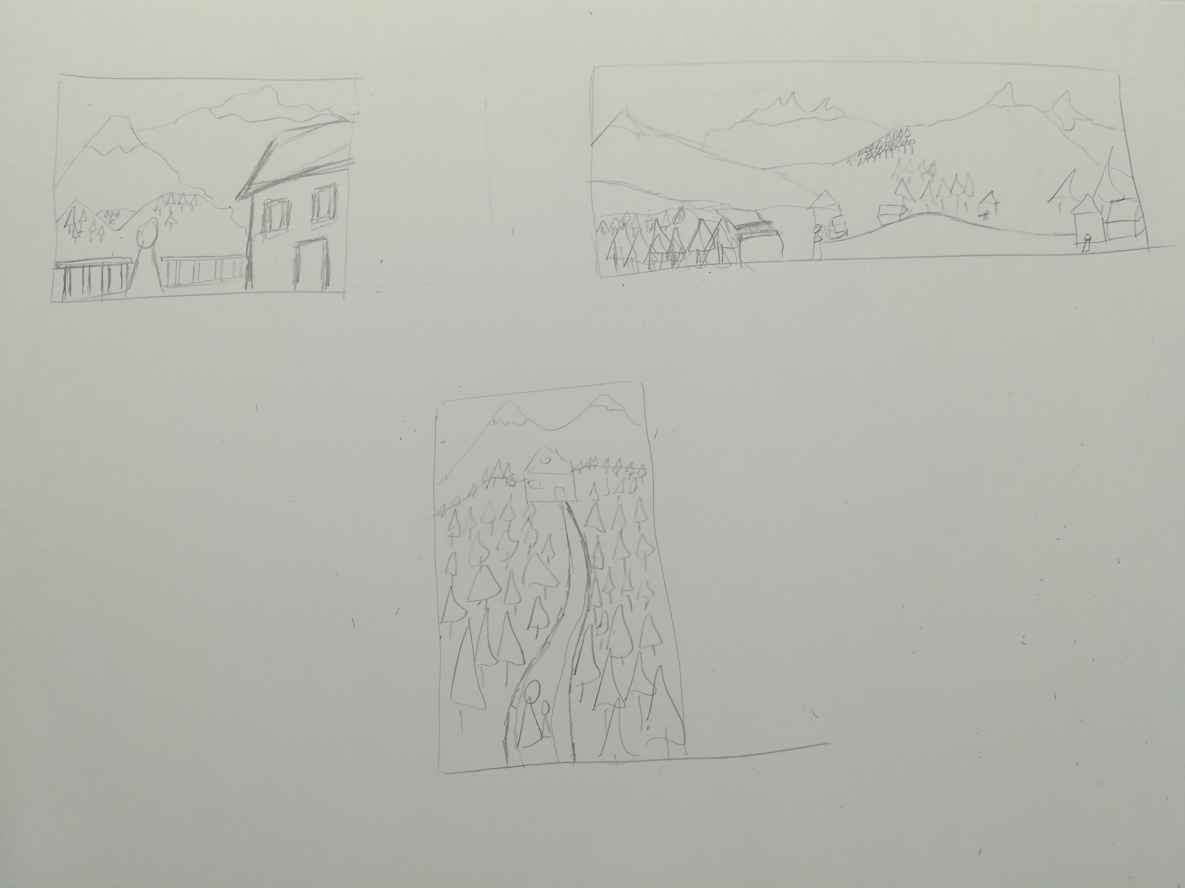 La seconde manque peut-être d'un point de focus : on ne sait pas trop où regarder exactement... C'est peut-être quelque chose qui se jouerait avec les valeurs (point lumineux dans l'image avec un rayon de soleil sur la montagne par exemple) Mais globalement j'aime bien les formes que tu as dessiné !