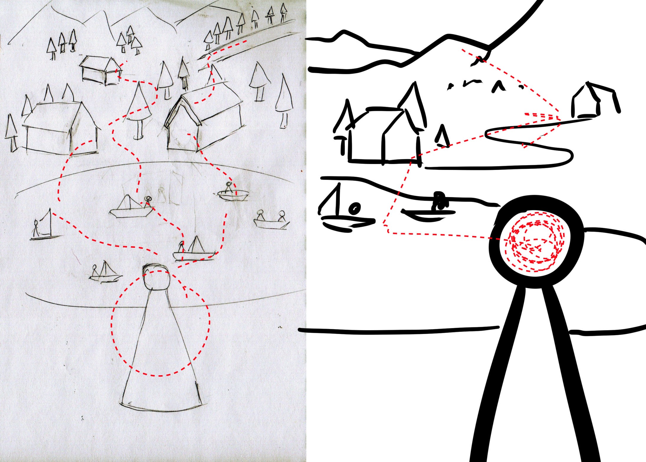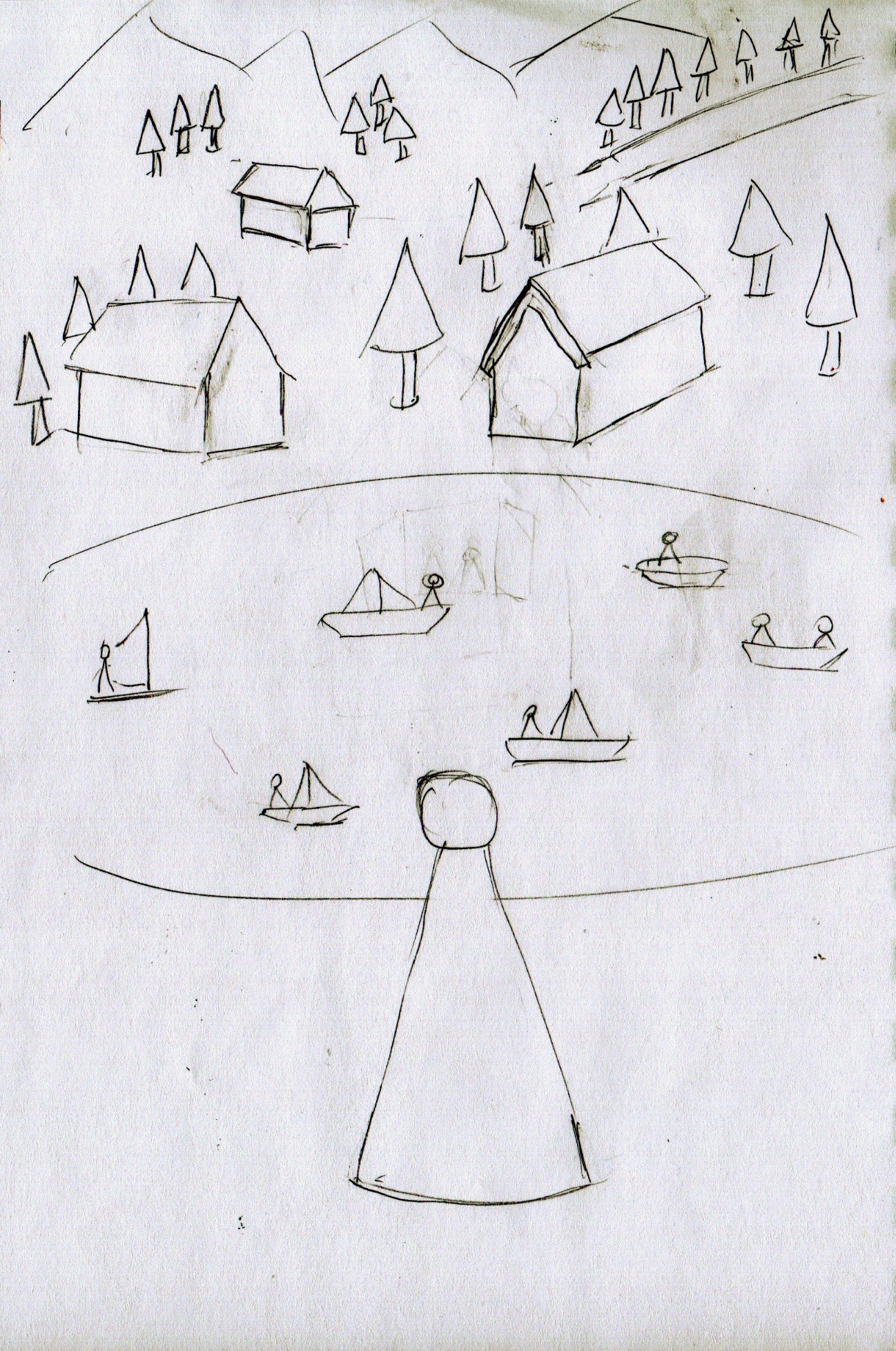 Ahahah j'aime beaucoup les petits commentaires. Je vois que tu as plein d'idées et c'est une bonne chose... Seulement il ne s'agit pas que de savoir quoi représenter mais aussi comment ! Tes idées sont chouettes mais en terme de composition c'est un peu pauvre. Déjà, dessiner la ligne d'horizon aidera beaucoup à rendre le tout moins "flottant", là sur beaucoup de tes compos tu as 1/2/3 éléments placés dans un vide intersidéral et ça manque un peu de contexte :D