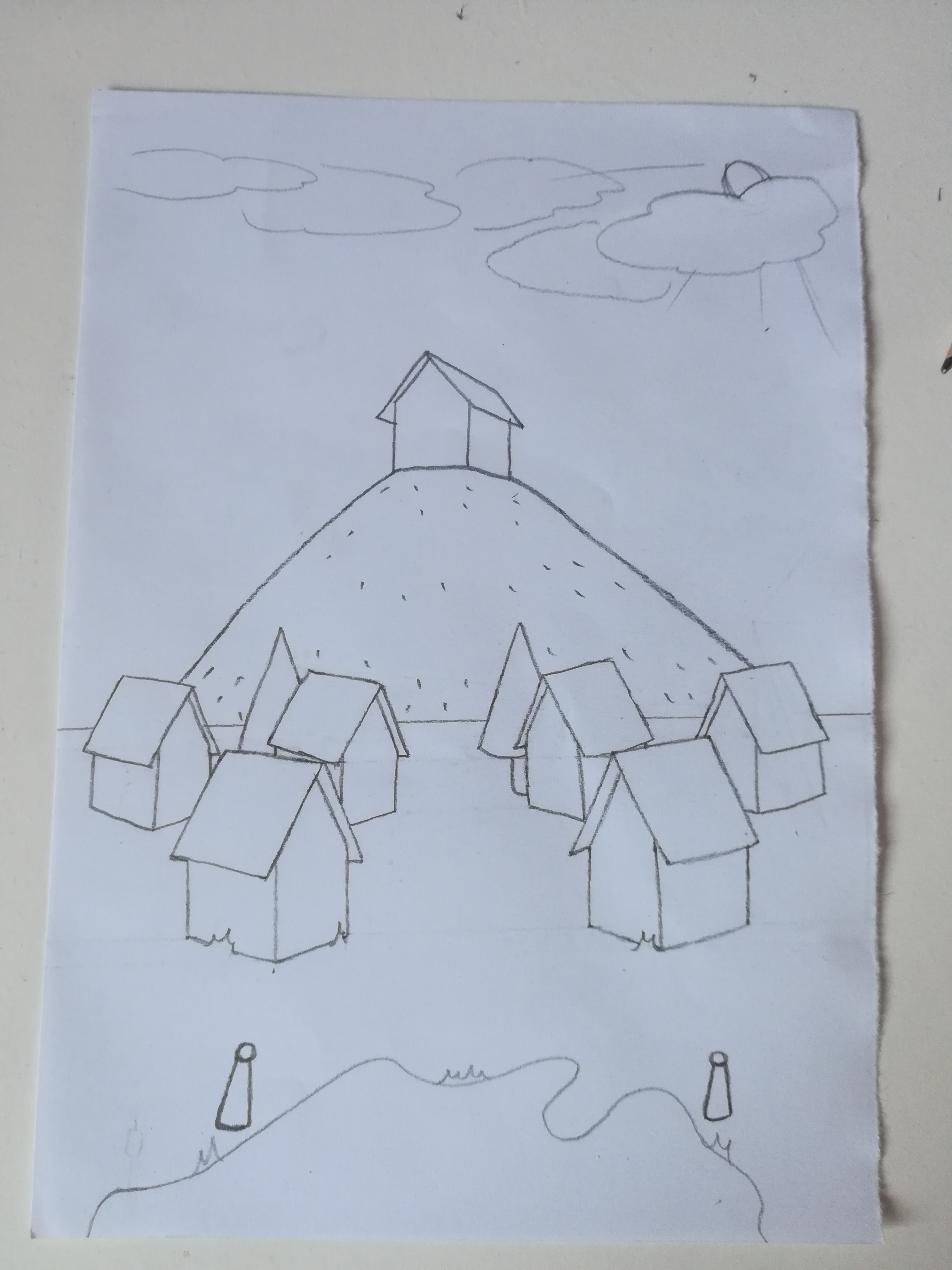 C'est plutôt sympa ! Je vois que tu es parti-e sur une composition cntrale, quasiment symétrique. J'apprécie le fait qu'elle ne le soit pas totalement, ça apporte des petites touches d'imprévu ! Ton plan d'eau (?) fait un peu bizarre en bas, et tes nuages ont l'air tout coincés dans le haut du ciel, mais en tout cas toute la partie avec les maisons fonctionne assez bien.