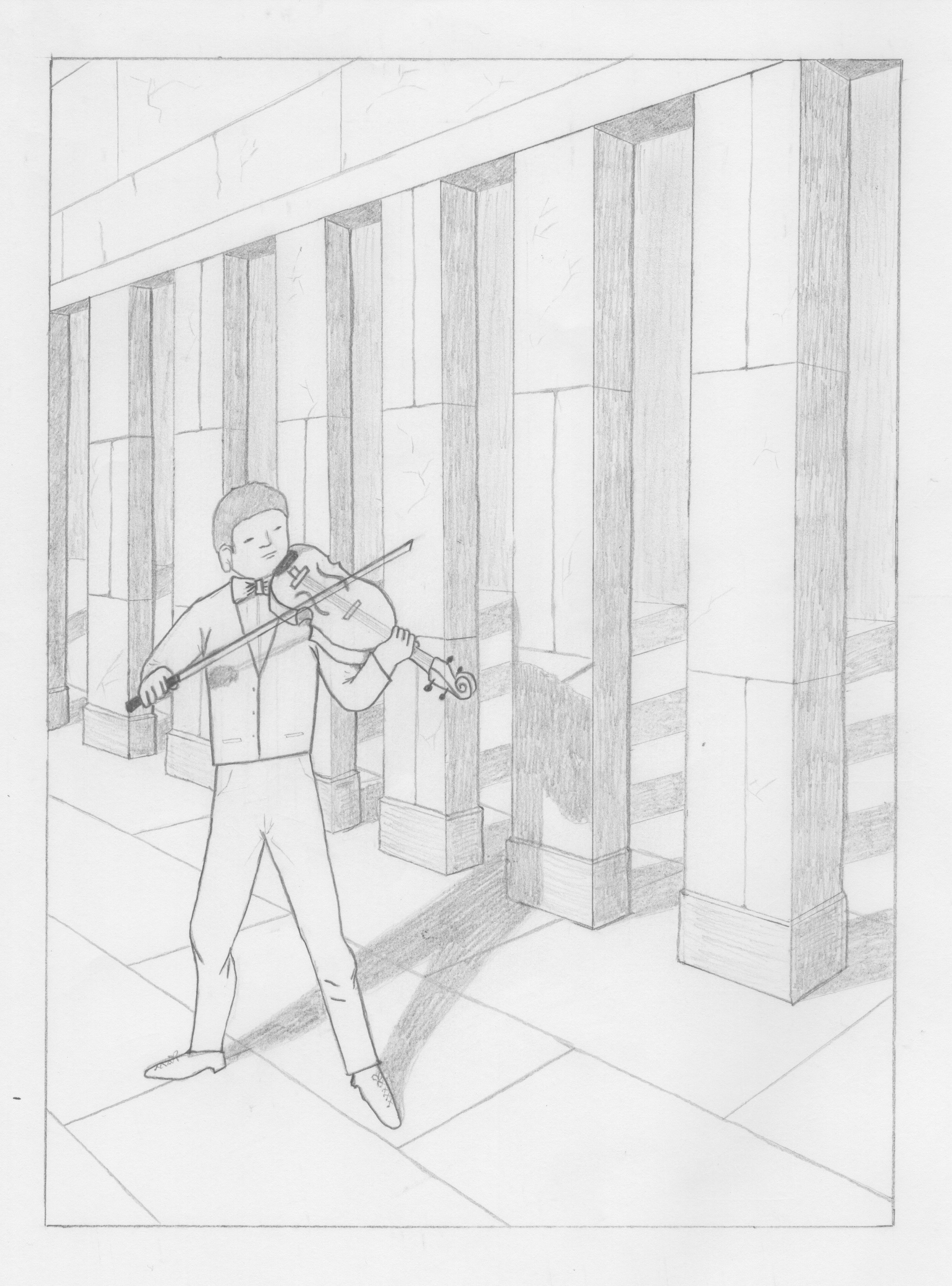 Je viens de terminer la formation et voici mon dessin récapitulatif. Pas sûre de l'exactitude au niveau des ombres des colonnades et du plafond de cette place. Mais dans l'ensemble je trouve qu'il y a un peu de profondeur et le rendu est pas trop mal (bien galéré sur mon musicien, surtout les mains qui ont faillis devenir des moufles🙂).