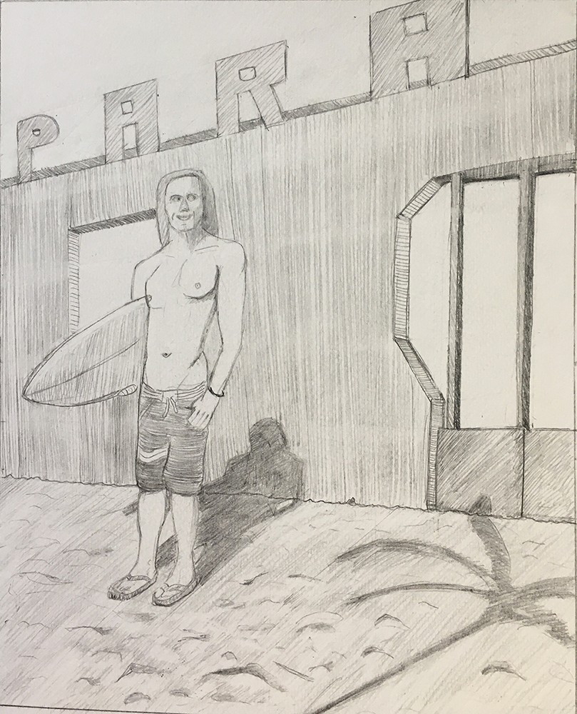 C’est ma deuxième illustration après celle de la récap1. Je constate que cela m’a pris beaucoup de temps parce que j’ai tenté dans la mesure du possible de trouver une méthode. Je crois ne pas m’être trop planté pour l’ombre du perso sur le mur. En revanche, j’ai eu le sentiment d’improviser pour les ombres du visage, celles des rebords des fenêtres et les traces de pas sur le sable. Comment s’arrête l’ombre? Quelle forme prend-elle? Je suppose qu’il faut que j’approfondisse cette question.