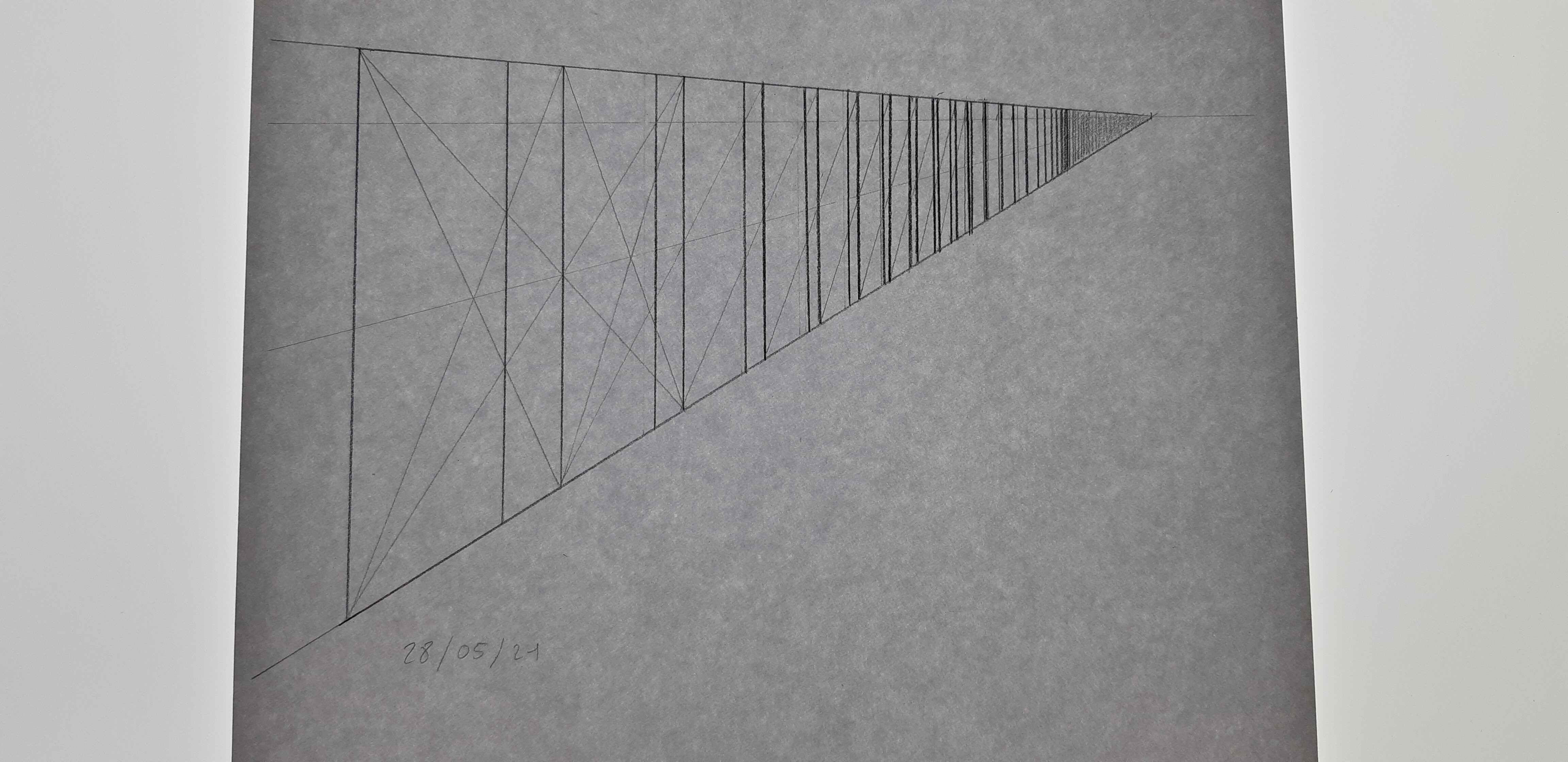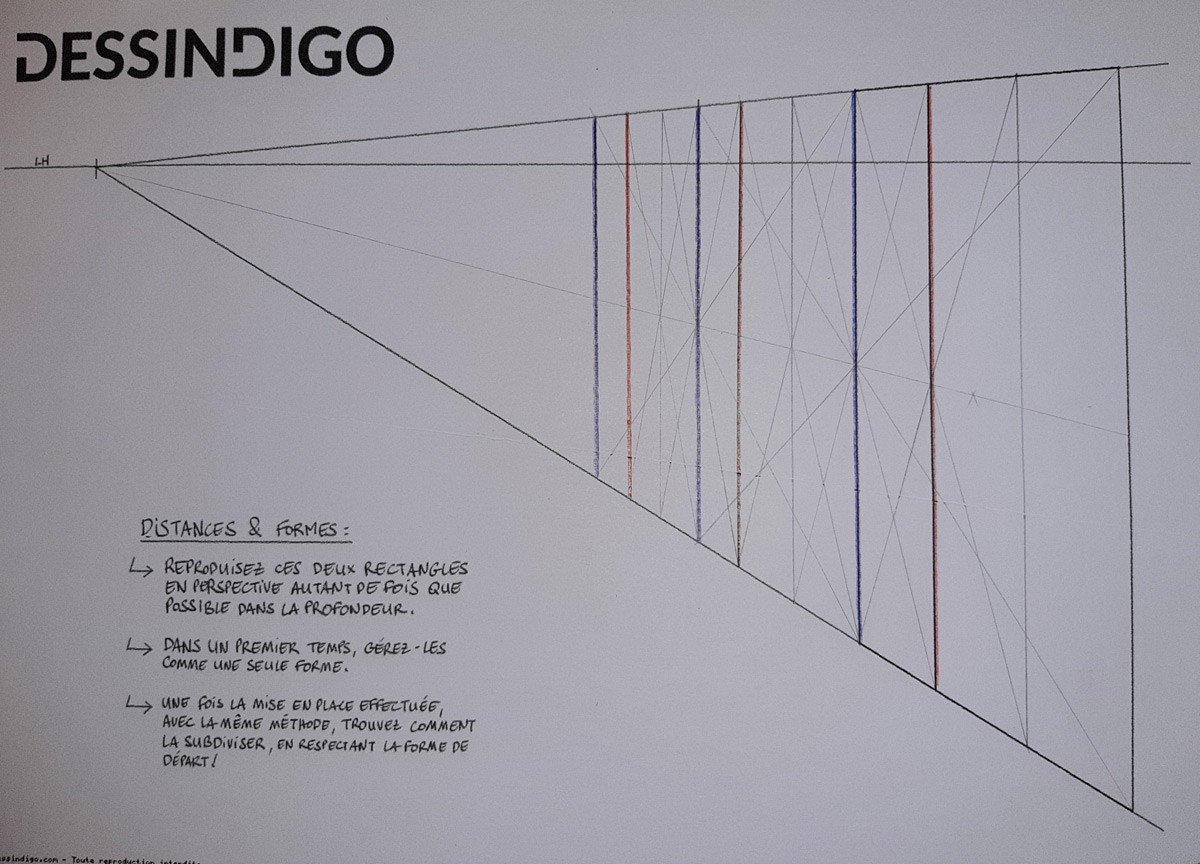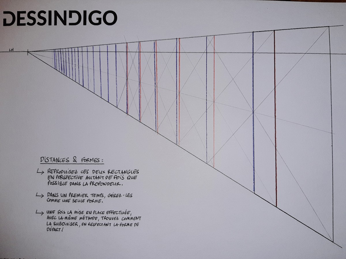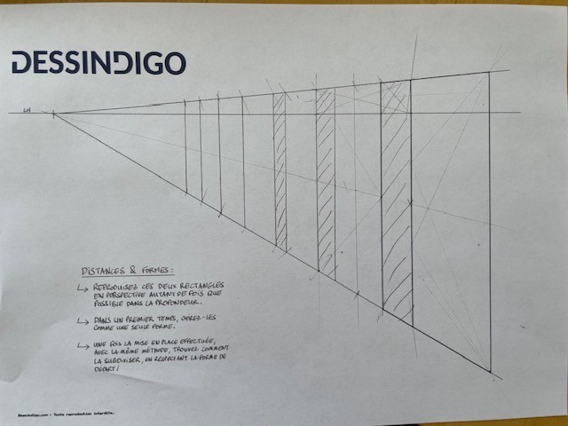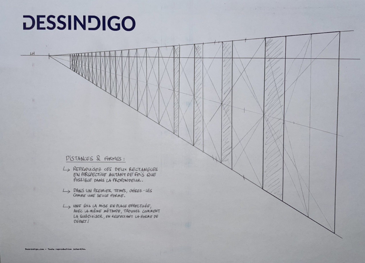 Voici mon exercice sur le rectangle en profondeur. En regardant la correction je n'ai pas fait comme le fait Grégoire avec la division en 3 parties de la forme de base pour avoir la distance avec les petits rectangles. J'ai pris une ligne de fuite qui reprends les points d'intersections entre la diagonale qui nous permet de transposer le grand rectangle et en traçant les verticales à ces points d'intersection. Est-ce correct ?