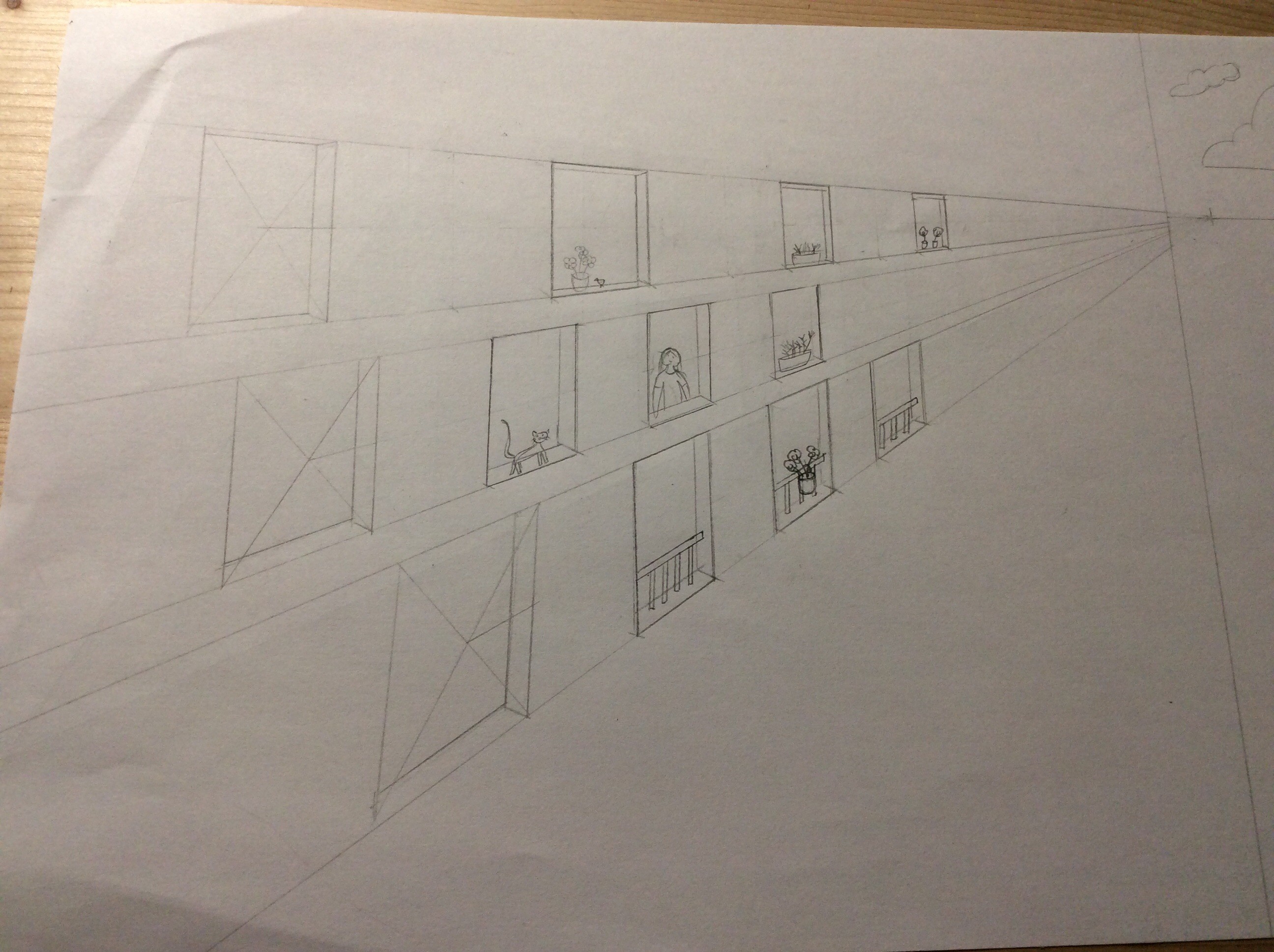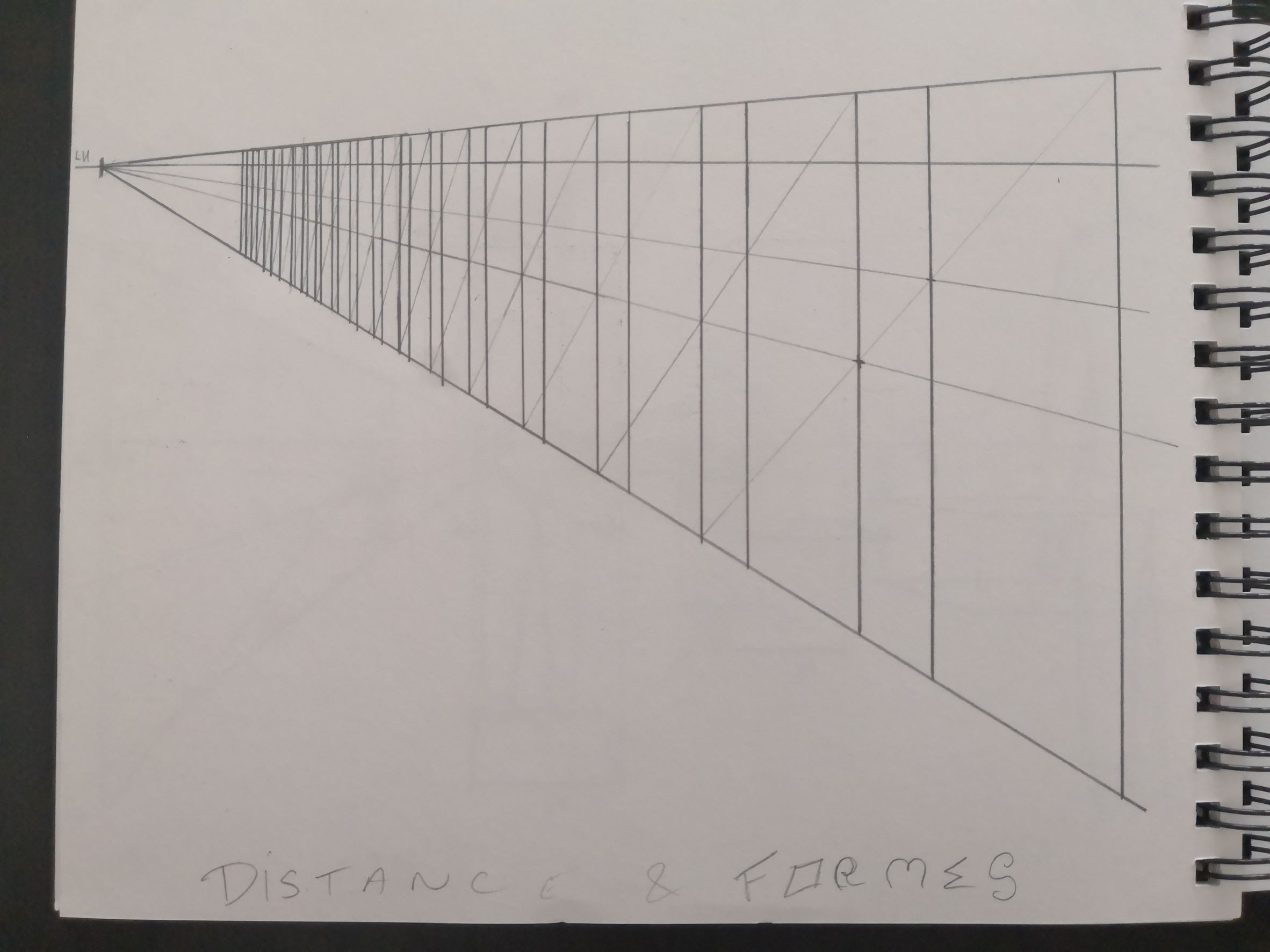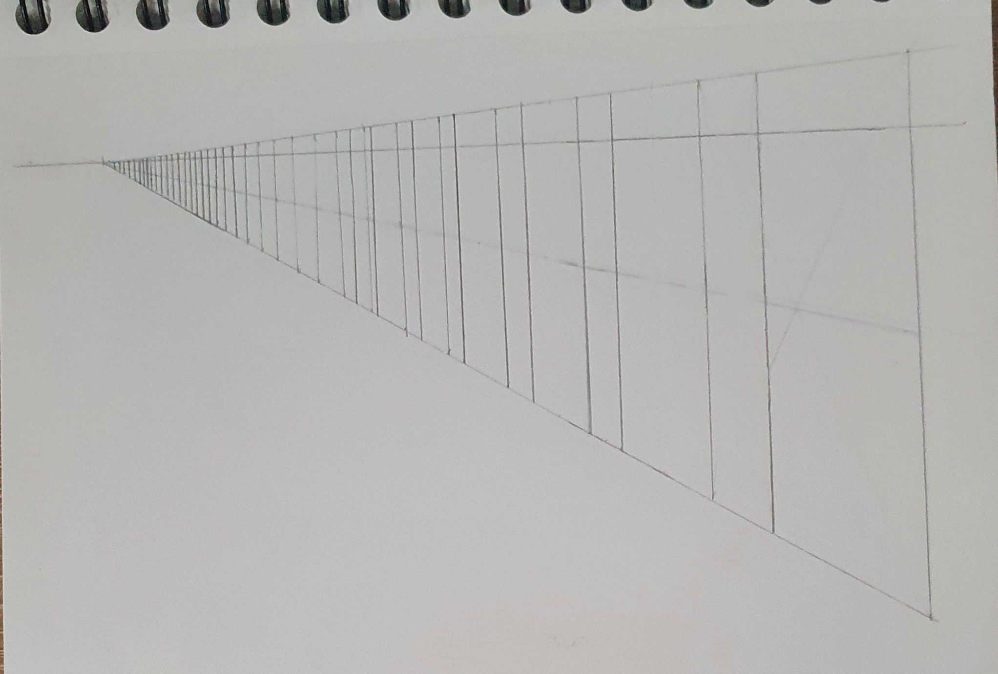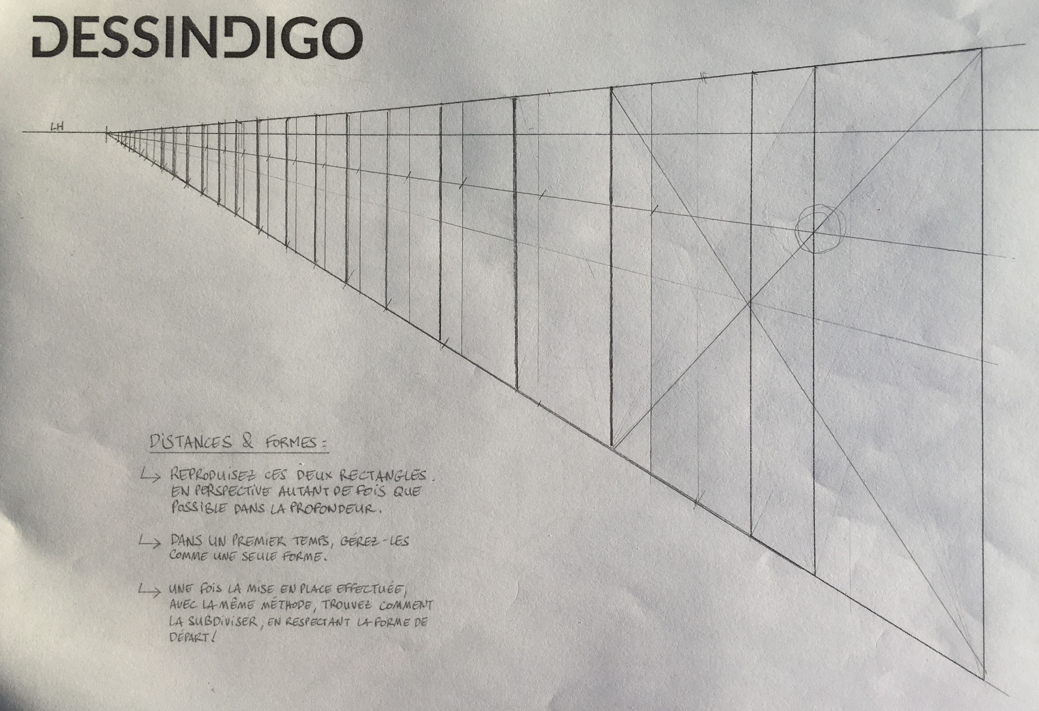 Voici mon exercice sur le rectangle en profondeur. En regardant la correction je n'ai pas fait comme le fait Grégoire avec la division en 3 parties de la forme de base pour avoir la distance avec les petits rectangles. J'ai pris une ligne de fuite qui reprends les points d'intersections entre la diagonale qui nous permet de transposer le grand rectangle et en traçant les verticales à ces points d'intersection. Est-ce correct ?