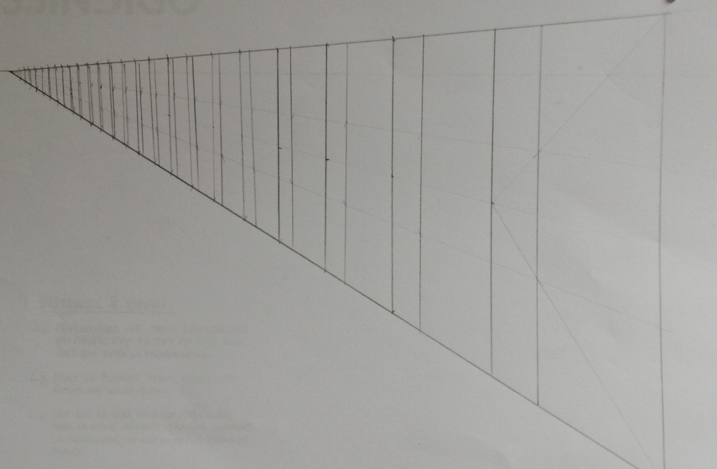 Pour la subdivision, j'ai fait autrement : j'ai relié les coins du grand côté du rectangle au milieu du petit, ce qui a créé 2 points d'intersection avec le trait de la subdivision. J'ai créé 2 lignes de fuite.