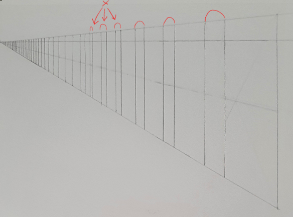 Pour la subdividion suivante, j'ai fait de même : le trait de la subdivision est issu de l'interserction des 2 lignes de fuite avec les lignes qui rejoignent le milieu du petit côté.