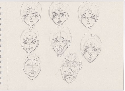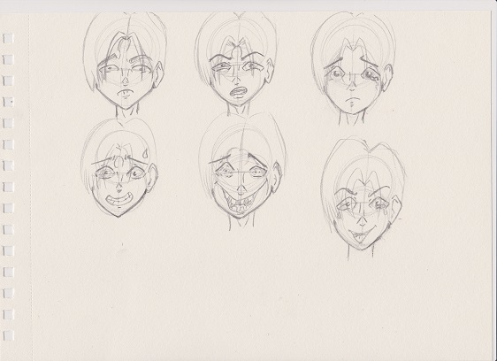 Les expressions sont très lisibles, bravo ! Il y a parfois des soucis au niveau des sourcils et de la mâchoire : les sourcils doivent former une seule et même courbe, coupée en son centre (sauf pour les monosourcils...) et il faut faire attention à leur alignement. Pour la mâchoire, il faut juste faire attention à lui faire suivre le mouvement de la bouche quand le personnage parle ou crie. Le menton se baisse un peu et les joue s'amincissent légèrement. Je te laisse une petite correction pour illustrer tout ça.