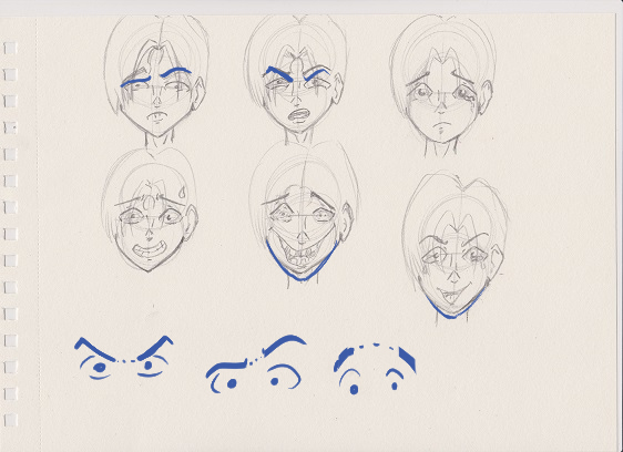 Les expressions sont très lisibles, bravo ! Il y a parfois des soucis au niveau des sourcils et de la mâchoire : les sourcils doivent former une seule et même courbe, coupée en son centre (sauf pour les monosourcils...) et il faut faire attention à leur alignement.