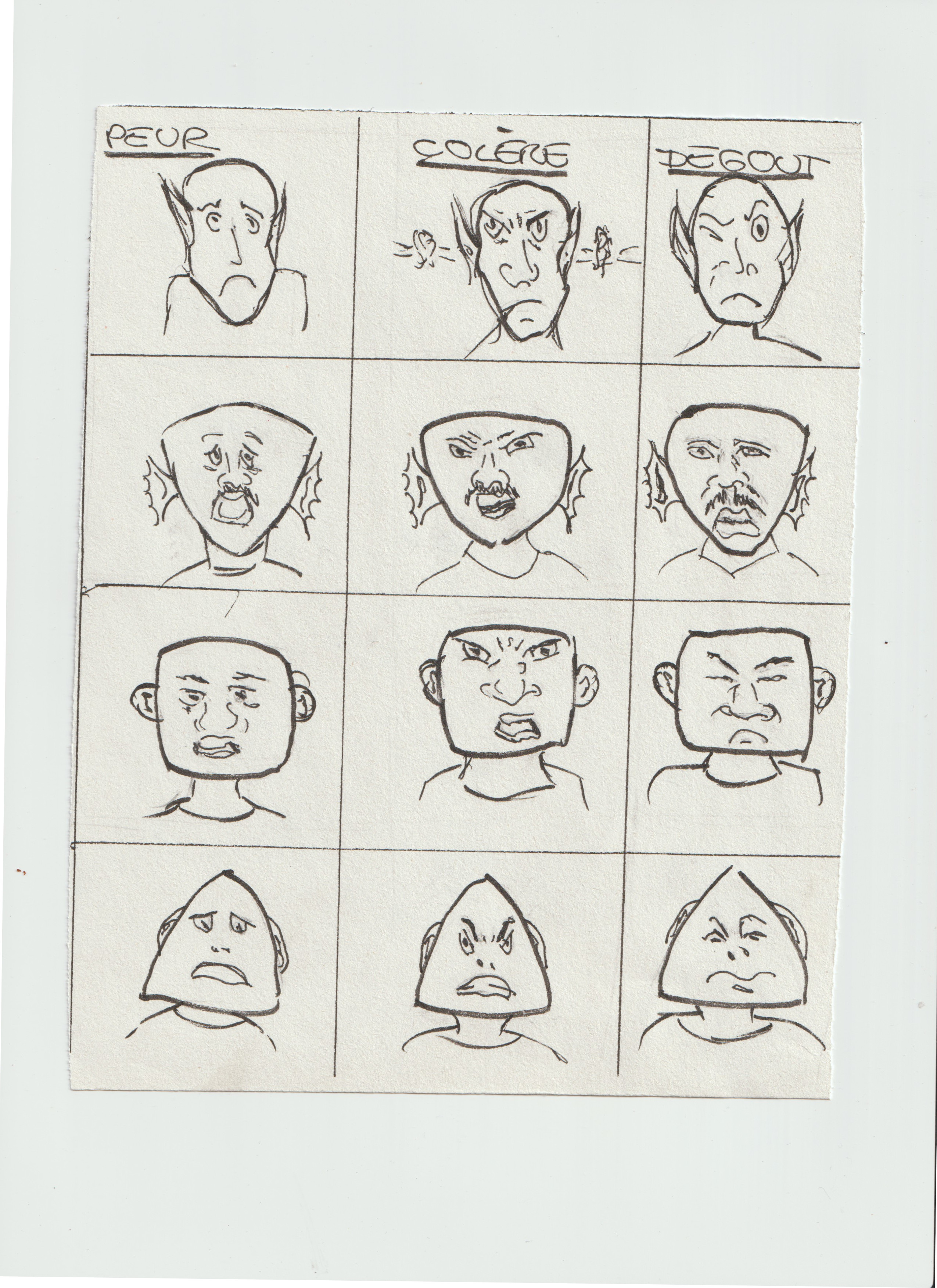 désolé pour la réponse en retard, j'étais en congés, je serai plus réactif à partir d'aujourd'hui. On distingue bien ici chaque expression, beau travail ! Attention toutefois à l'utilisation des sourcils et la forme des yeux : les yeux ne changent pas de forme en fonction des expressions, ce sont les sourcils qui viennent les cacher légèrement via l'arcade sourcilière. Les yeux, eux, sont toujours ronds.