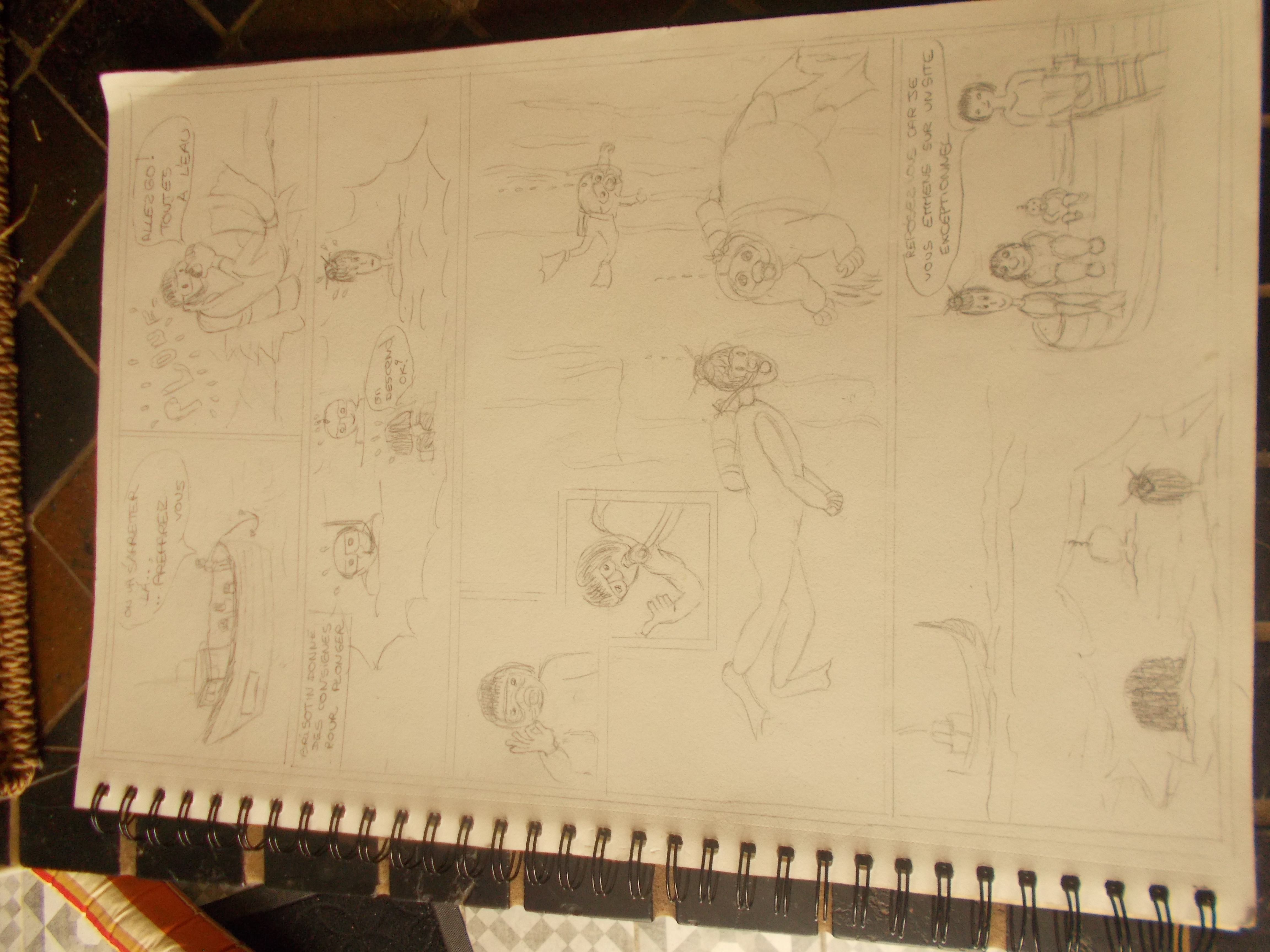 désolé pour le retard, je n'ai pas eu la notification pour ces deux planches ! Le storyboard est clair, l'enchaînement des actions et fluide, on comprend bien le déroulé. Il y a peut-être un souci dans la grande case 4 de la page 2 : les 2 petites cases emboîtées dans la grande, c'est un effet sympa mais ces deux petites cases se ressemblent beaucoup et ça crée une sorte de répétition visuelle qui casse le rythme de l'ensemble. Il vaudrait peut-être mieux n'en laisser qu'une, ou trouver une autre solution (case légèrement plus grande faisant rentrer les 2 plongeurs dans sont cadre, déplacement, etc.)