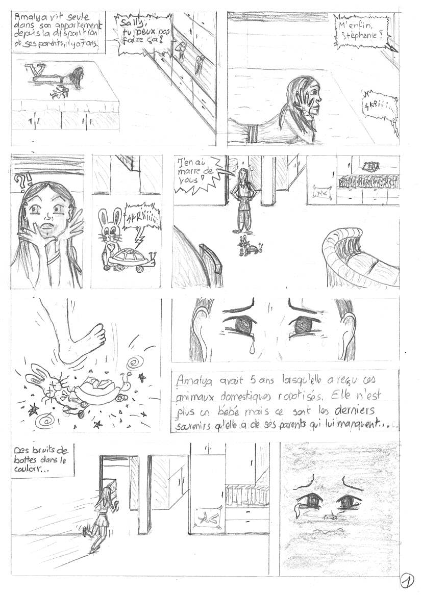 Pour la planche 1, peut-être que l'action d'écraser les jouets serait plus percutante si les cases 5 et 6 étaient fusionnées : on verrait Amalya qui dit "j'en ai marre de vous" tout en détruisant le jouet, ça donnerait une narration moins statique, moins hachée et plus dynamique. Pour le reste, le découpage est bon !