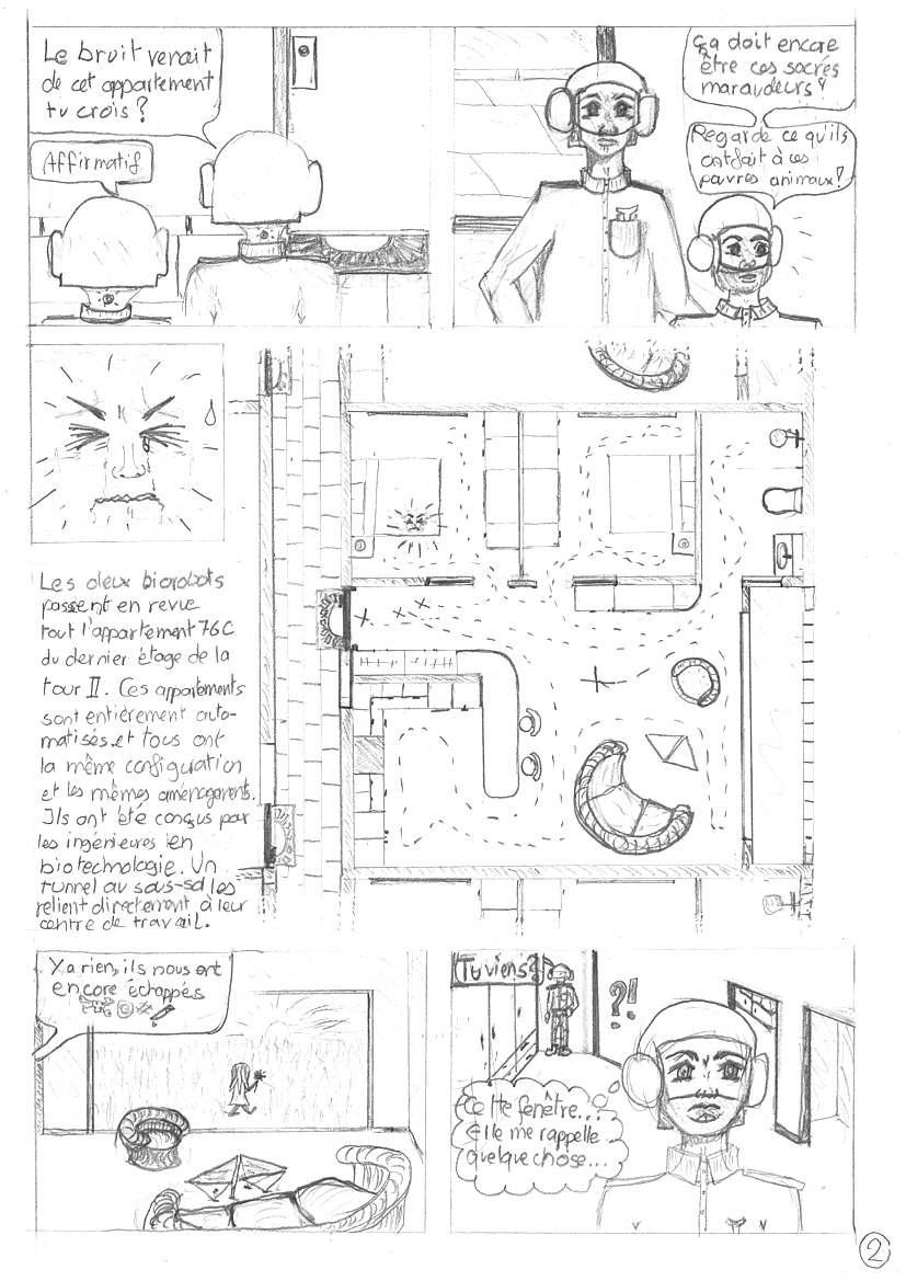 Dans la page 2 j'ai pris la liberté d'enlever le cadre pour faire le plan de l'appartement. Il est aussi utile pour moi, pour les perspectives selon les points de vue dans les plans. Et j'ai mis des traits pour le trajet des personnages. Je voulais d'abord mettre des traces de pas, mais ça risque de surcharger, non ?