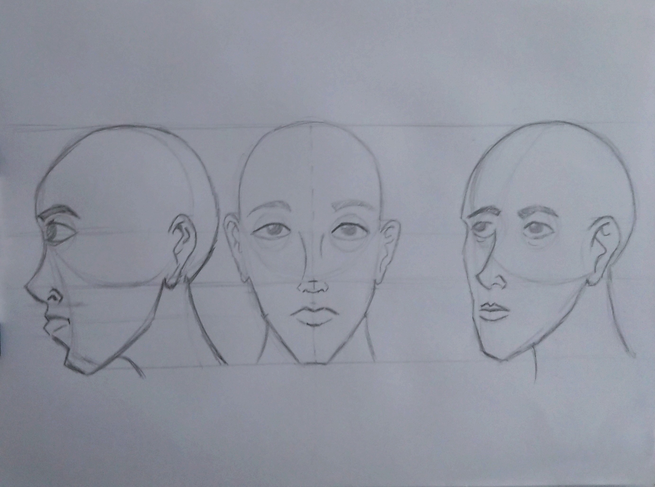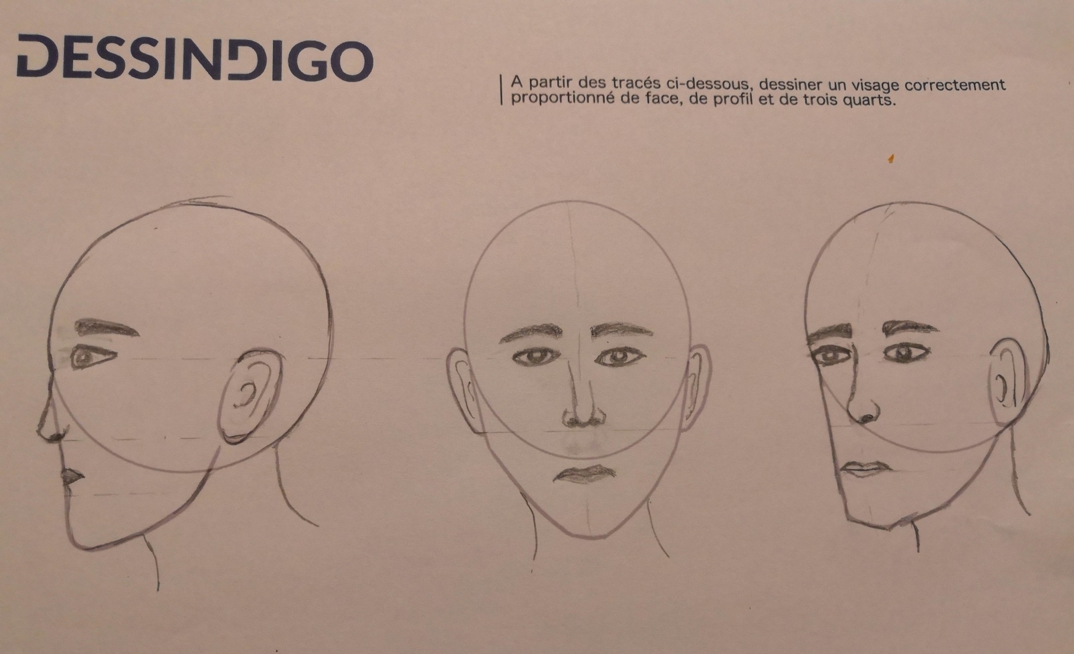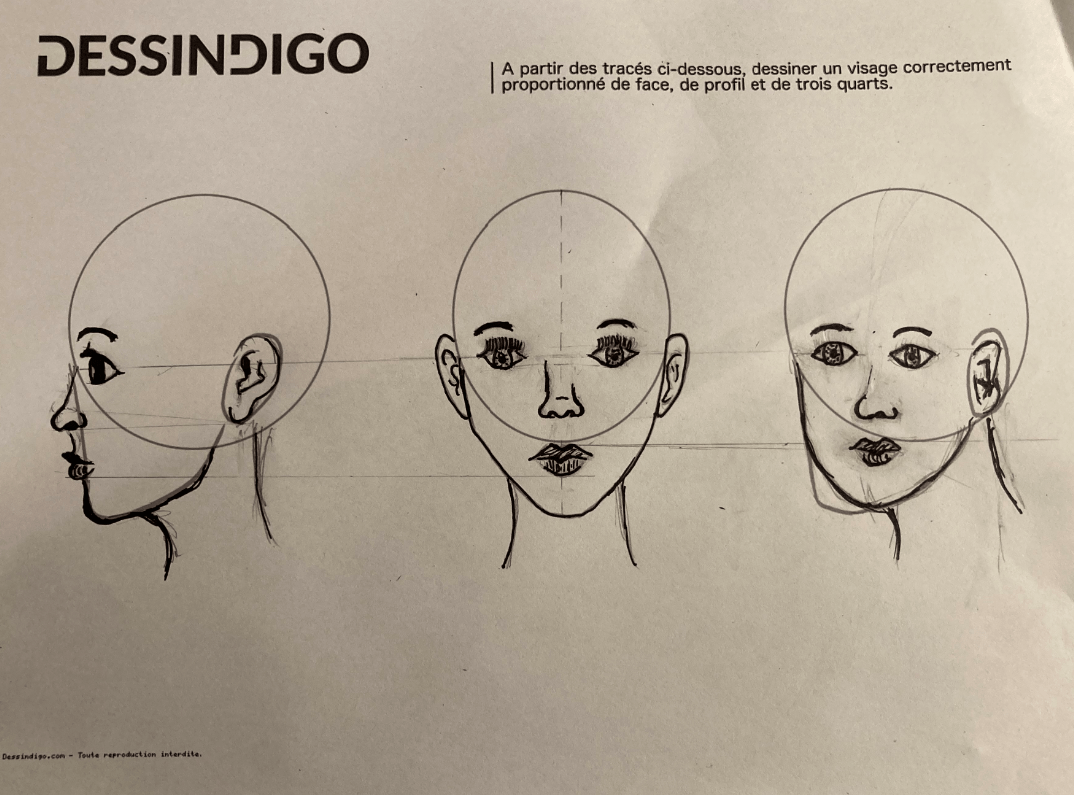 le dessin d'un visage n'est pas simple, mais il y a là un bon début ! Attention à la symétrie dans le visage de face, il ne faut pas hésiter à ajouter des traits de construction si nécessaire. La bouche peut aussi être remontée un petit peu, ou épaissie. Bon courage pour la suite !