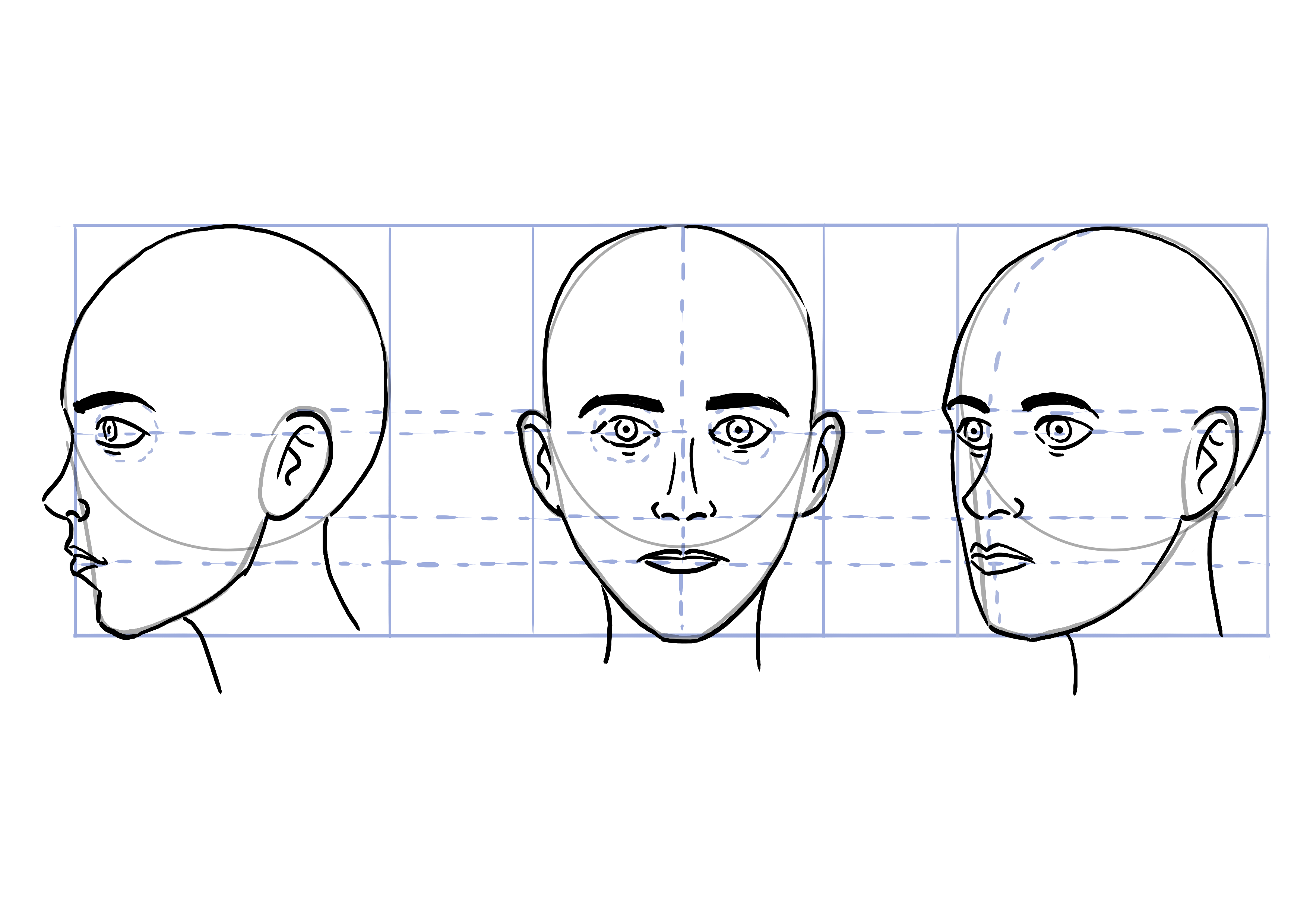 très bons visages de face et de profil ! Pour le trois quart, il faudrait décaler le nez sur la gauche. Comme le visage est tourné, le nez qui est central dans le visage de face doit se décaler avec le reste du visage. Je remets le support d'exemple pour modèle.