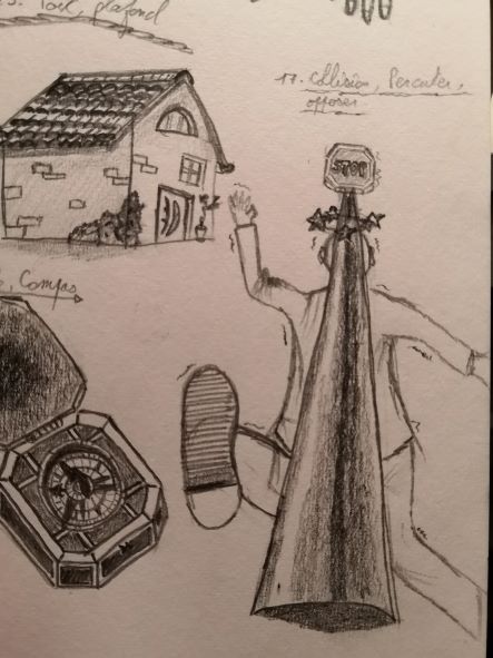 Pour ma part j'ai eu plein d'idée aussi mais je voulais autre chose, et du coup je me suis dis qu'un mec qui se prend un poteau serait un bon moyen de travailler un peu de personnage un peu différemment. Puis pour un effet comique je me suis dis qu'un panneau stop ça serait bien marrant à mettre. Mais pourquoi aussi simple, j'avais d'abord fait de face pour travailler les raccourcis des membres vue de face et finalement j'ai changé, de profil, 3/4 etc mais j'ai finalement décidé de mettre une contre-plongée et je dois dire que je suis assez content de moi sur ce dessin.