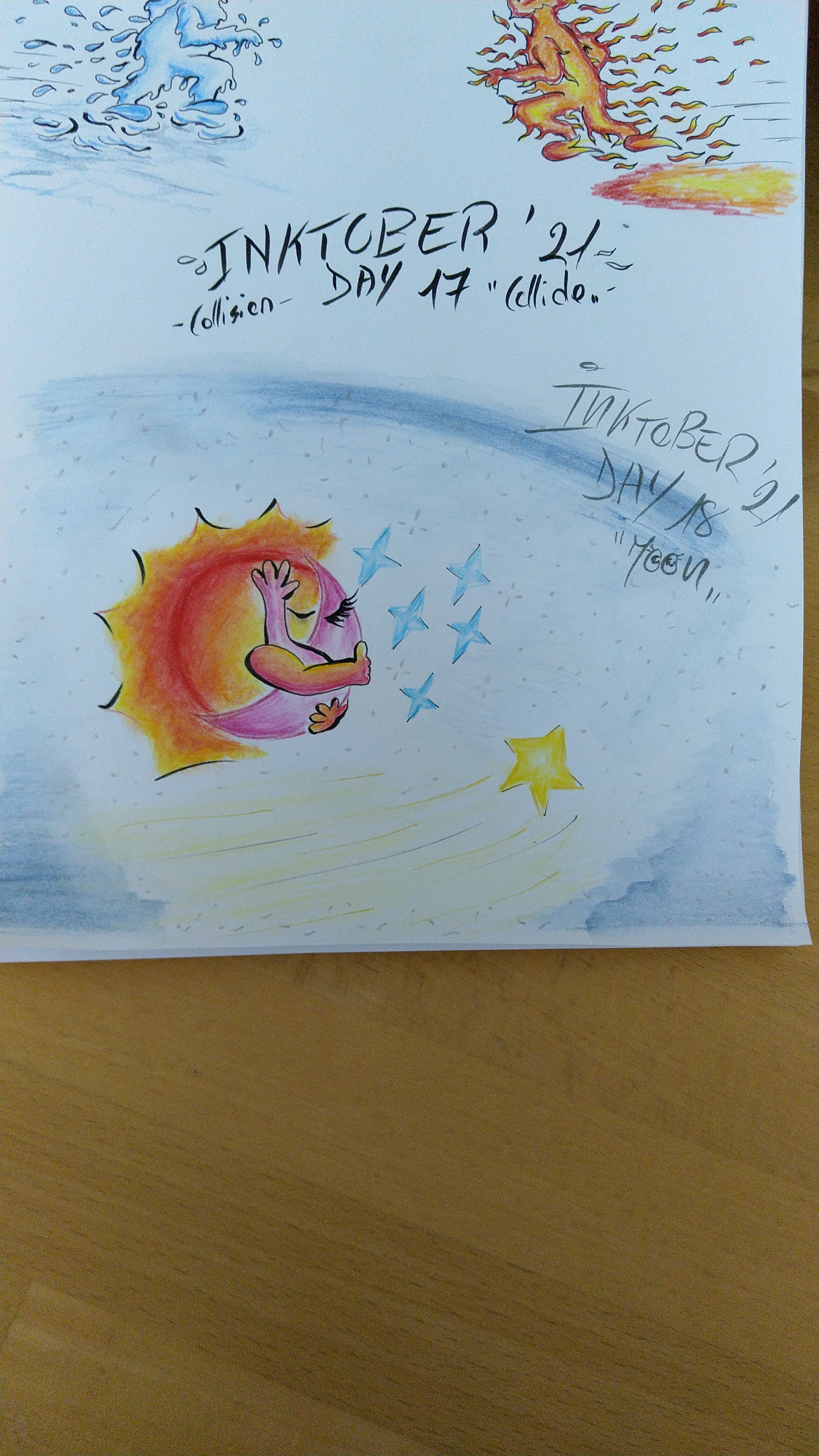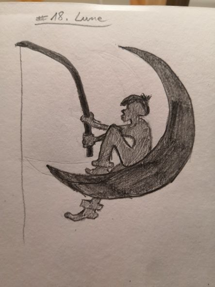 Moi j'avais en tête THE fusée, celle de Tintin of course ;o) Donc je me suis dit que je laissais passer la nuit de dimanche ( je regarde quand j'ai fini mon dessin du jour le thème du lendemain, pour réfléchir déjà à des idées, mais c'est vrai qu'en général, ma première idée est la bonne.... ), pour voir si la nuit porte bon conseil, sinon je pensais faire un mix des deux idées, faire la fusée de Tintin dans l'œil de la lune; mais vraiment...elle est trop moche cette lune 😂