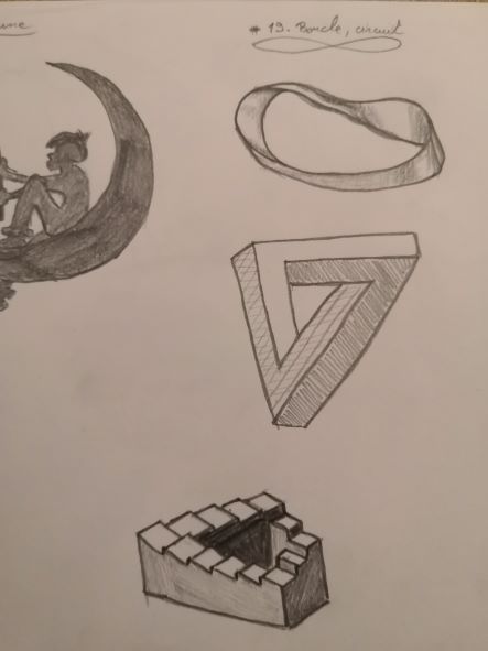 Pour ma part, j'ai pas réfléchis du tout à ce thème, ça m'a inspiré directement le ruban de Möbius que j'ai mis sous différentes formes car je voulais un peu de tout. Alors on dirait pas comme ça mais j'ai galéré sur chacune des figures (surtout cet escalier infernal 😰 mais finalement j'ai réussi à le faire d emanière correctement une fois sur mon vrai cahier (l'essai juste d'avant n'était pas une réussite sur mon petit brouillon). On voit que l'escalier par en vrille un peu mais bon l'illusion est là =D