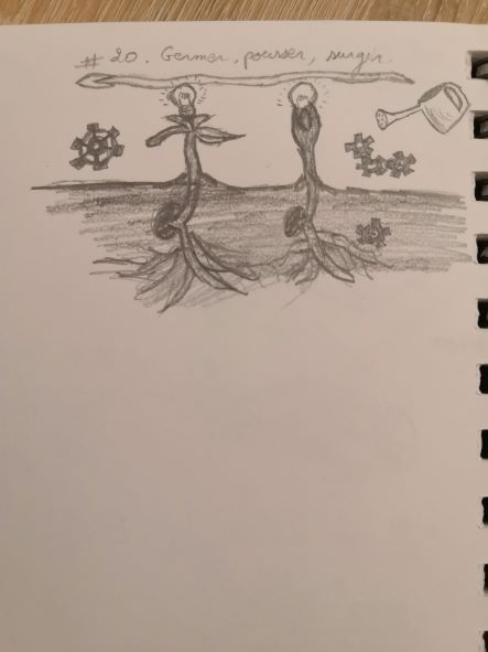 J'ai eu plusieurs versions pour ce sujet mais qui tournaient surtout autour de "faire germer des idées". Et rien de tel que des plantes cultivées par des méninges (les rouages) qui permettent de faire naître des idées (les ampoules). Et je suis assez satisfait du résultat global de mon idée :-) même si j'ai commencé mon dessin un peu trop haut par rapport à mon titre qui fait que j'ai dû aplatir le haut du dessin qui était tout l'intérêt. Il m'a donc manqué de place pour les rouages c'est dommage