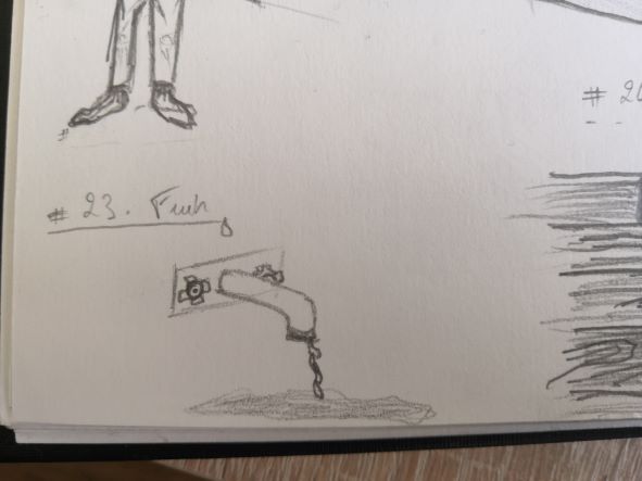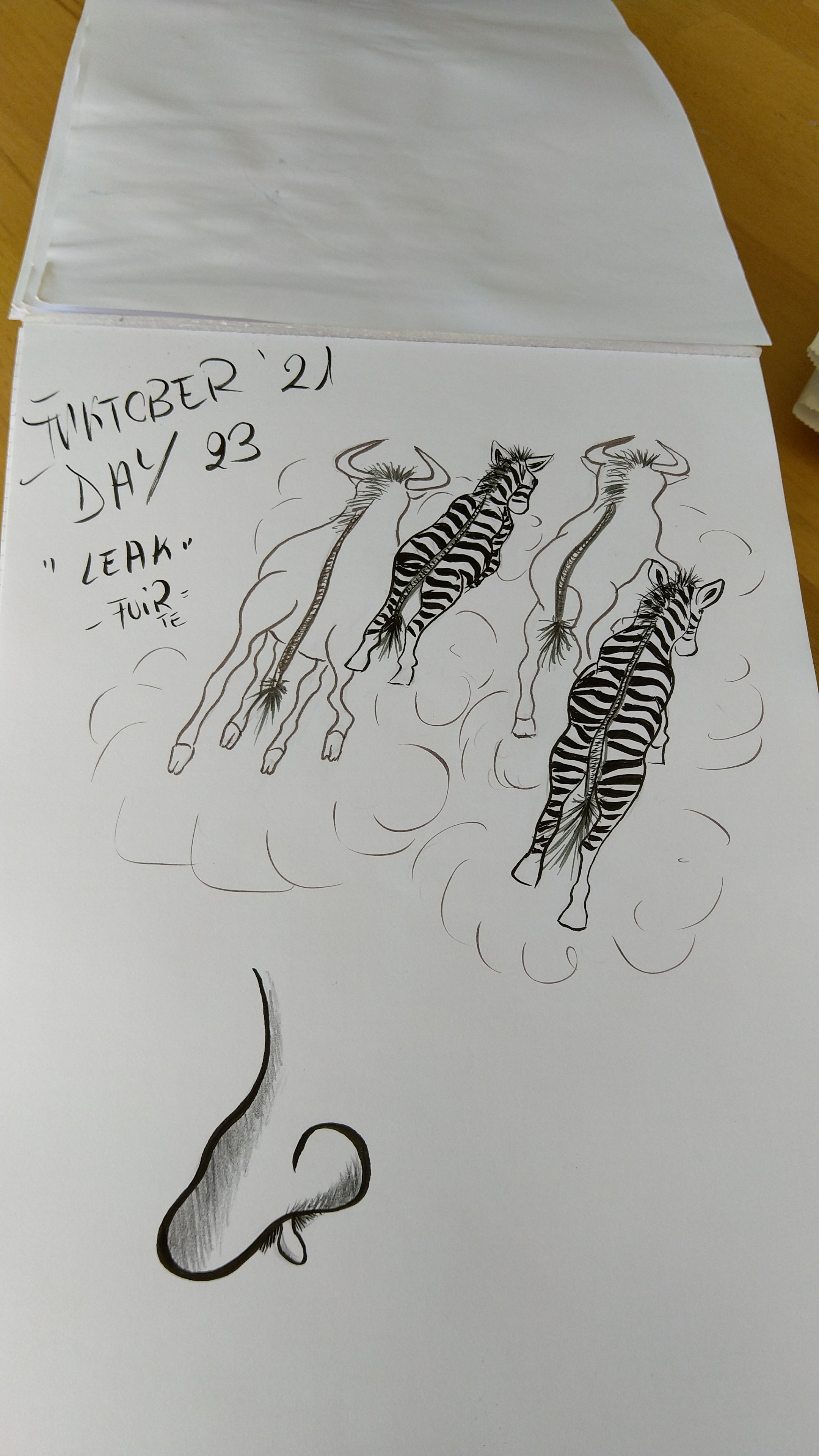 Tes animaux sont bien faits :-) En effet c'est plutôt "escape" et j'avoue que j'ai du repasser au thème en anglais pour éviter d'être hors sujet aussi car je voulais faire une prison avec un mec qui crochète sa serrure. Mais ce thème ne m'a pas du tout inspiré alors j'ai fait 3 traits pour faire un robinet qui fuit et vraiment sans effort dans le dessin du coup je en ferai aps plus de commentaires dessus 😂