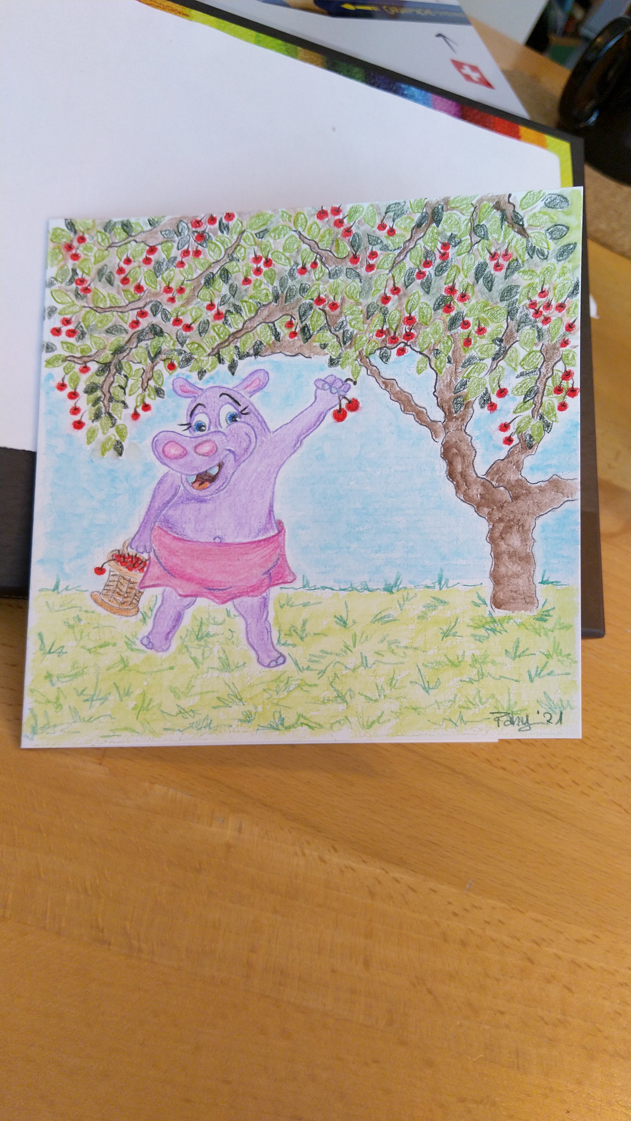Petite parenthèse, ma carte étant finie, ma fameuse cueilette de cerises de madame Popo, je la glisse ici, puisque c'était ma première idée du thème de dimanche dernier, avant de faire le petit Spip, pour avoir de l'encre sur mon dessin !