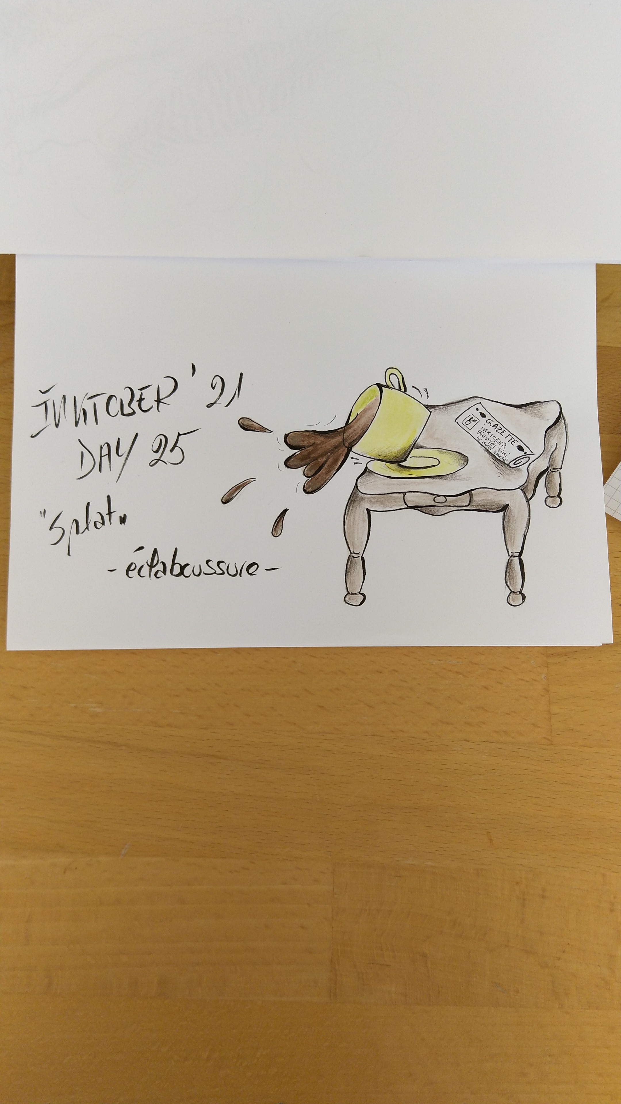 Mince, j'espère que ça se passera bien la fin des travaux, courage 💪 On entre dans la dernière semaine de l'Inktober. Elle est pas mal cette tasse à café, un style un peu cartoon c'est sympa.