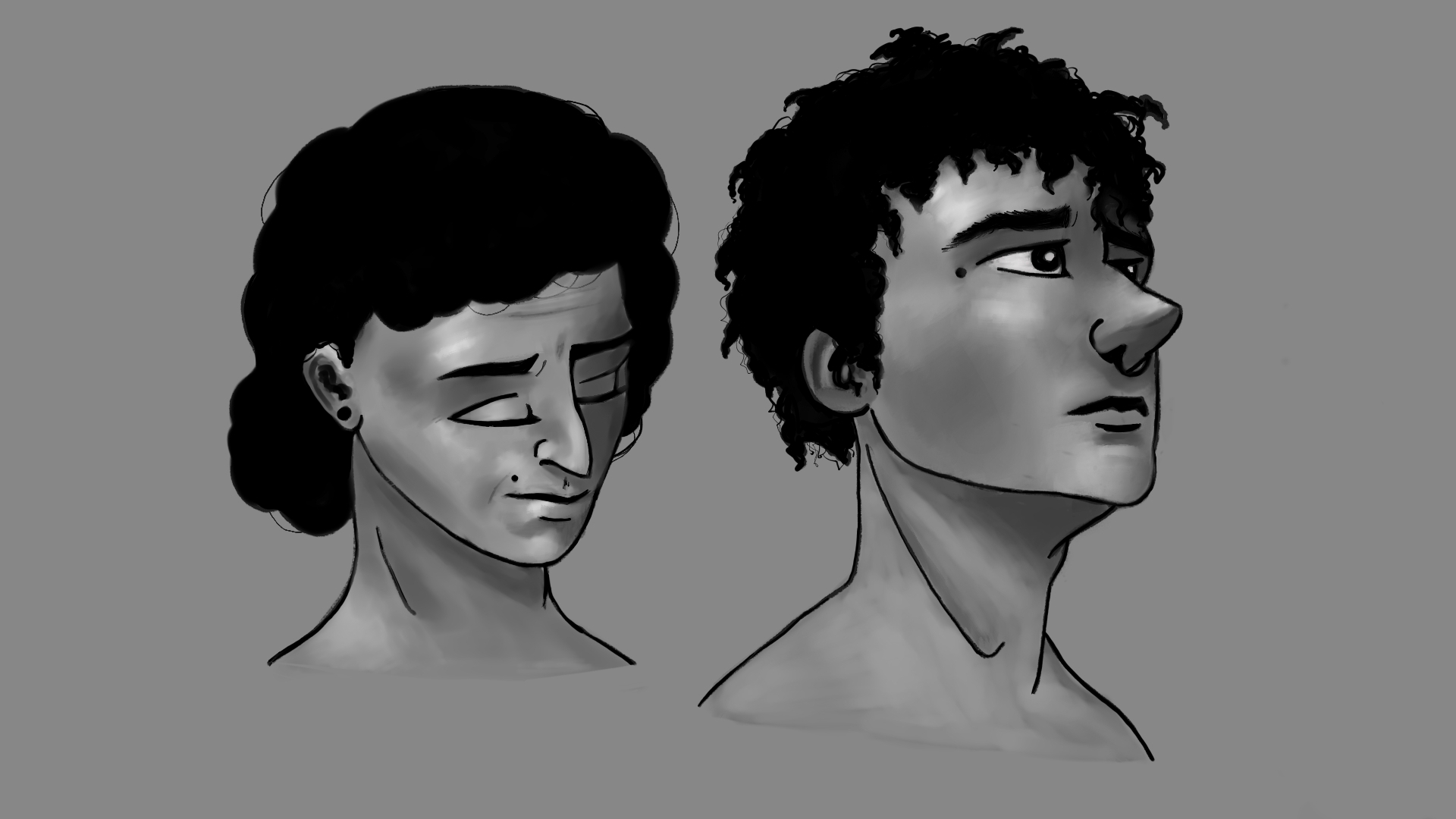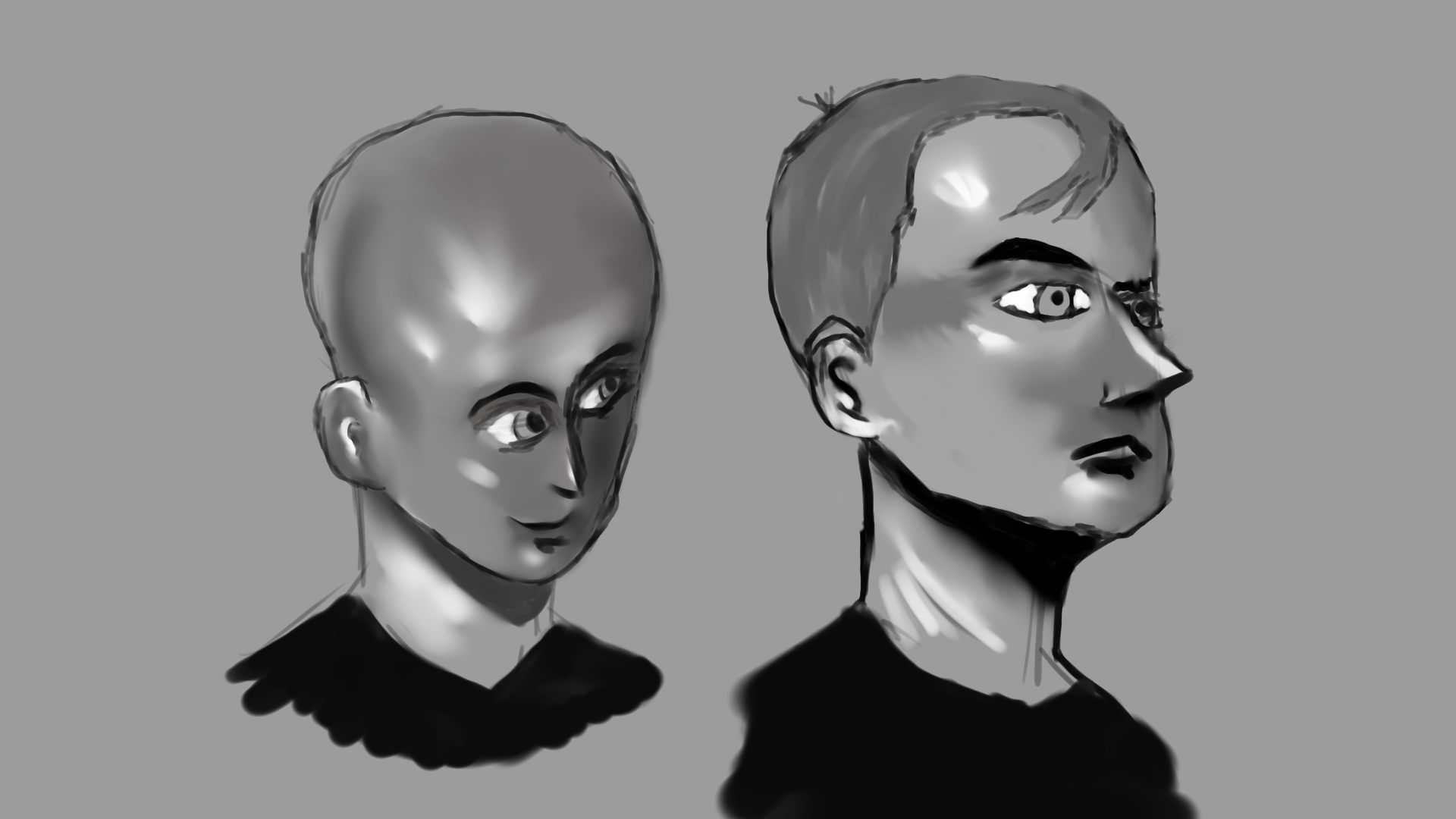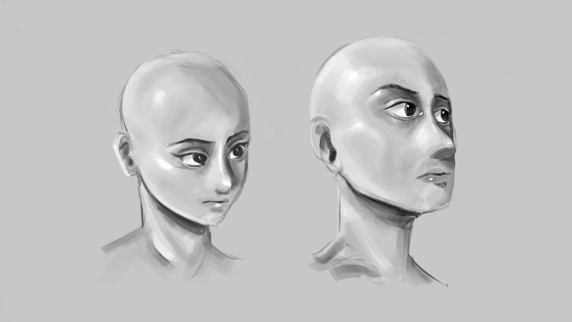 Maintenant pour la mise en lumière, les volumes sont bien placés, mais attention, les contrastes font presque métalliques. vu l'angle de la lumière, presque toute la moitié gauche des visages devrait être dans des tons clairs presque uniformes, sauf sous les arcades, sous le nez... n'oublies pas que la peau est un matérieau non métallique, et d'autant plus diffus que la peau est partiellement translucide. même lorsqu'il y a une brillance (quand elle est mouillée, ou grasse) ça fait surtout des reflets spéculaires, mais les zones de lumières restent quasi unies. le vrai contraste se fait avec les zones sombres, qui "regardent" à l'opposé de la source lumineuse.