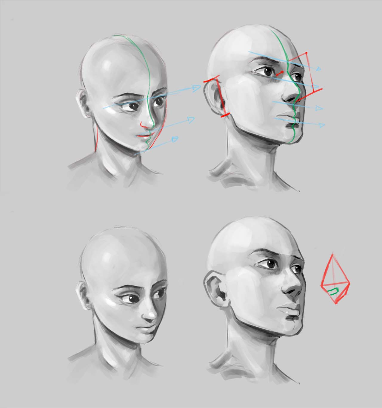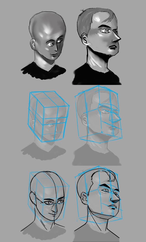il doit toujours avoir la place pour un oeil entre les deux yeux. Il s'agit du même exercice que le crayonné ou les proportions du visage, mais sur une boite en volume au lieu d'un plan en 2D, et il faut construire les proportions avec des repères avant de dessiner les détails.