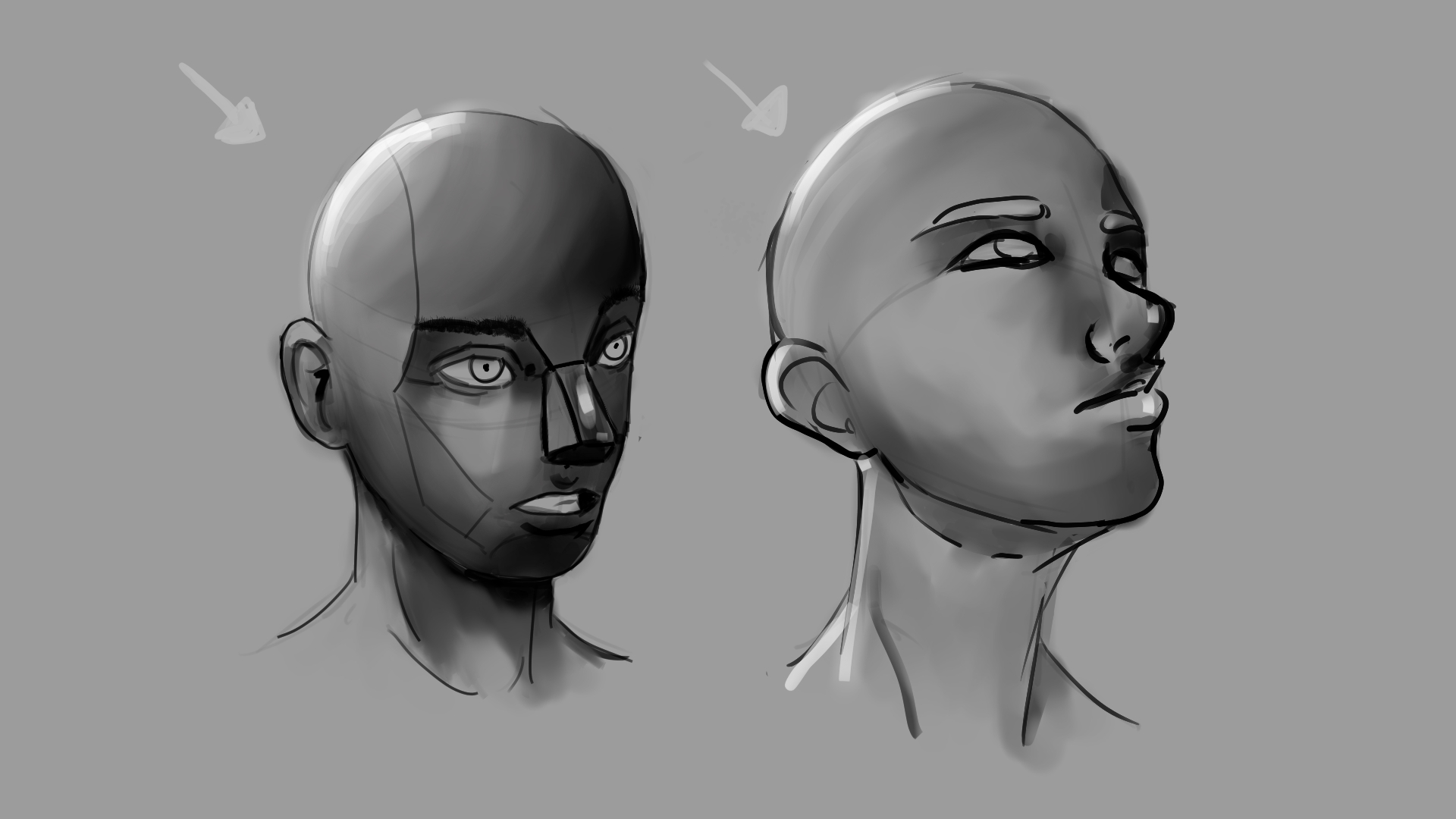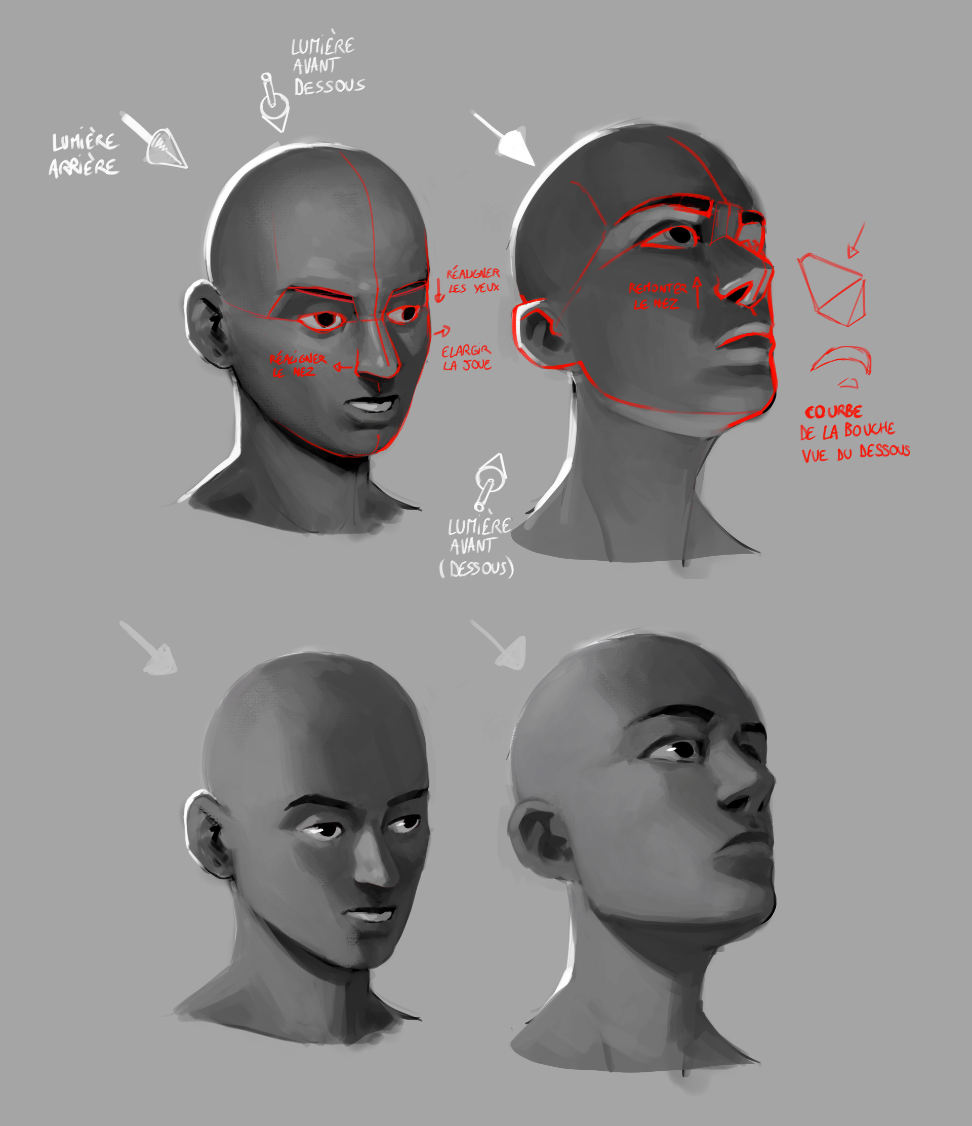 pour t'aider avec ça, penses bien à tracer la ligne médiane du visage. elle t'aidera à gérer, sur le premier des deux portraits, la largeur de la pomette vers la droite, et ne placement du nez. en effect, la moitié droite du premier visage est trop petite pour placer l'oeil, élargir la pomette et ramener le nez vers la gauche, mieux centré au dessus de la bouche et du menton, laisse plus de place pour dessiner l'oeil correctement. Il faut aussi descendre un peu l'oeil en question, et le rendre moins incliné, pour suivre la perspective qui construit le reste du visage. Concernant la lumière, le liseré sur l'arrière du crane m'indique que tu souhaites faire un éclairage à contre-jour. si c'est le cas, les détails du visage ne seront pas éclairé par cette lumière derrière le sujet, mais par de la lumière ambiante ou une autre source de lumière devant le sujet, qui va faire ressortir les volumes du visage. Il est aussi possible que tu voulais juste faire une lumière latérale ( la version du dessous dans mon corrigé) à ce moment là, il ne devrait pas y avoir de liseré, mais mais une lumière relativement constante sur tous les plans du visages qui sont dirigés vers la gauche: le côté de la boite cranienne, le côlté du nez, le côté de la pomette det de la joue, alors que l'avant du visage serait relativement plus ombragé.