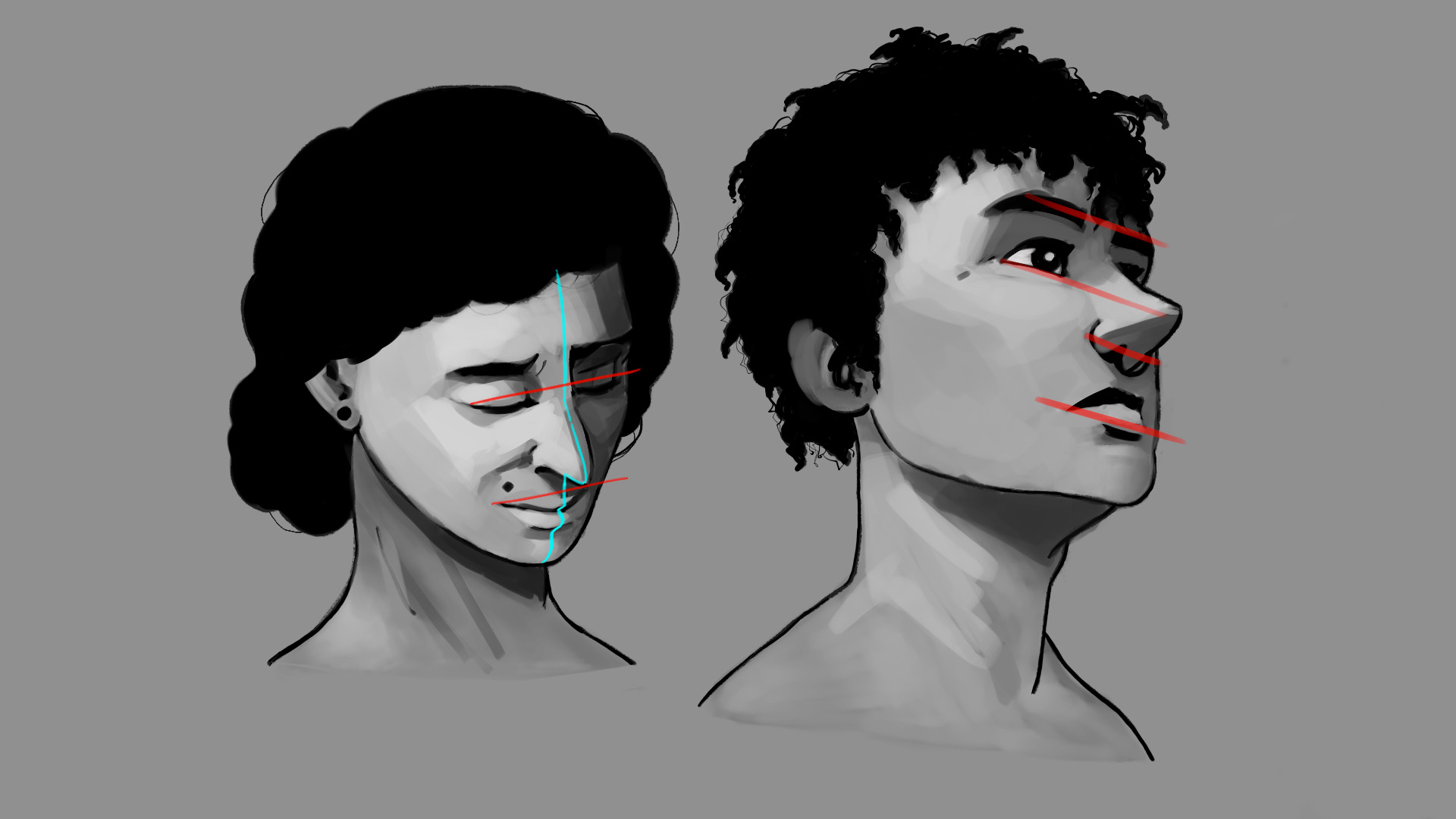 En revanche tu as des difficultés avec l'angle de vue. je te recommandes donc de tracer tes lignes de fuites lorsque tu commences à construire le visage, afin d'orienter les différents volumes du visage. tu peux également utiliser la ligne médiane pour suivre les parties du visages plus ou mons profondes ou plus ou moins en avant. Par exemple, le menton du personnage féminin est légèrement en retrait par rapport à là ou on l'attendraitt, vu comment les yeux, le nez et la bouche sont placés.