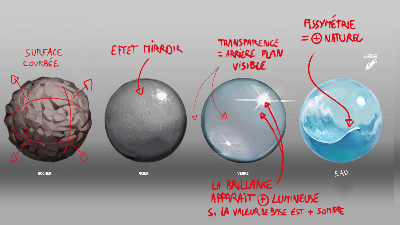 Pour l'acier, même s'il est relativement mat et sombre, tu devrais avoir une luminosité plus proche de l'environnement qu'il reflète, car les matériaux métalliques agissent comme des mirroirs. C'est aussi pour ça que je te recommande de peindre un reflet spéculaire plus intense. N'hésite pas à peidre des imperfections en surface, comme un effet brossé ou rayé, afin de rendre le matériau plus riche en détail. le reflet du bas a une teinte bleu-violette, et c'est bien joué: ce genre de touches de couleurs subtiles peuvent vraiment approrter de la richesse à tes futures peintures.