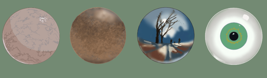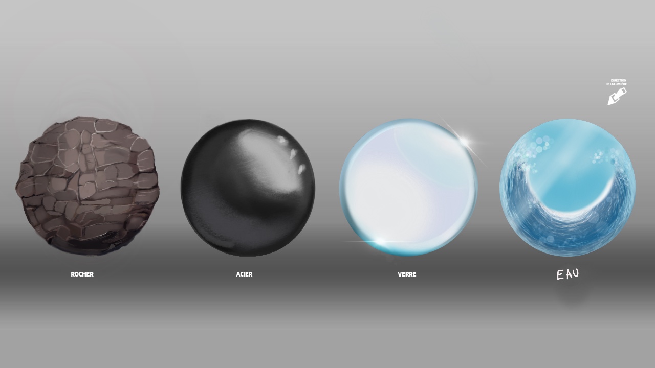 Comme tu n'avais pas préciser les matière que tu souhaitais retranscrire je suis partie de mes suppositions. Le principal problème communs à toutes les matières c'est le manque de volume général des sphères, n'hesitenpas a bien appliqué ce que tu as vu à l'exercice qui expliquais comment les dessine.Tu verss, bien retransmettre le volume va considérablement augmenter la qualité de tes rendus :)