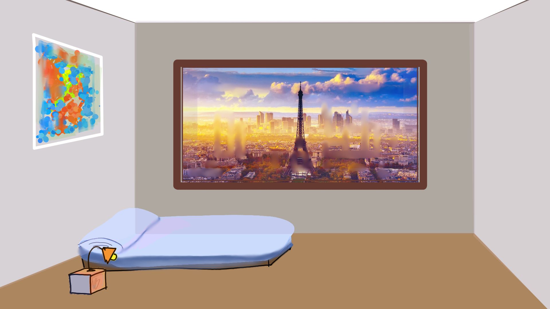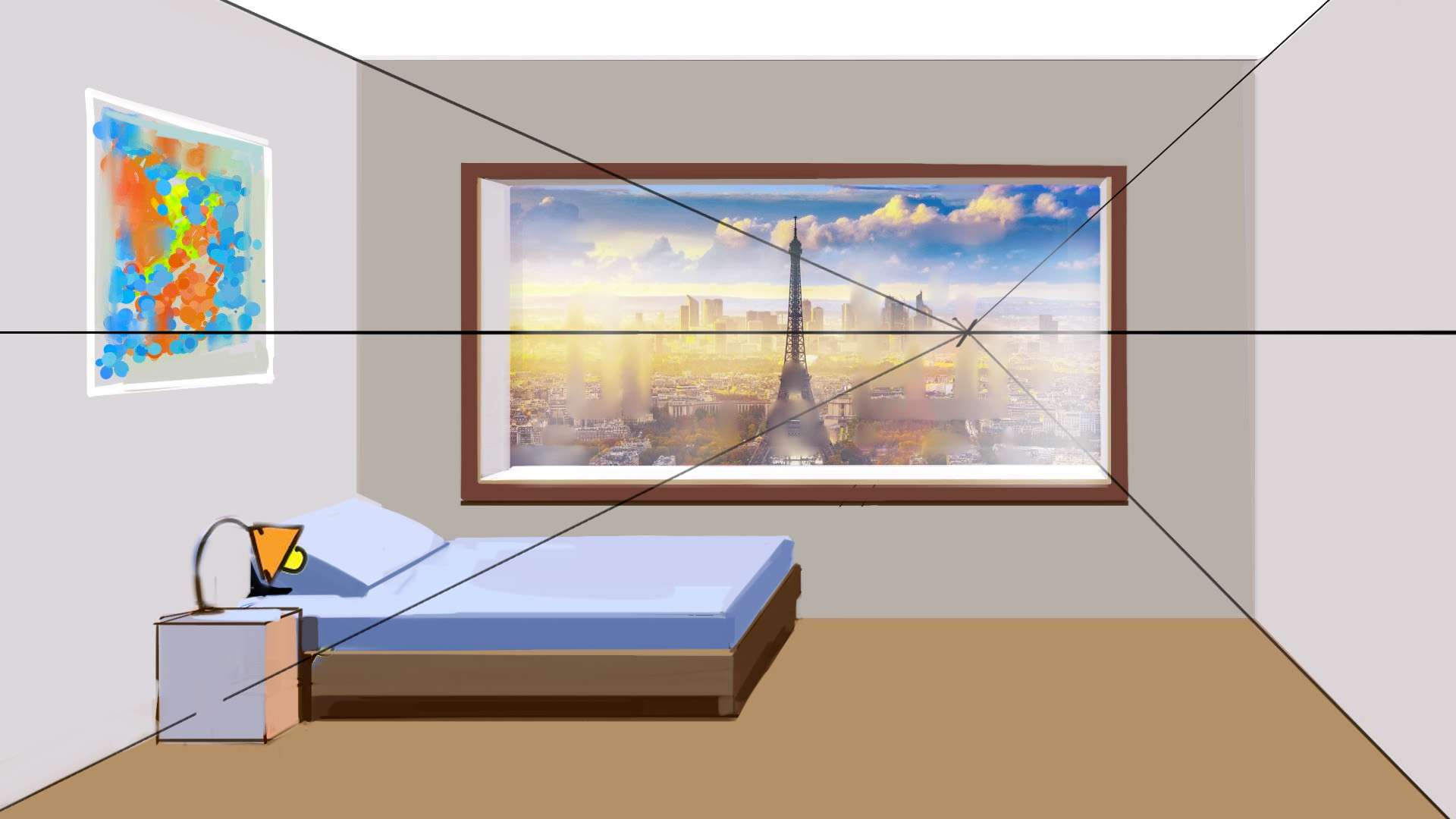 En terme de construction du décor, fais attention à la taille des objets les uns par rapport aux autres, afin de créer un décor cohérent. Par exemple, sommier et pieds du lit sont tellent bas que l'on a l'impression qu'il s'agit d'un matelas posé directement par terre, et la table de nuit est tout aussi sous dimensionée. C'esy pour ça que je recommande de dessiner à l'instinct et corriger la perspective ensuite: paradoxalement, il est difficile de penser à la cohérece de l'espace lorsqu'on se concentre sur dessiner une perspective juste.