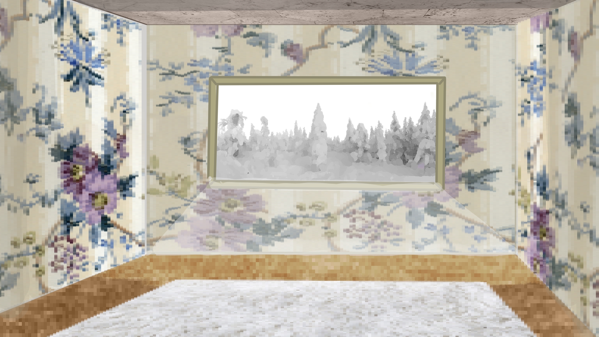 J'ai réussit à trouver l'outil "transformer" et "perspective" pour pouvoir bien intégrer chaque motif dans la maison. J'ai téléchargé plusieurs motifs différents : paysage enneigé, papier peint floral, moquette et tapis que j'ai essayé de combiner harmonieusement dans les tons.
