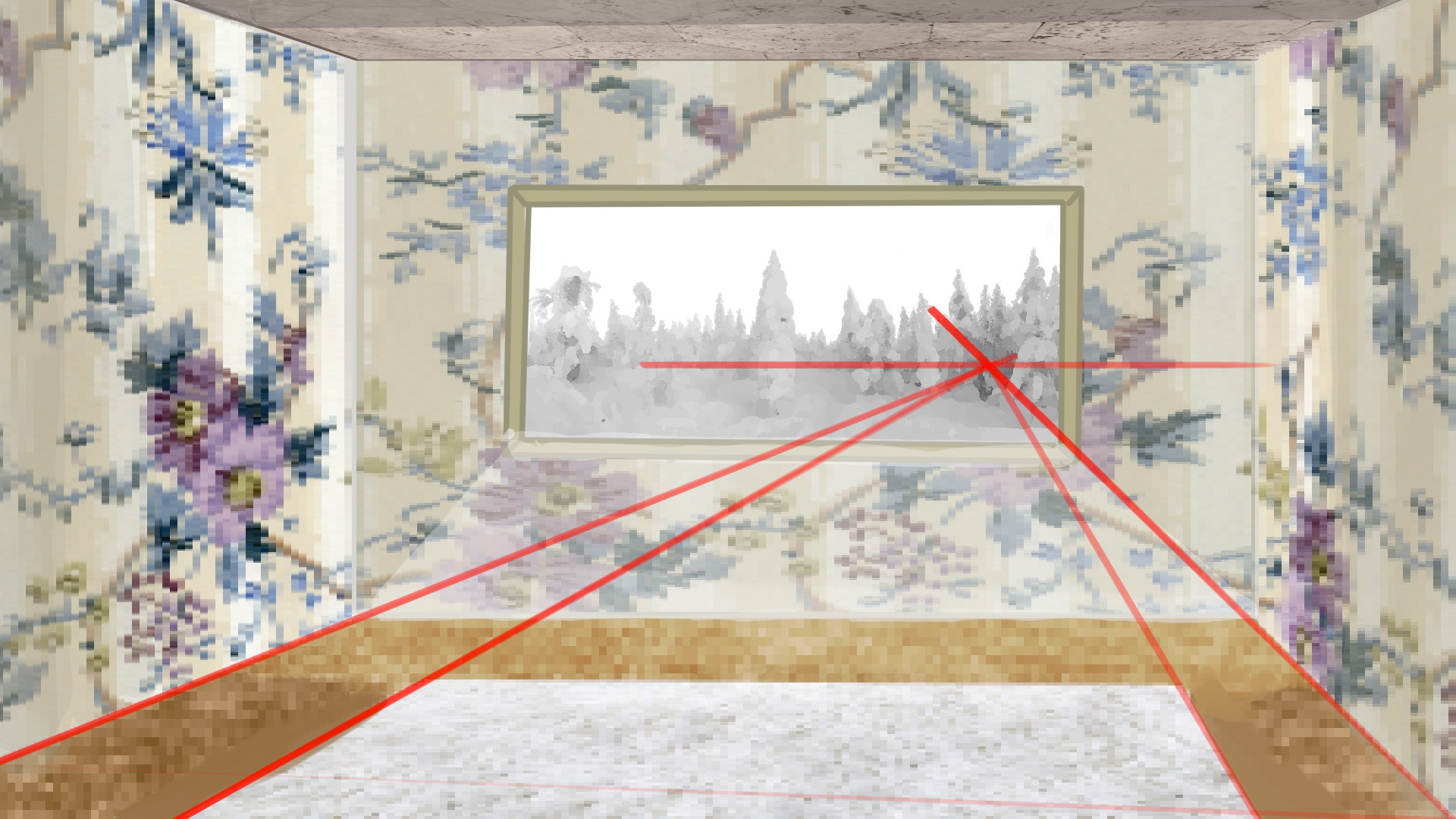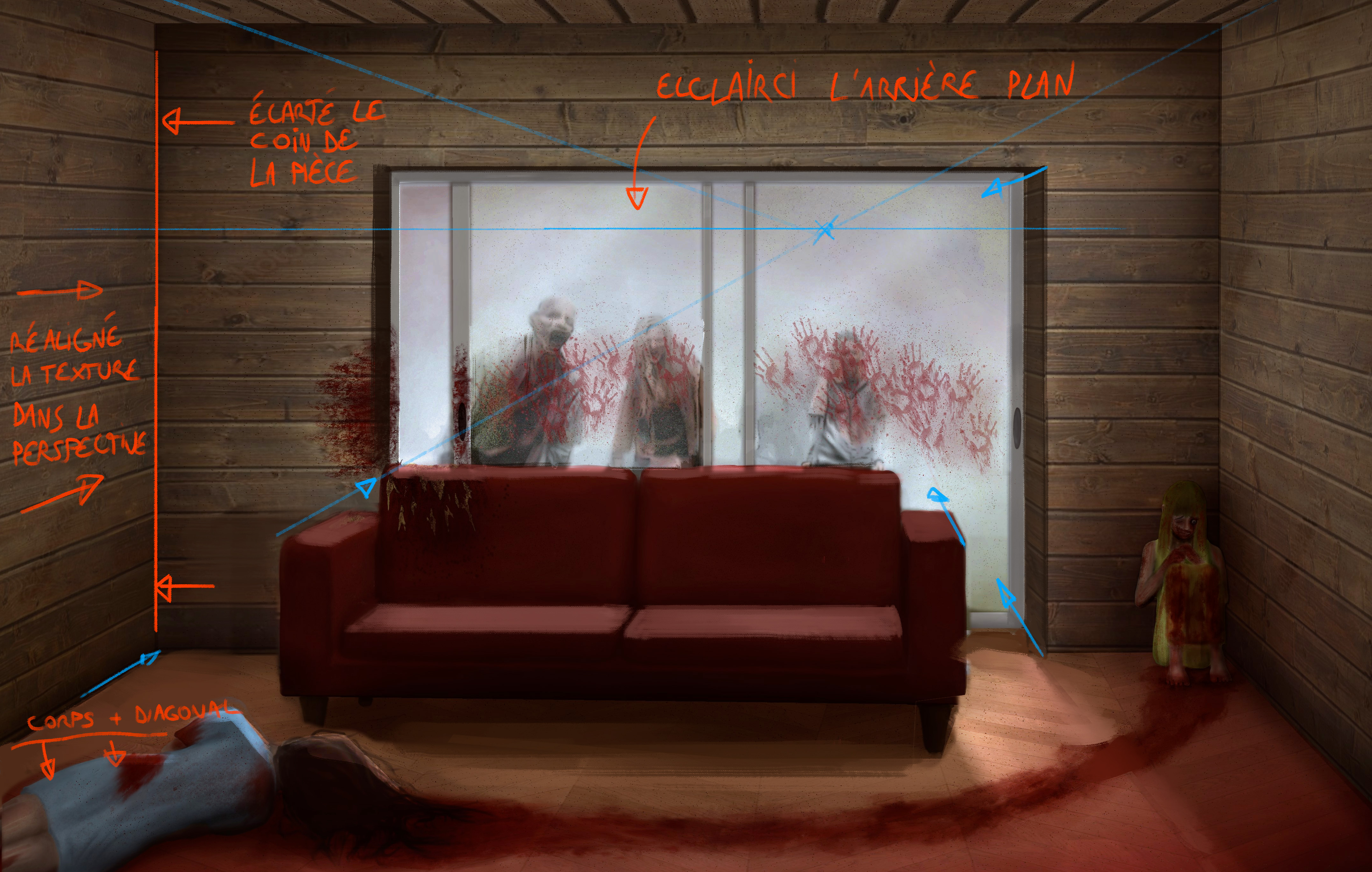 La perspective ne fonctionne pas parfaitement (le mur de gauche ne s'aligne pas sur le même point de fuite que celui de droite, et le sol ne s'aligne pas tout à fait non plus) mais le travail est suffisemment bien fait pour qu'on ne le remarque pas dès le premier coup d'oeil; tu peux retracer ta ligne d'horizon, place ton point de fuite et essaye de réaligner les textures. Pour ma part j'ai aussi décalé le coin de la pièce plus à gauche, pour laisser de la place au corps qui se trouve aux environs. Je te conseille aussi de penser à la profondeur du mur et de l'embrasure de fenêtre: le fait que la porte fenêtre aie l'ai plate vient de là.