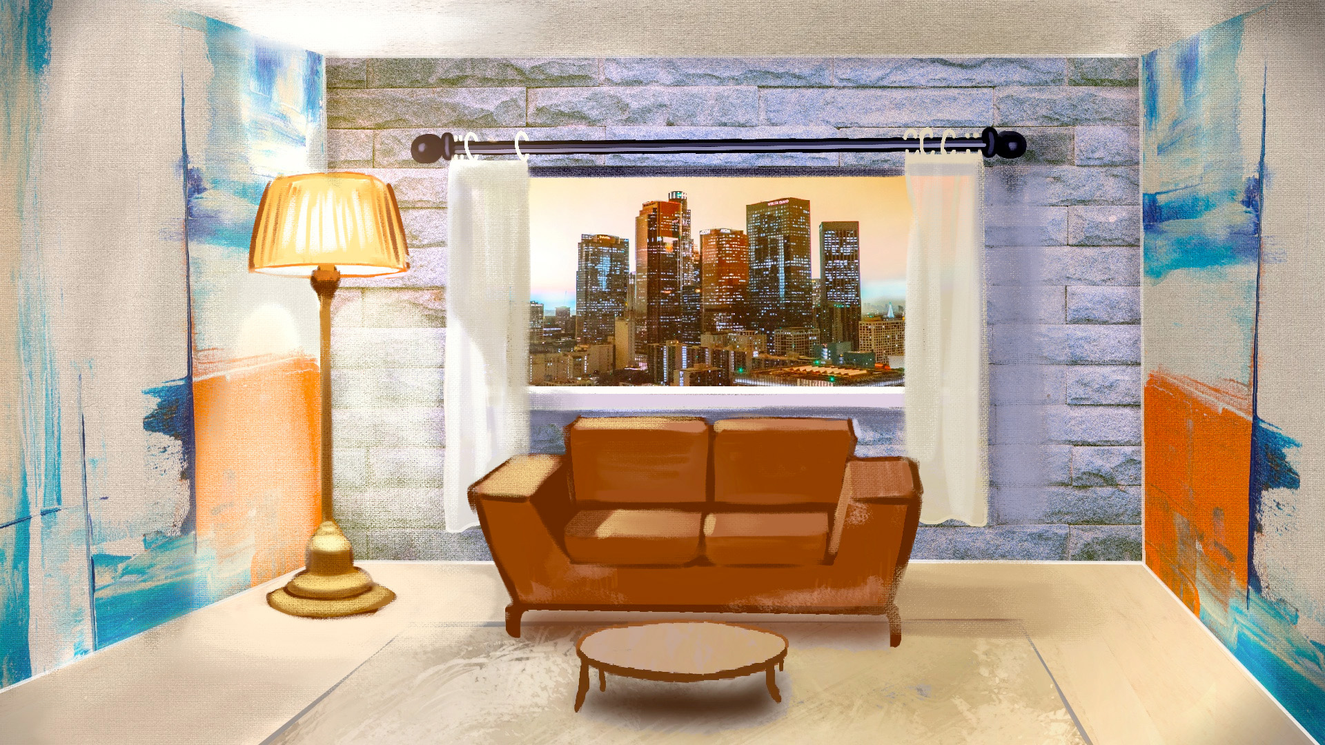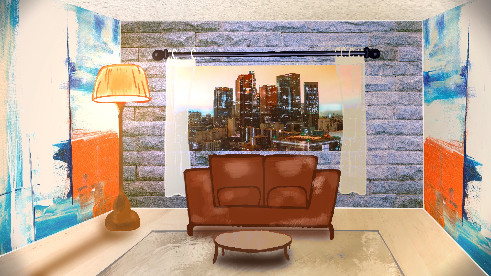 globalement c'est bien, la pesrpective fonctionne et les textures sont intégrées dedans. Quelques suggestions: la stylisation du canapé est très chouette dans ce style aplati, mais rien ne t'empêche de la mettre dans la perspective. pareil pour les bordures de la fenêtre.