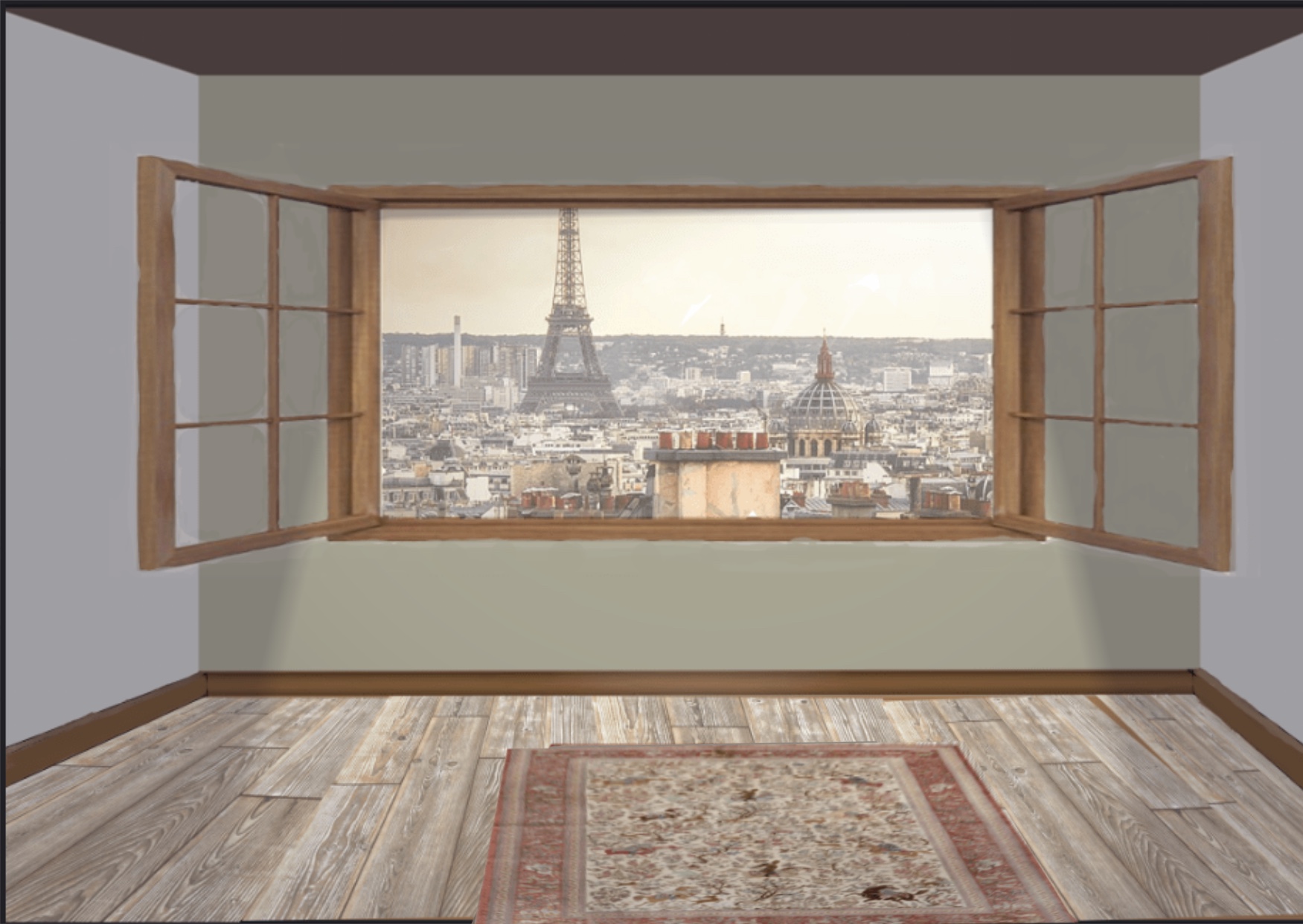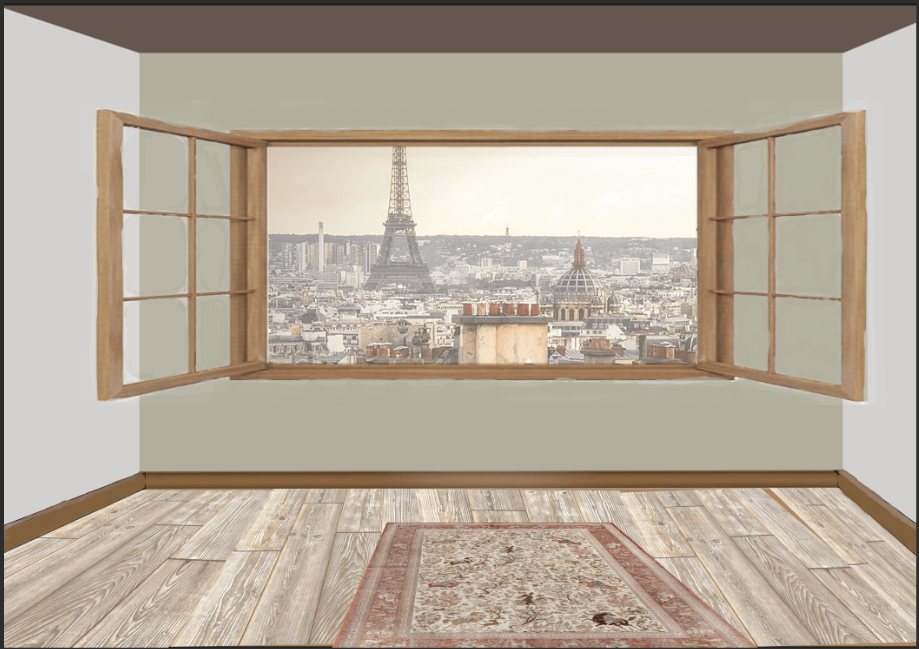 Salut! cool que tu aies pu expérimenter! Attention, pour le tapis, ce n'est pas parce que les bords du tapis sont parallèles au mur dans la réalité (3d) que une fois projeté en 2D ils le restent: elles sonvergent vers le même point de fuite sur la ligne d'horizon. L'autre rermarque que je ferais c'est que la luminosité de l'arrière plan est très proche de celle du mur - peut être que tu pourrais eclaircir le paysage et/ou assombrir l'intérieur pour augmenter la lisibilité. pour ce qui est des filtres, je trouve celui que tu as utilisé pour l'arrière plan plus convainquant que la pixellisation - mais encore une fois c'est cool que tu expérimentes et que tu découvres tous les outils à ta disposition - parfois une combinaison d'outils (pas très utiles quand ils sont pris à part) peut s'avérer très utiles.
