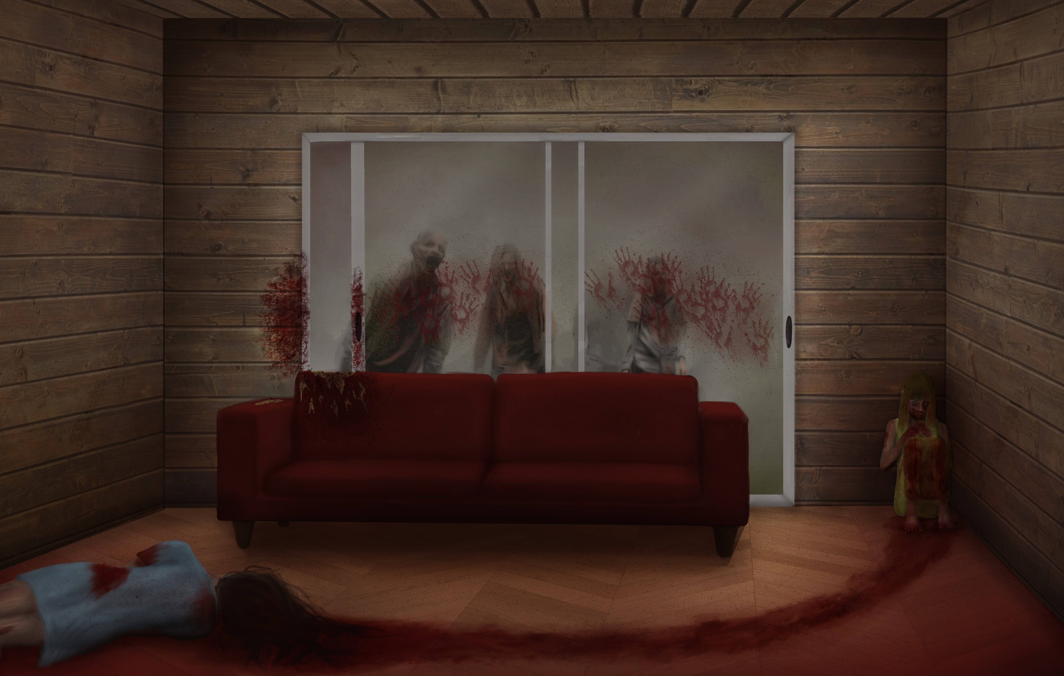 En terme de couleur et lumière, n'hésite pas à ramener des dton clairs pour créer du contraste. dans mon cas j'ai élairci le cien et les zombies, et rajouter un peu de lumière sur les accoudoirs du canapée.