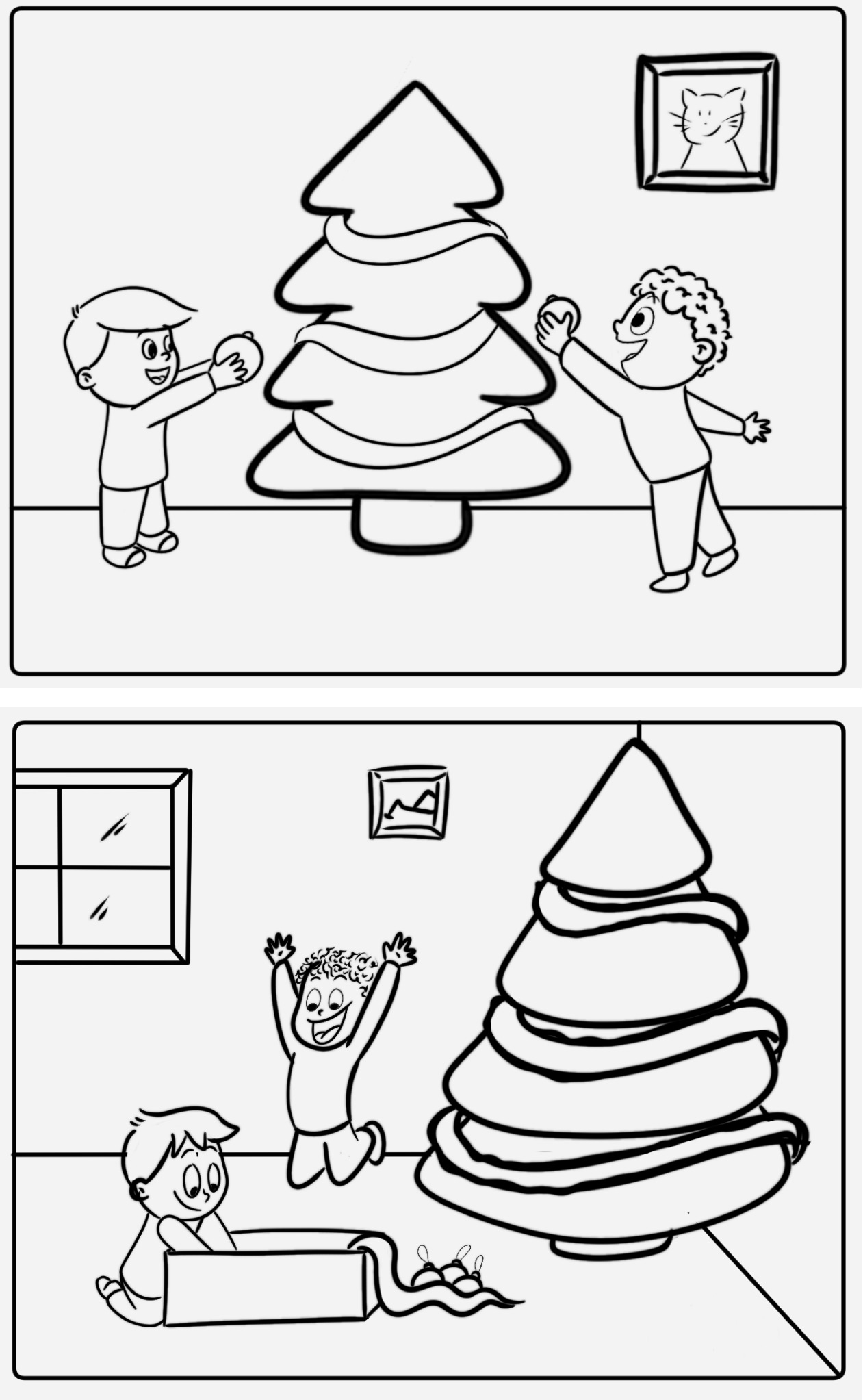 Tes dessins sont biens, ton style est chouette et agréable à regarder, mais effectivement, on ne voit pas de différence nette entre les 2 tranches d'âge. Je ne suis pas prof, mais je dirais qu'il faut encore simplifier le 1er. Par exemple, 1 simple triangle ferait l'affaire pour le sapin, ou pas besoin de doubler les bords du tableau au fond... je ne suis même pas certain qu'il faille des doigts au personnages... les illustrations pour les tout jeunes enfants sont incroyablement simples, j'ai beaucoup observé tout ça ces derniers temps, les pros ne s'embarrassent pas de détails pour ce que j'ai vu... inspire toi des pros, c'est encore le mieux... Après, c'est pas moi le prof, il faudrait les conseils avisés de Camille... j'aime beaucoup ton style en tout cas, bravo, ça le fait.