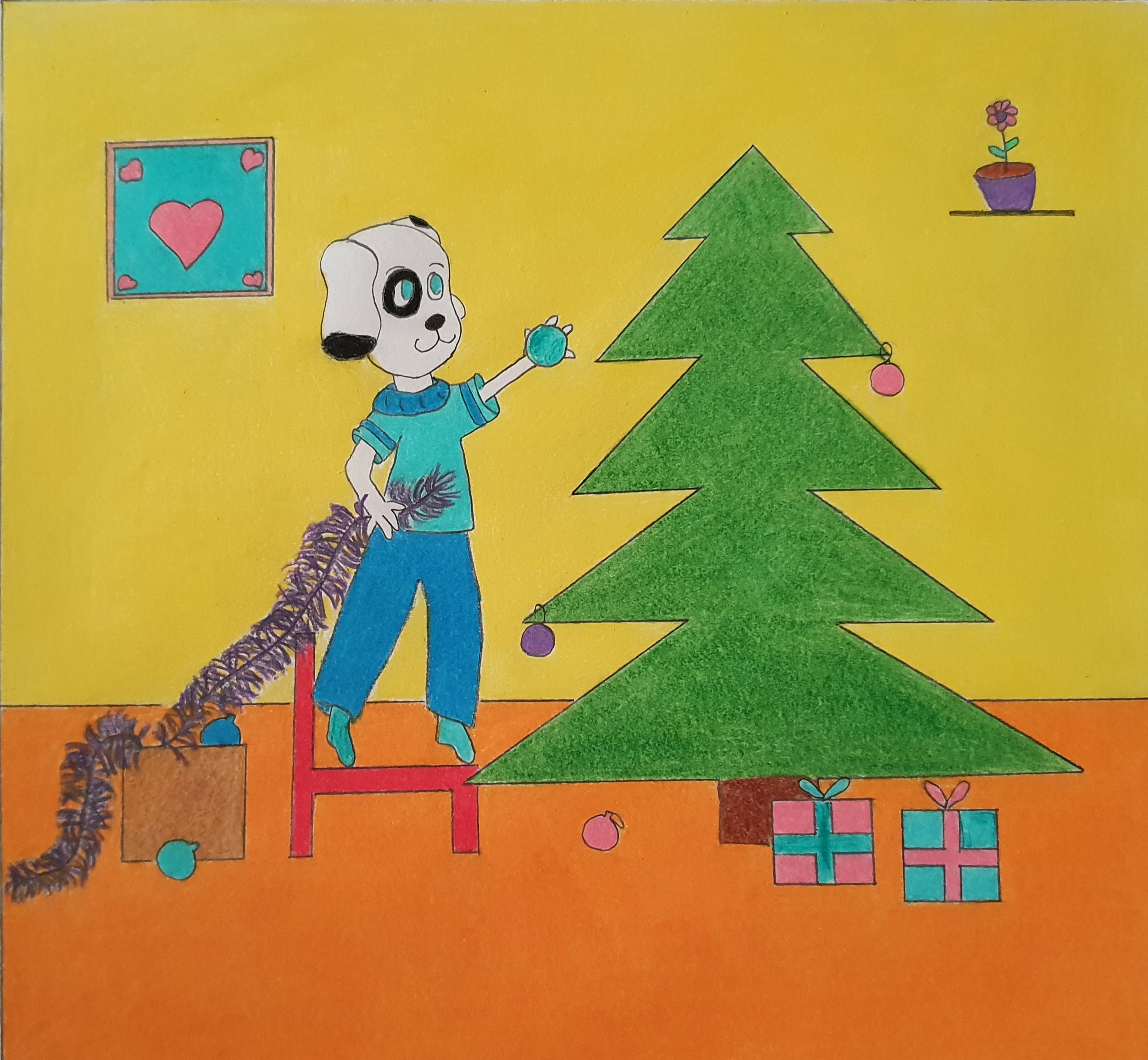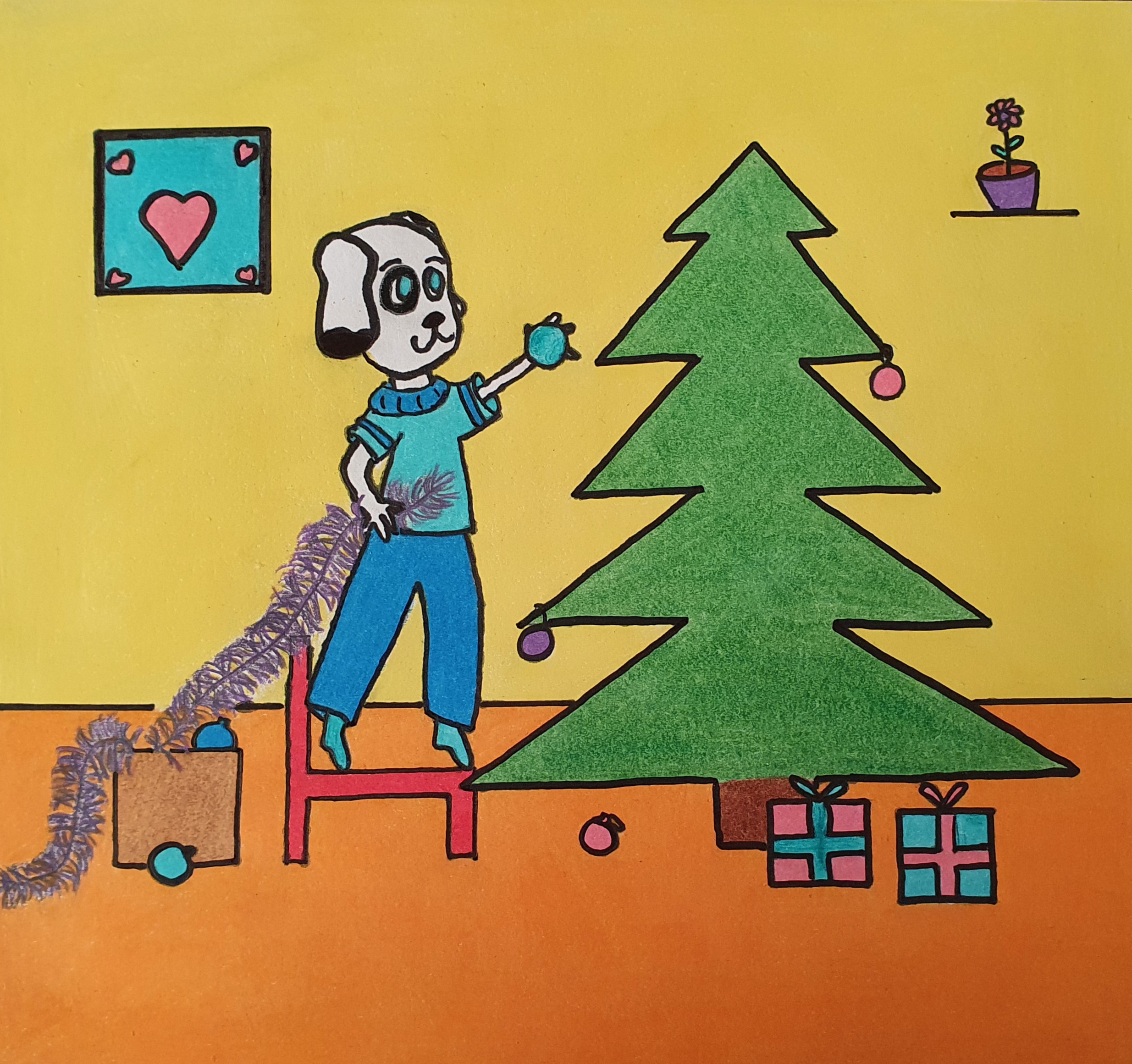 Bon je me suis rendue compte que la qualité de ma feuille n'est pas géniale et que mon feutre est absorbé par la feuille du coup ça s'étale et c'est une belle galère 😂😂 . Le remplissage est comme d'habitude aux crayons de couleurs. J'ai essayé de bien tenir compte de tes conseils en respectant vraiment la simplicité dans tous les éléments pour ne pas que ça fasse comme dans le premier dessin (j'avais trop travaillé le sol et ça perdait de sa cohérence). Donc là j'ai essayé de garder une bonne unité j'espère que c'est mieux. Mais n'hésite pas encore une fois à me dire ce qui ne va pas car chaque fois je re-travaille dessus .😊😊 je vais aussi t'envoyer le dessin sans bordure noir .