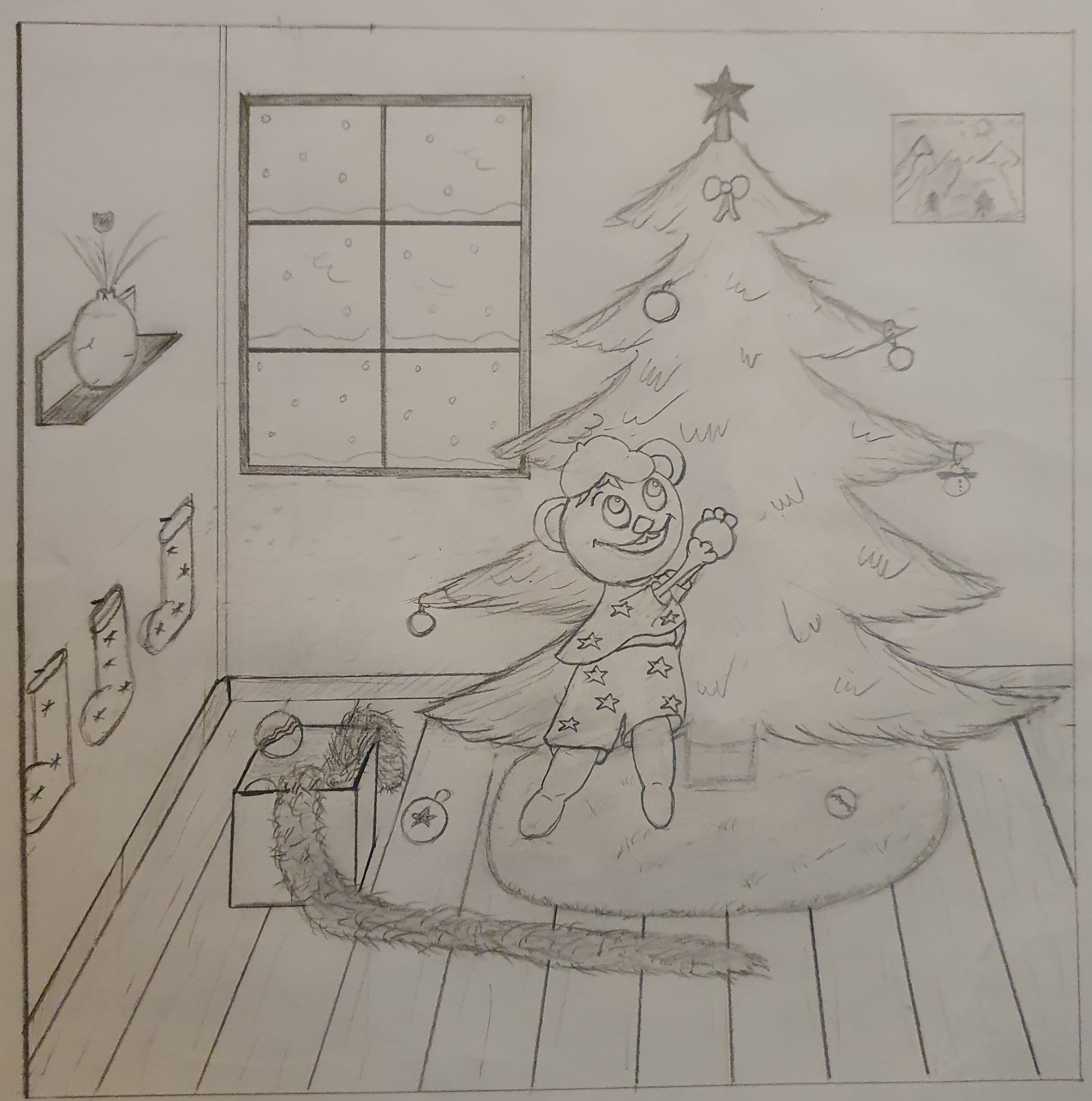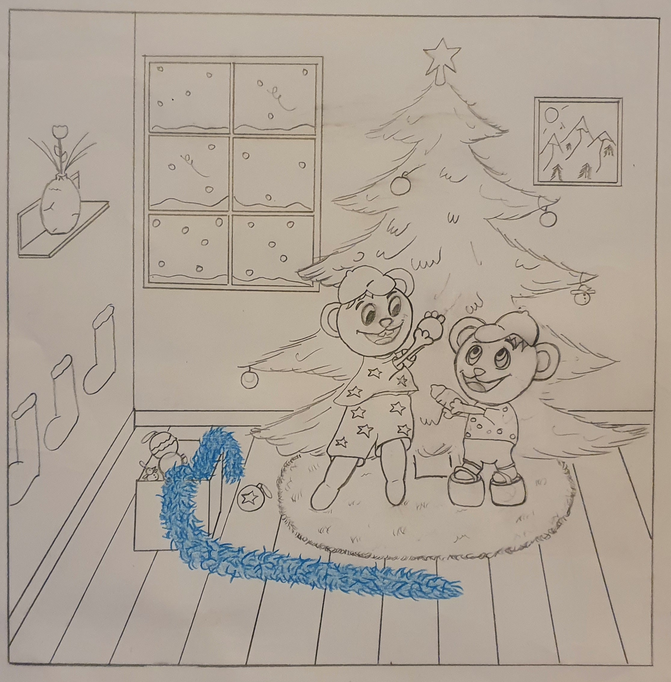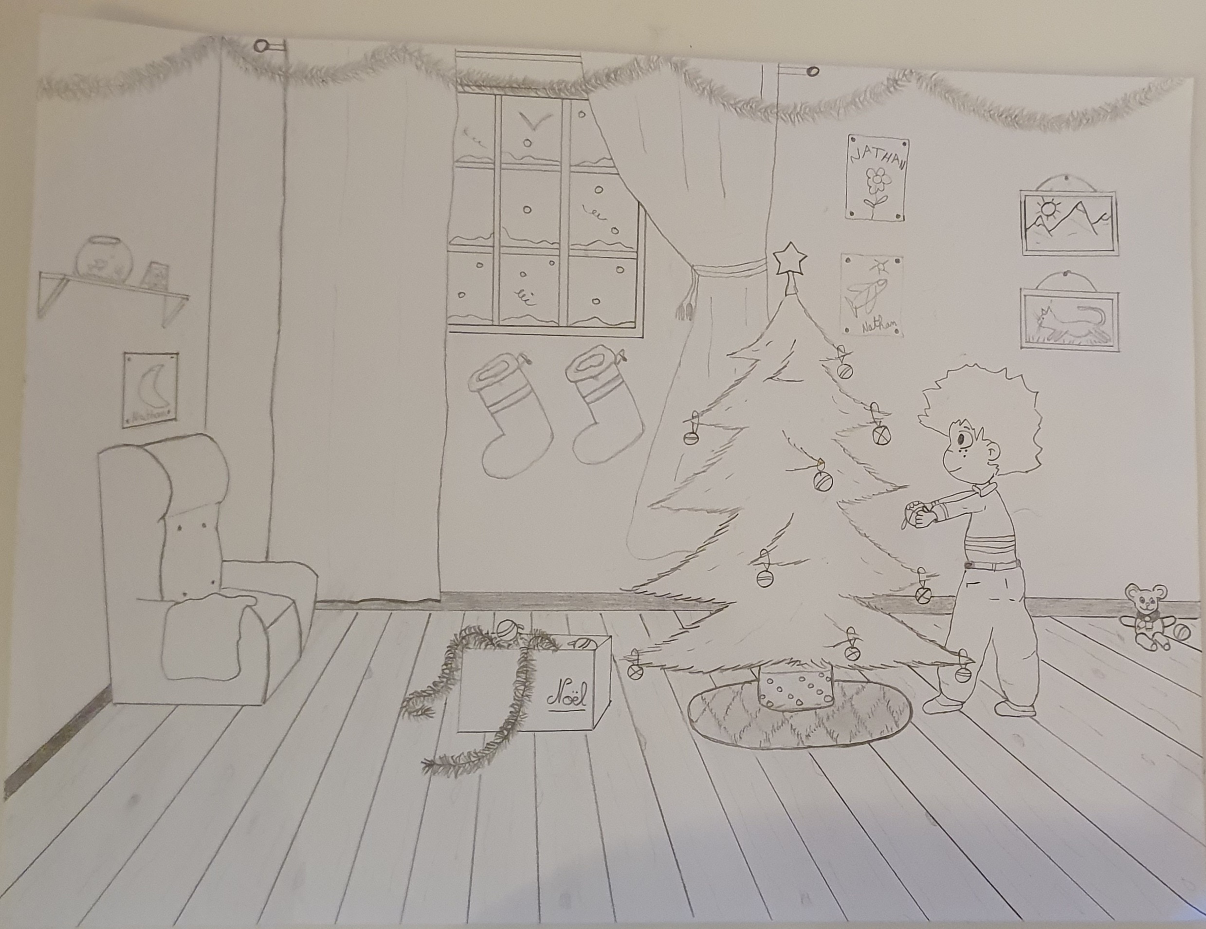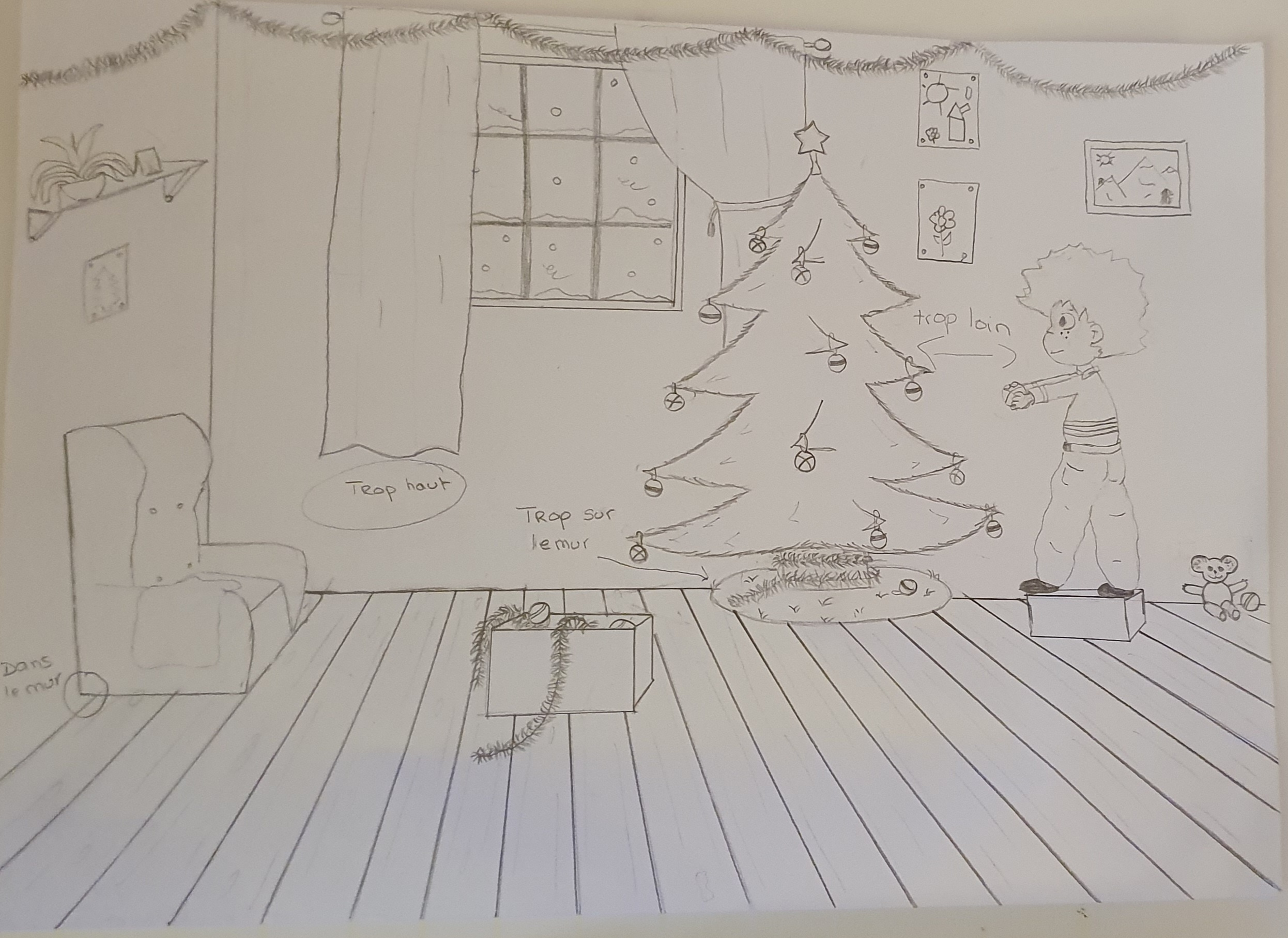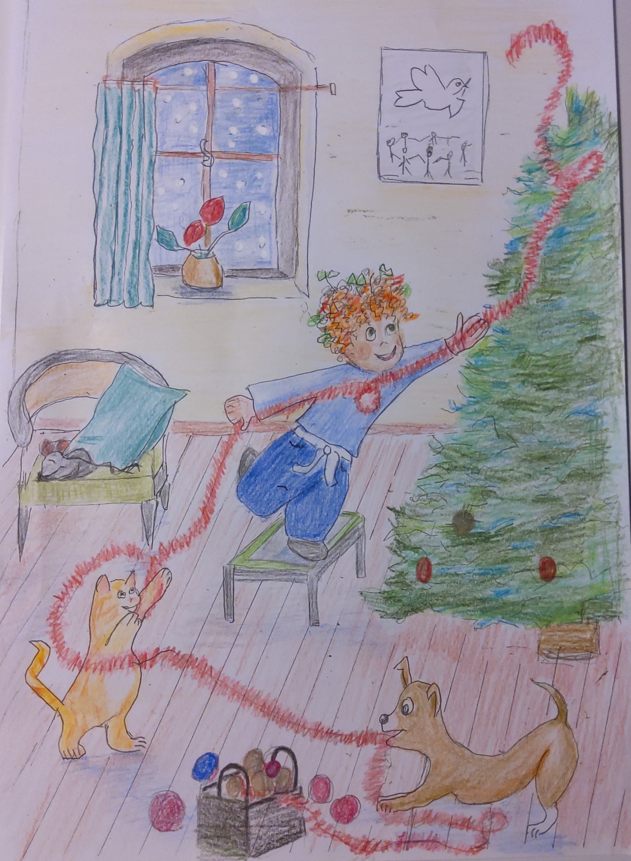 La composition de l'image est bien, le choix des couleurs aussi. Deux points importants. En revanche il va falloir travailler la technique de mise en couleur. Le choix du crayon de couleur n'est pas évident car ça laisse des marques. Il faut maintenir et assumer son choix de traitement : aplats identiques ou travail de volume et de matière. Ici, je dirais que les matières sont bien gérées (les cheveux, le sapin, les animaux, le parquet, le mur, les rideaux...) mais les vetements de l'enfant ont un traitement trop similaire, on y perd le volume et la matière. Je ne sais pas si vous voyez ce que je veux dire ? C'est comme si vous aviez pris le temps de la reflexion pour le reste et que pour les vetements de l'enfant, vous n'aviez plus envie de faire attention.