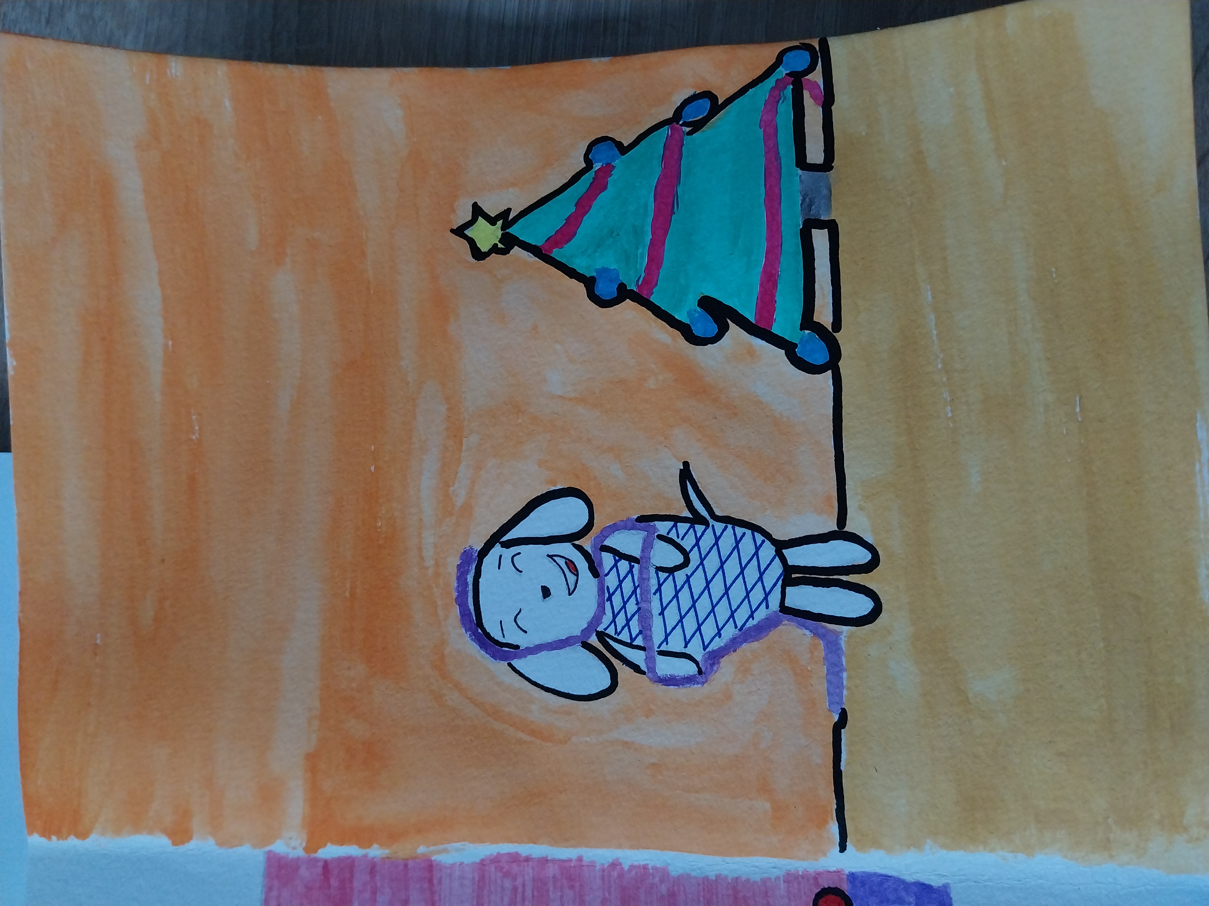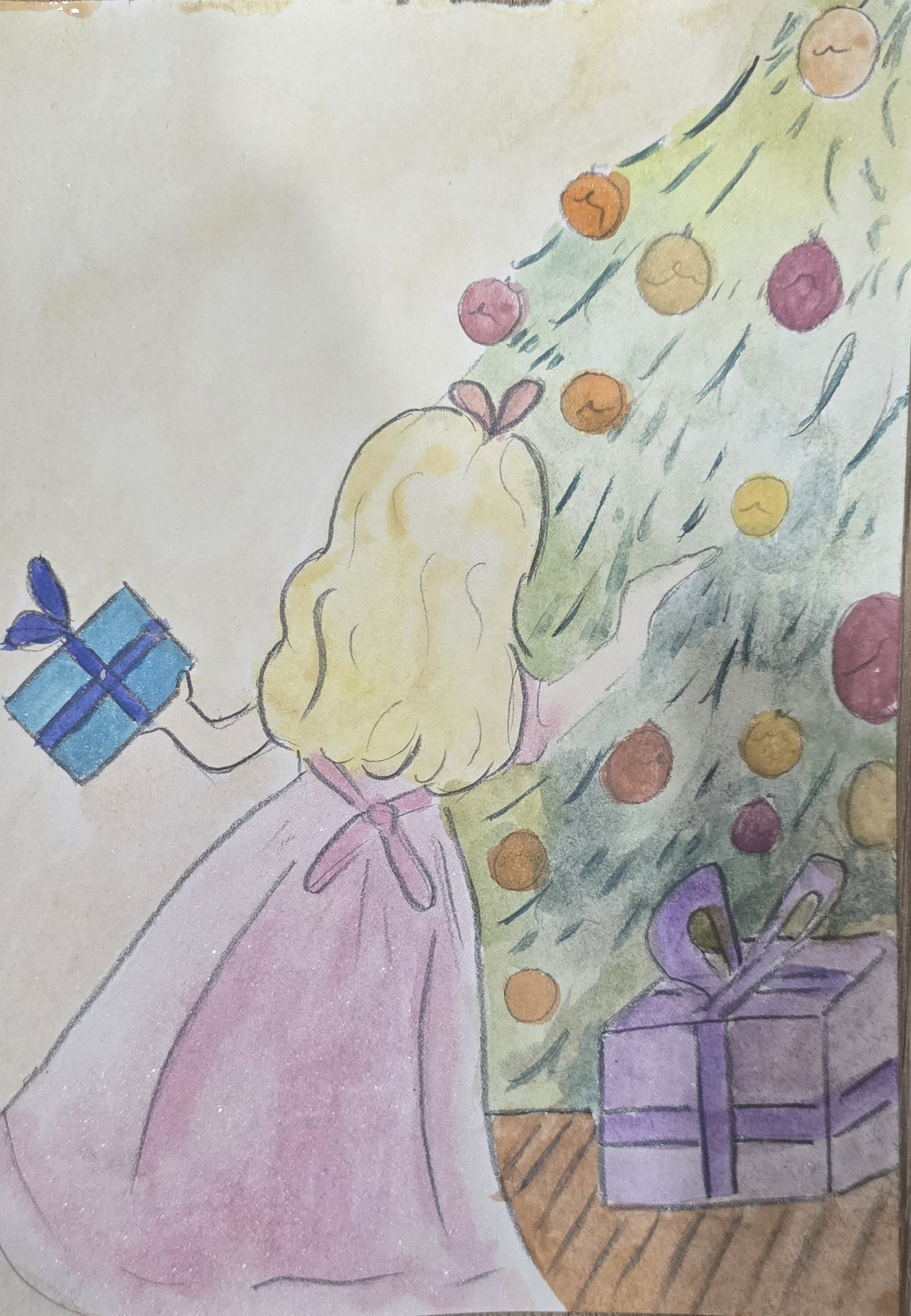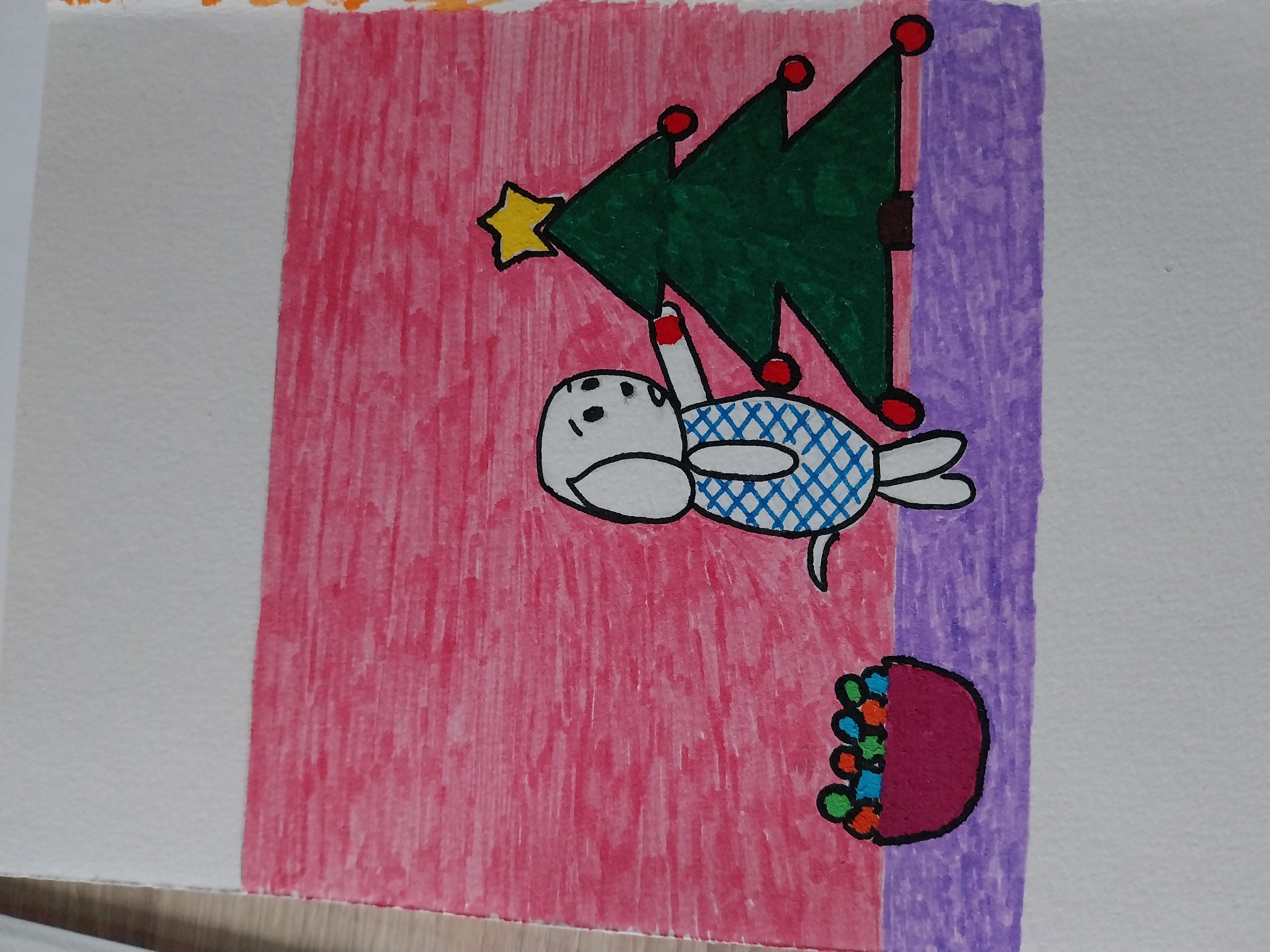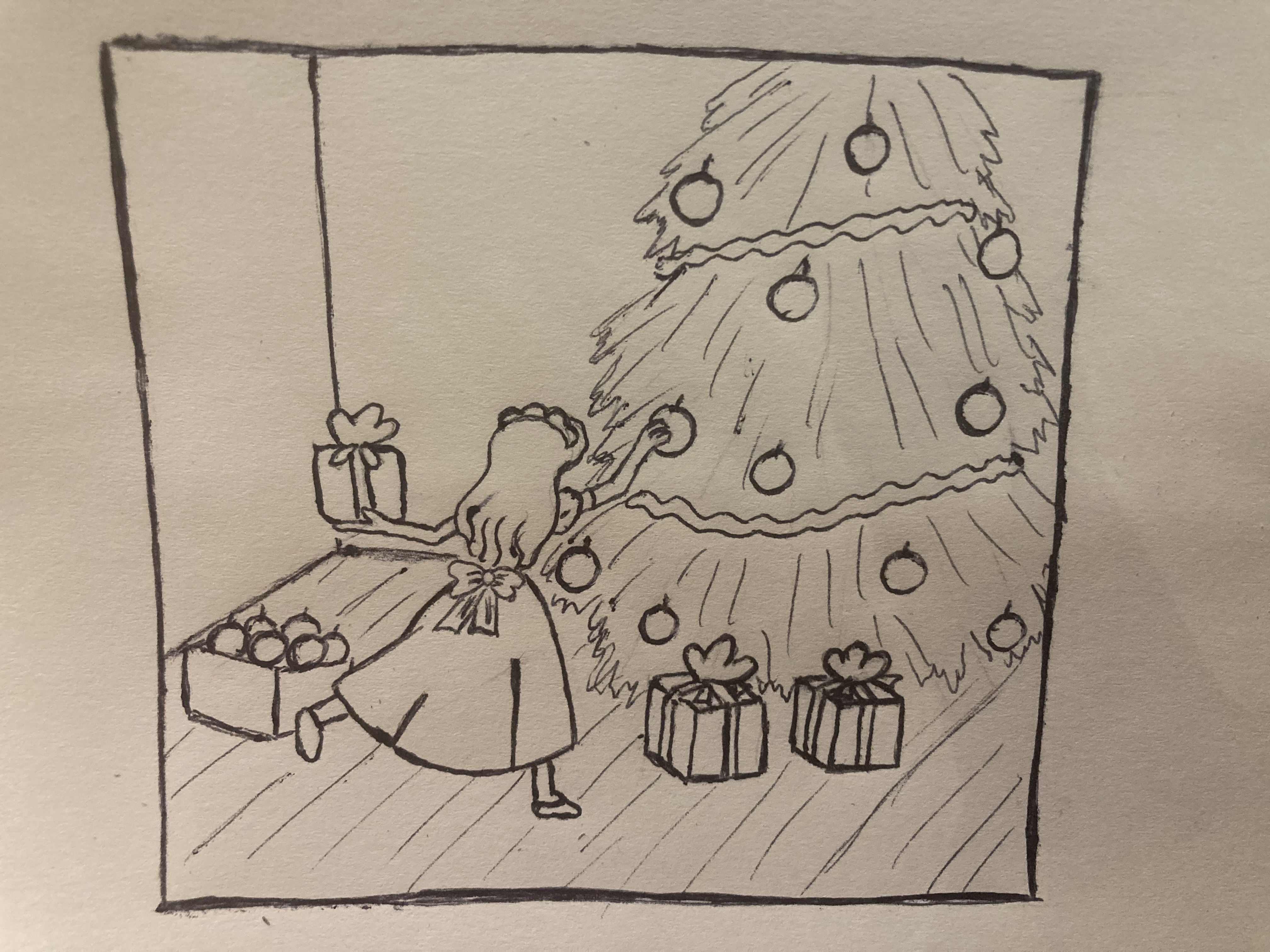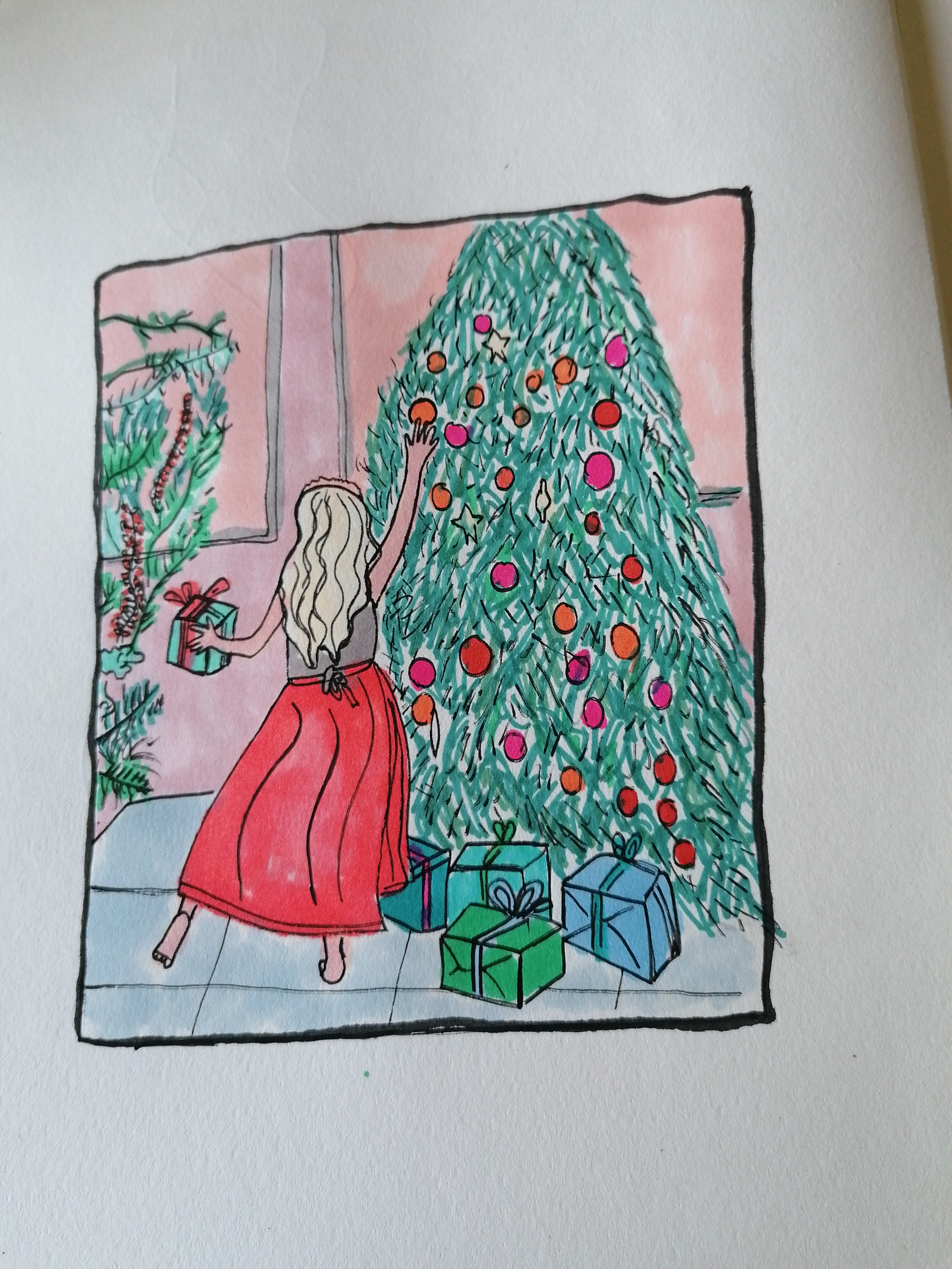 Voici mon exercice de la petite fille décorant son sapin réalisé avec un stylo bic.